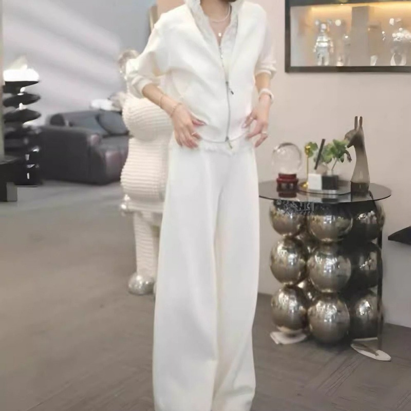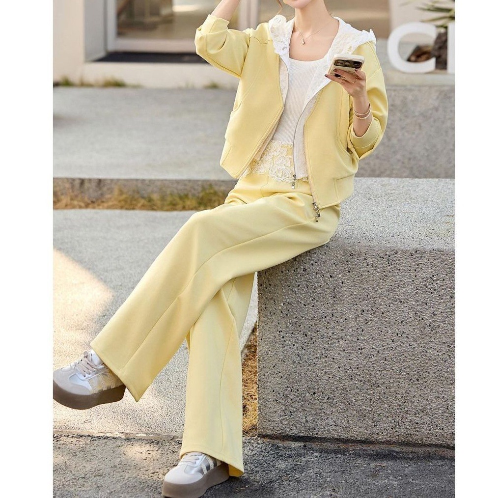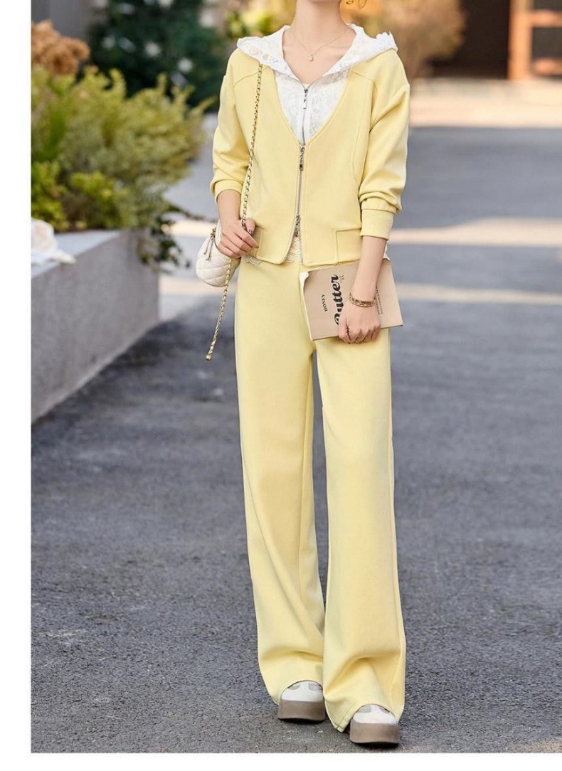 올해 인기 여성복 2025 한국판 고급 스플리싱 레이스 후드 스웨트셔츠 + 캐주얼 팬츠 투피스 세트