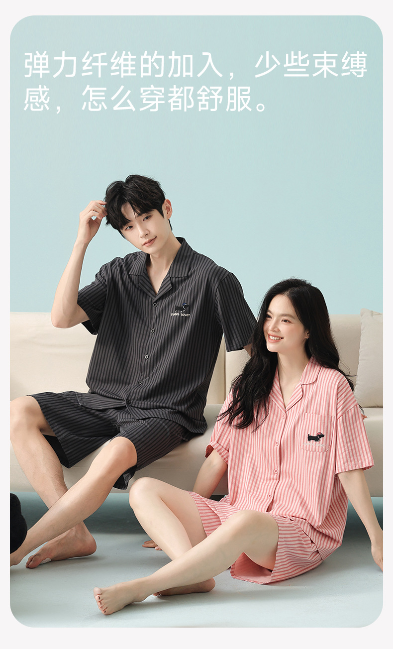 [항균 신장면] 커플 잠옷 순면 여성 봄 여름 얇은 반팔 줄무늬 남성 홈웨어 세트