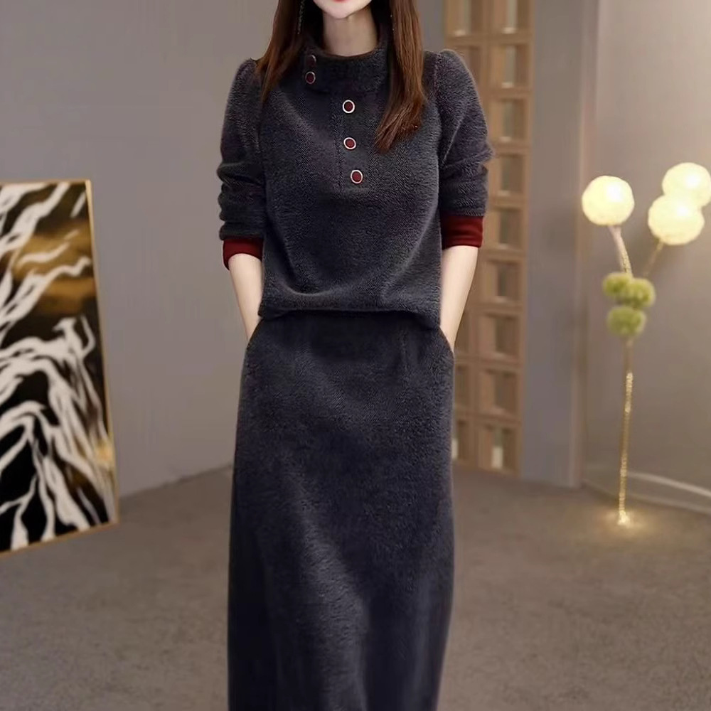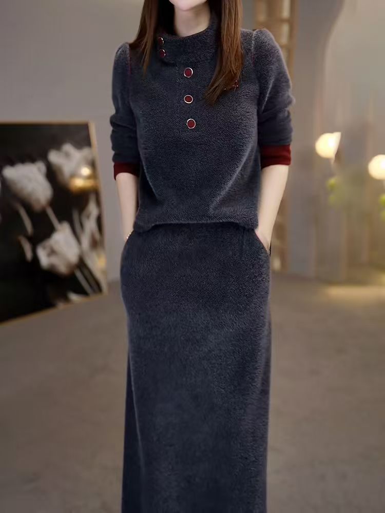 패션 여신 스타일 슈트 2025 가을 겨울 신상 라이트 럭셔리 라운드 넥 긴팔 탑 + 스커트 투피스 세트스토어 가기
