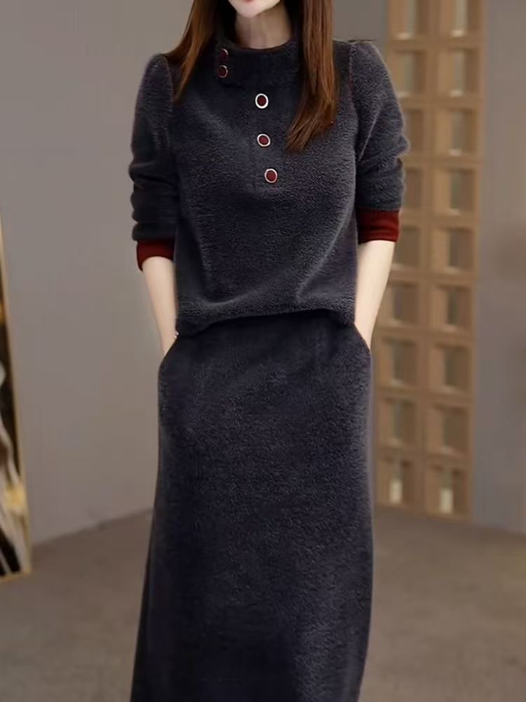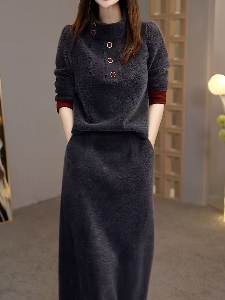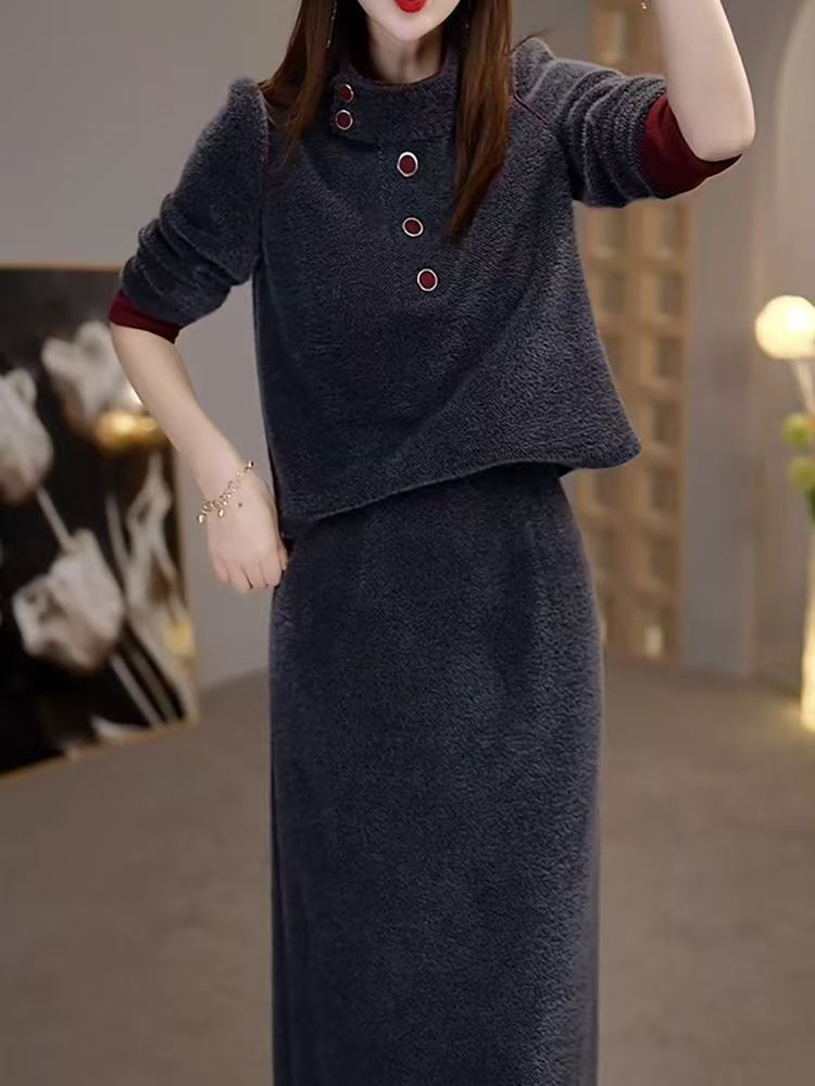 패션 여신 스타일 슈트 2025 가을 겨울 신상 라이트 럭셔리 라운드 넥 긴팔 탑 + 스커트 투피스 세트