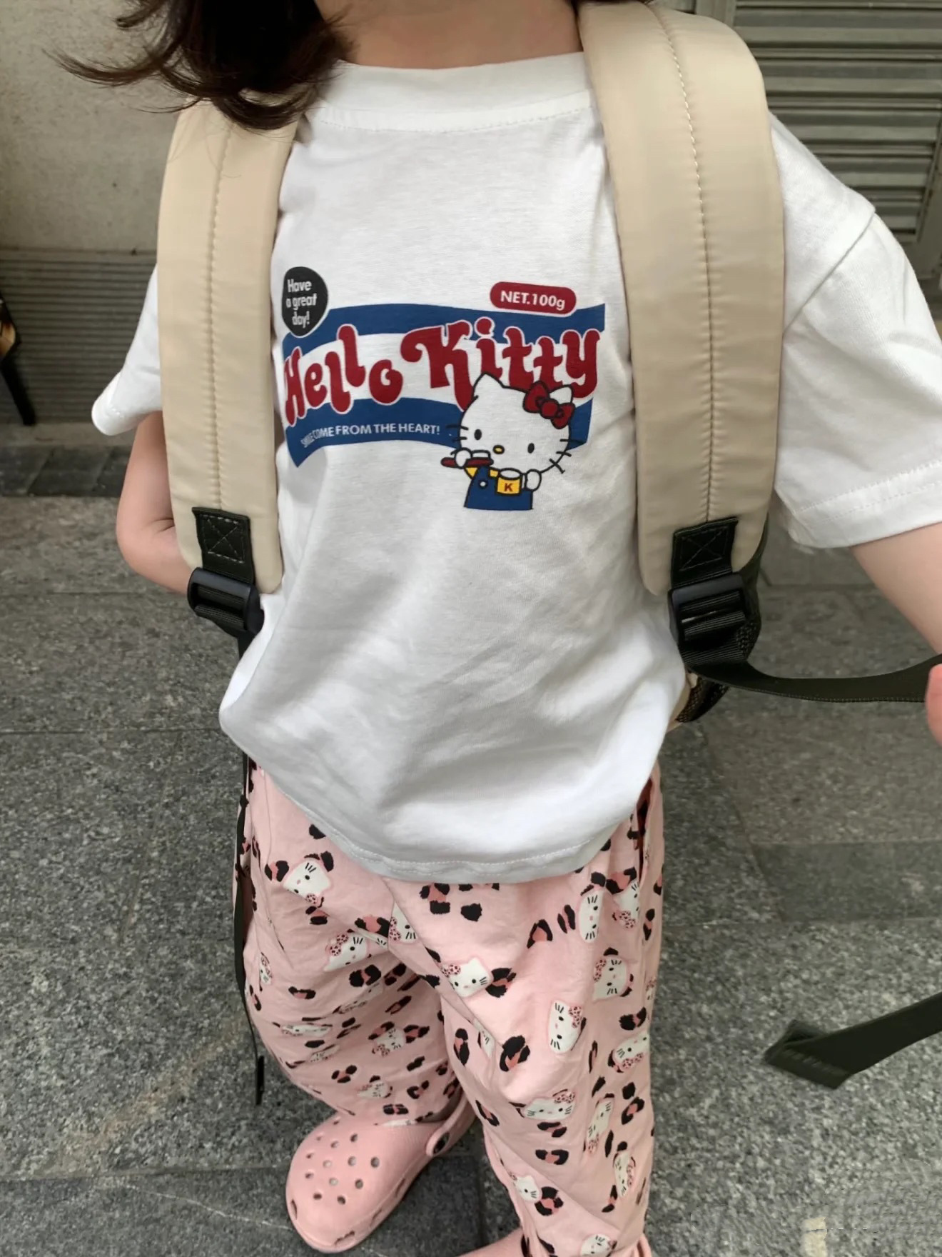 여름 어린이 정장 kt 고양이 만화 프린트 반팔 코튼 티셔츠 소녀 한국 스타일 와이드 레그 바지 모기 방지 바지스토어 가기