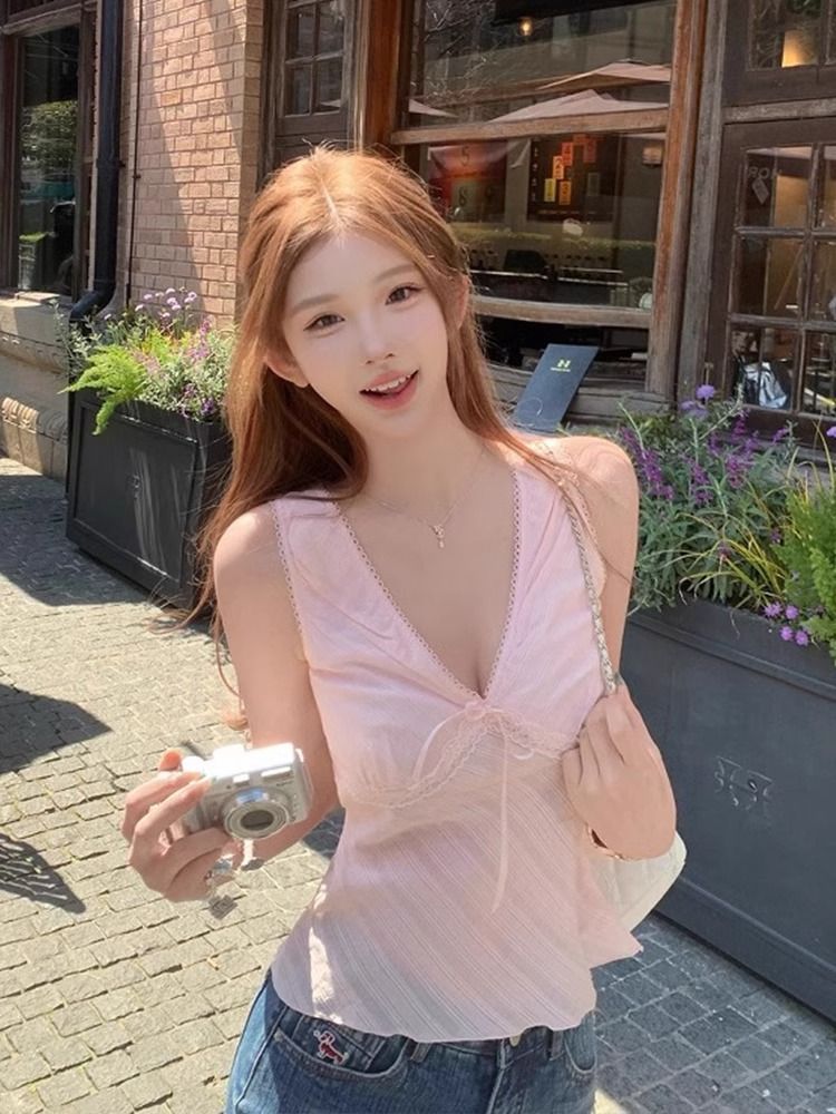 Pure Desire Sweet Hot Girl V 넥 민소매 셔츠 탑 여성 디자인 기질 스트랩 보우 캐미솔 여름스토어 가기