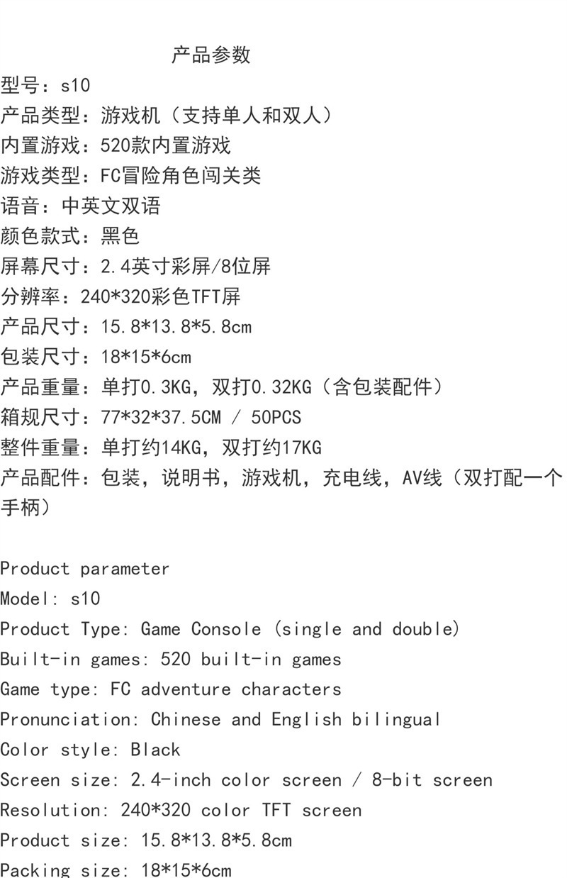 미니 게임 콘솔 520 크로스보더 S10 조이스틱 클래식 게임 향수 아케이드 멀티 플레이어 휴대용 게임 콘솔