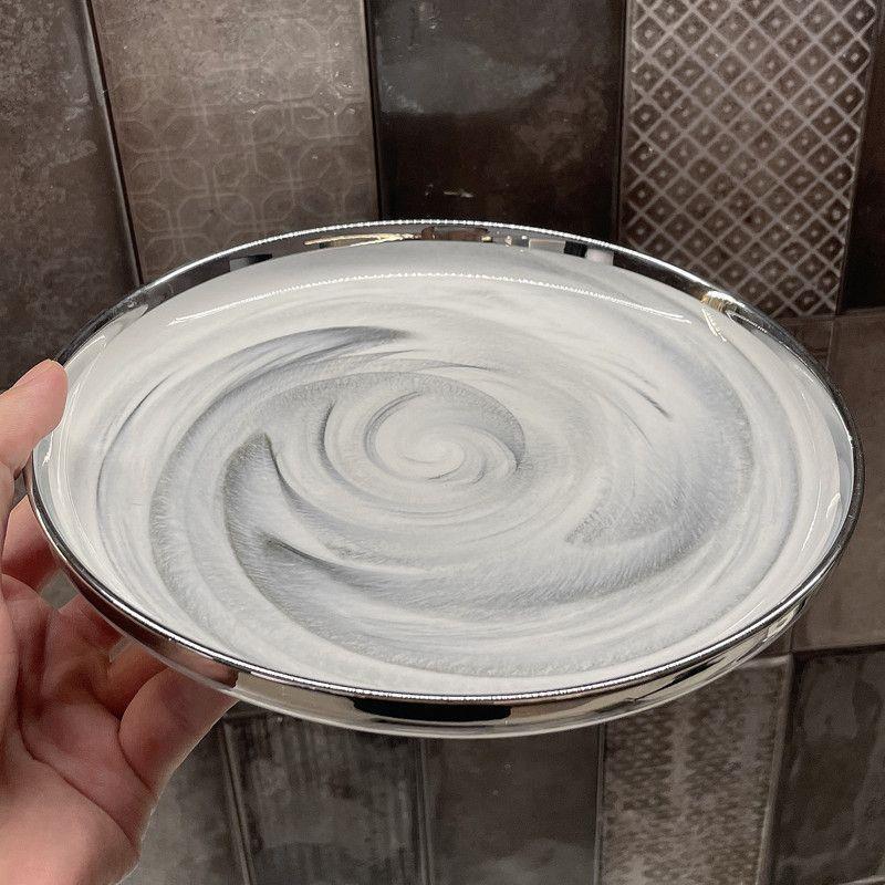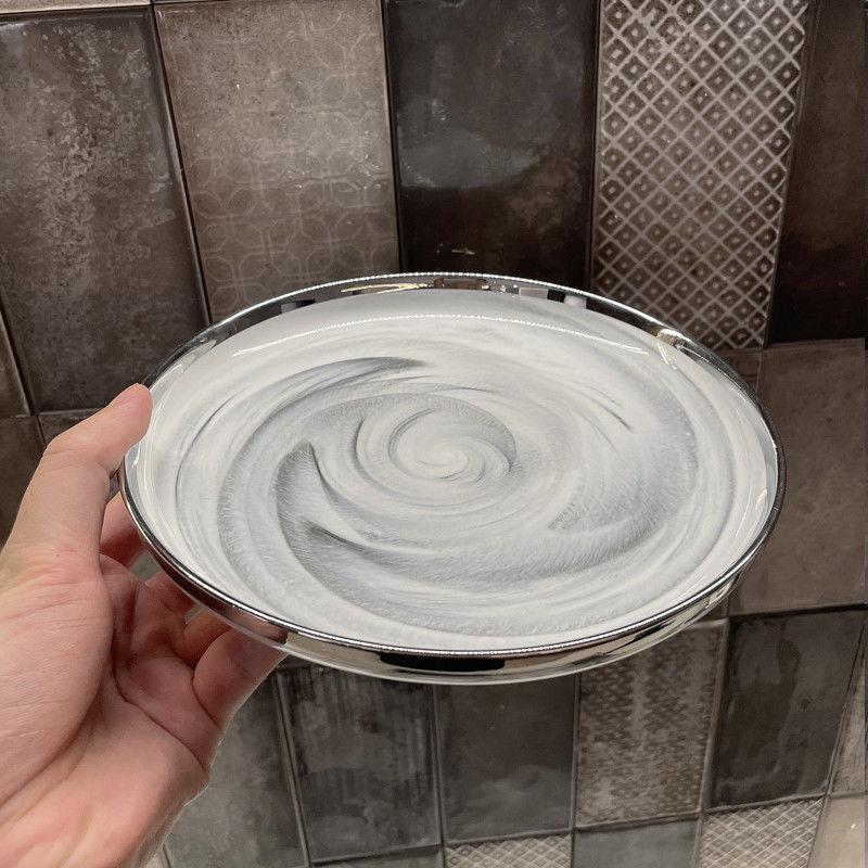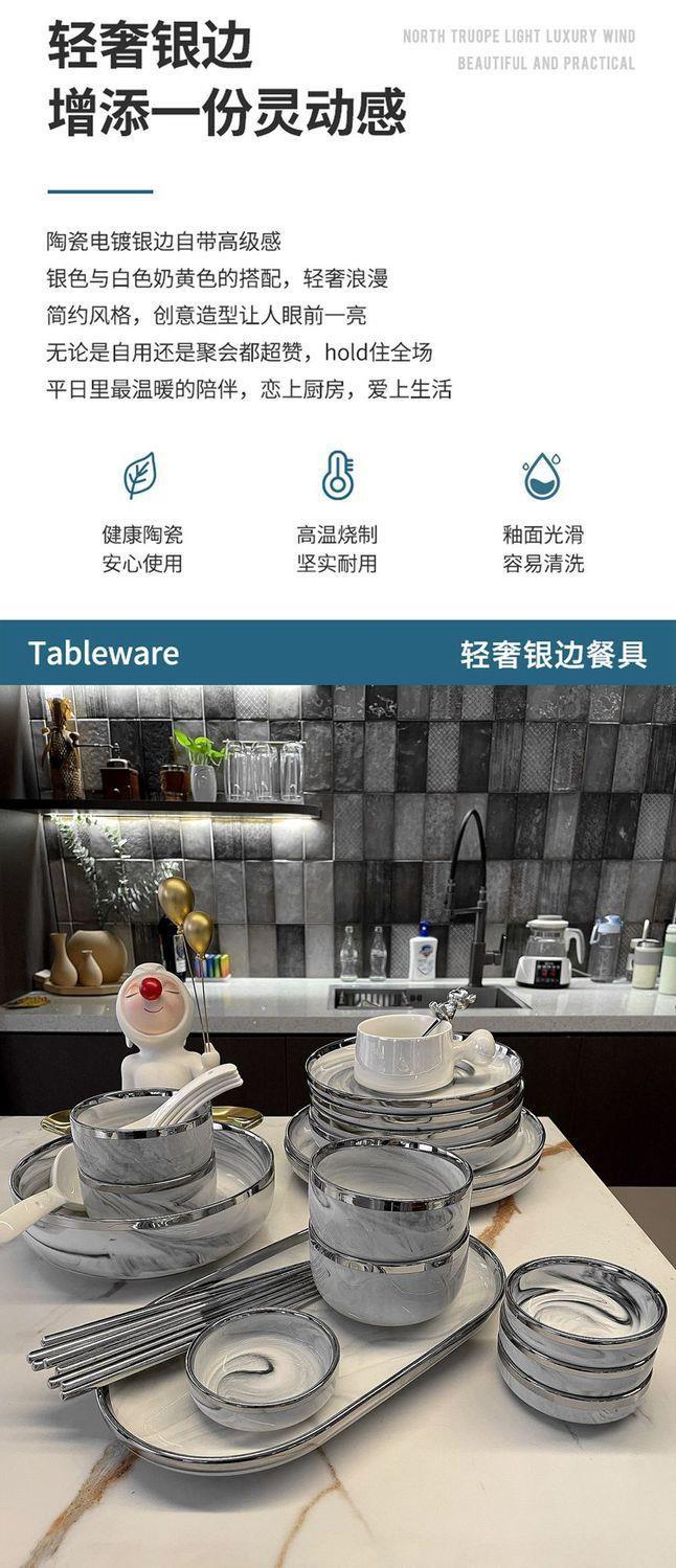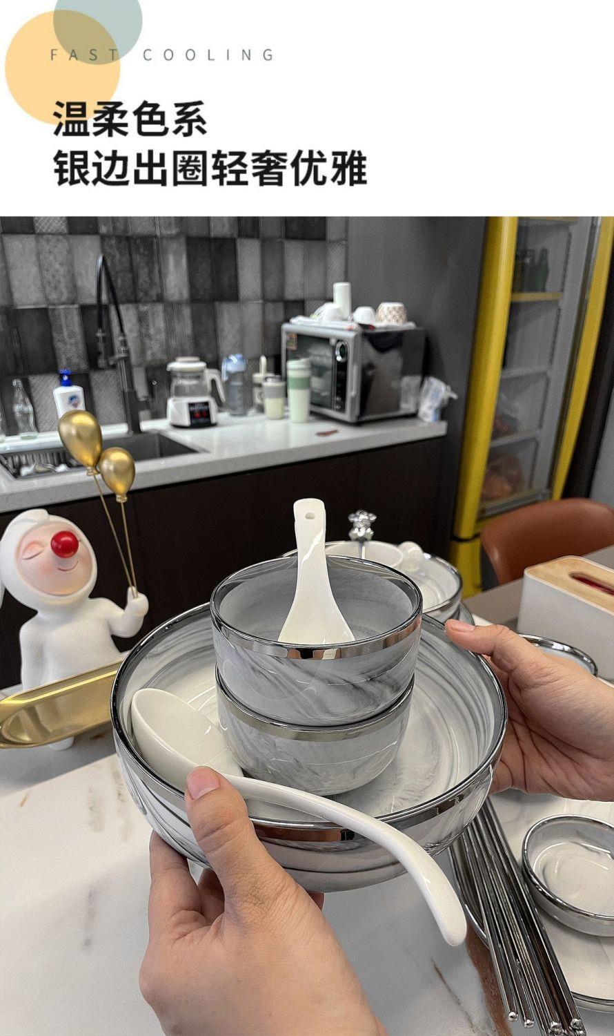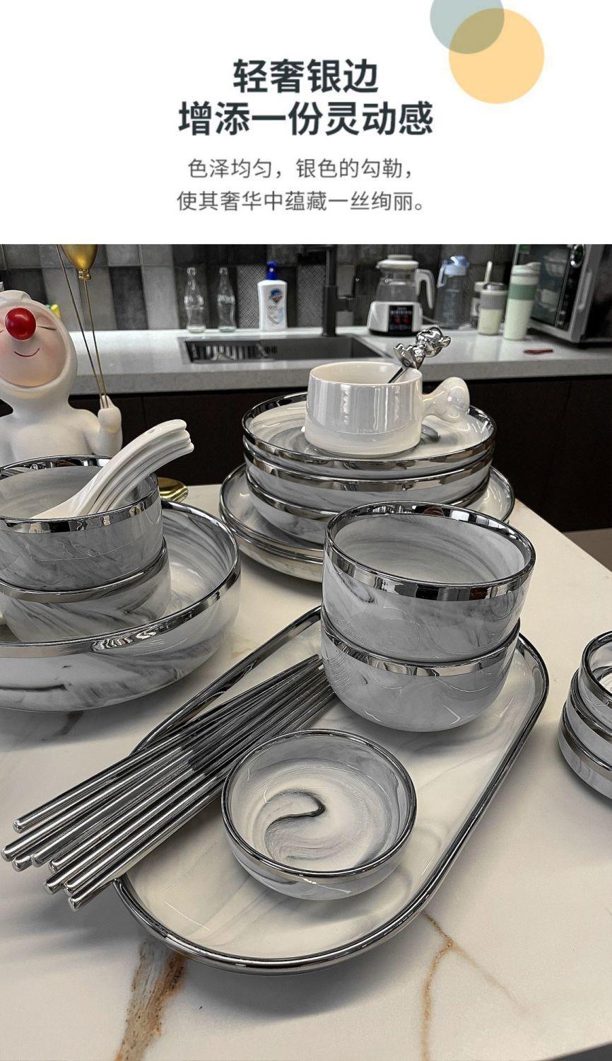 대리석 패턴의 가벼운 고급 실버 테두리 가정용 접시, 숟가락 및 젓가락, 접시, 세라믹 수프 그릇, 현대 식기스토어 가기