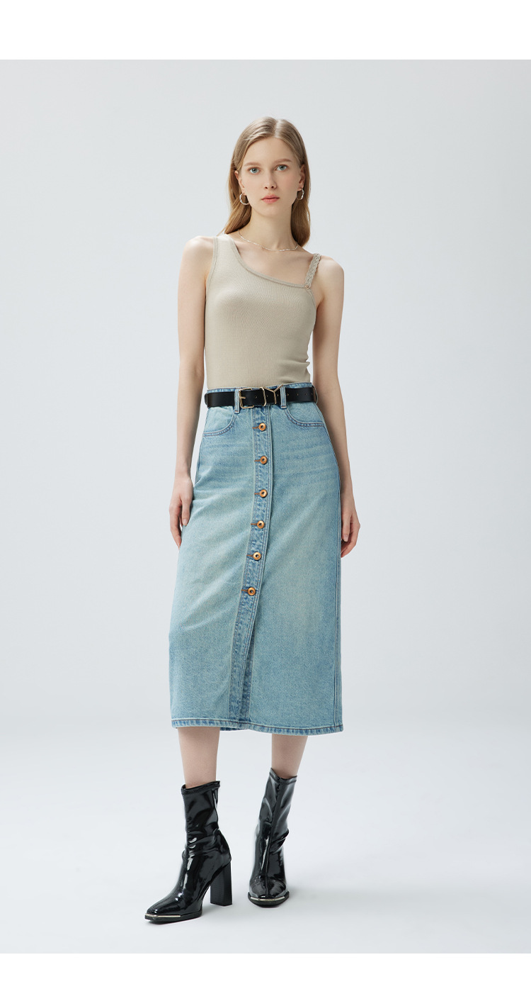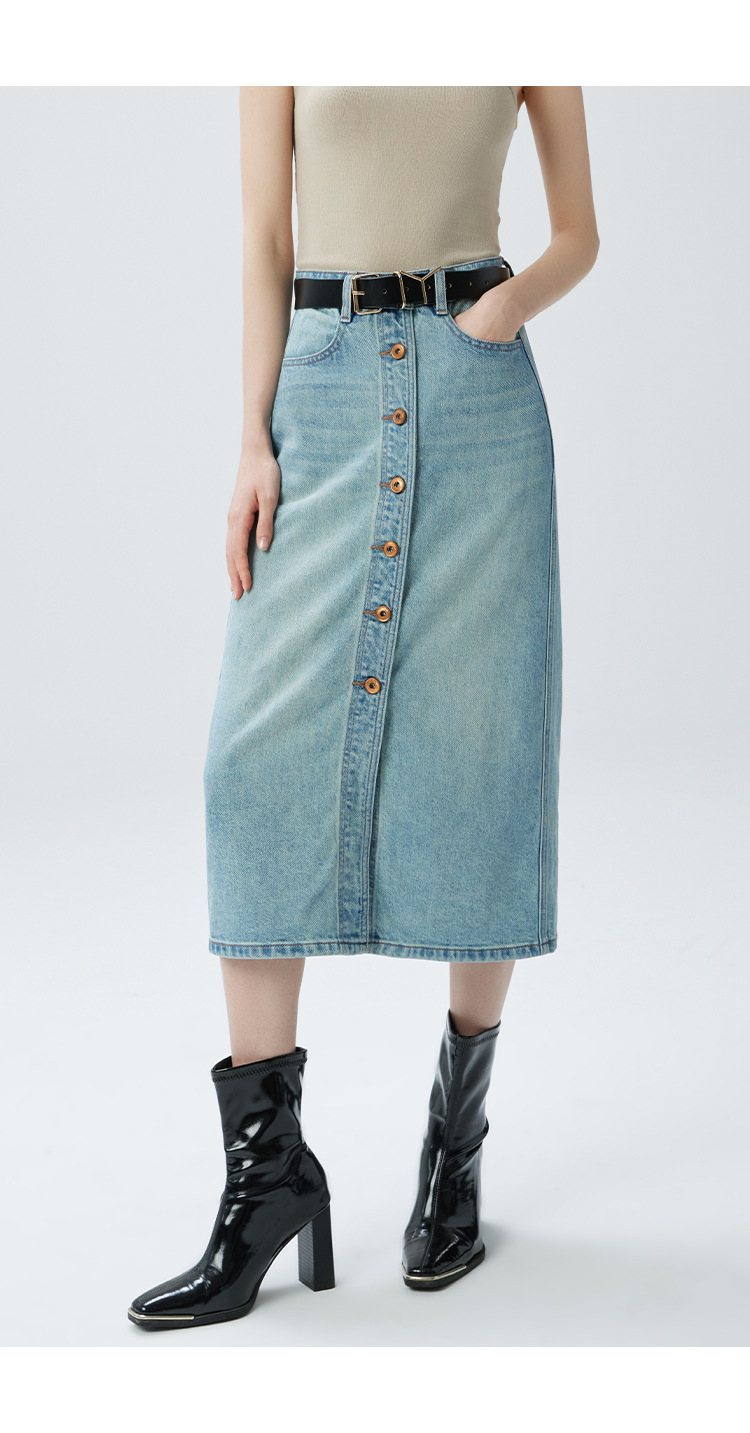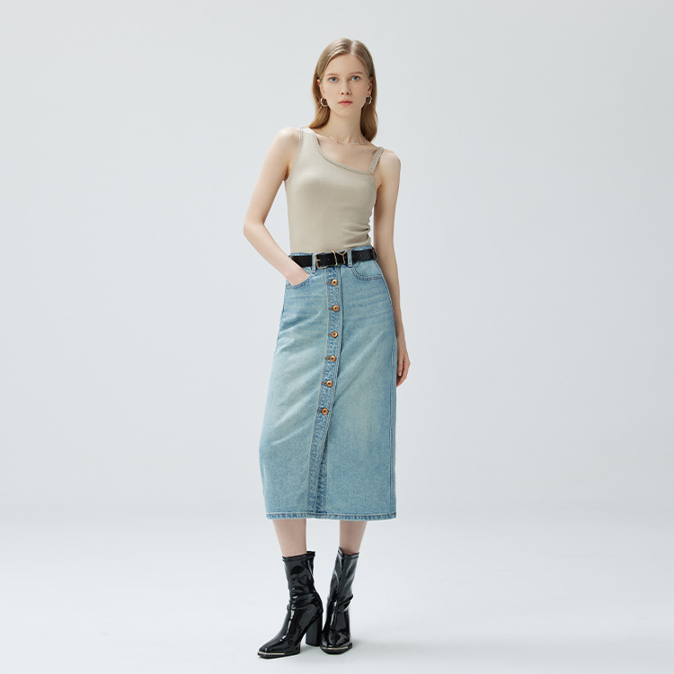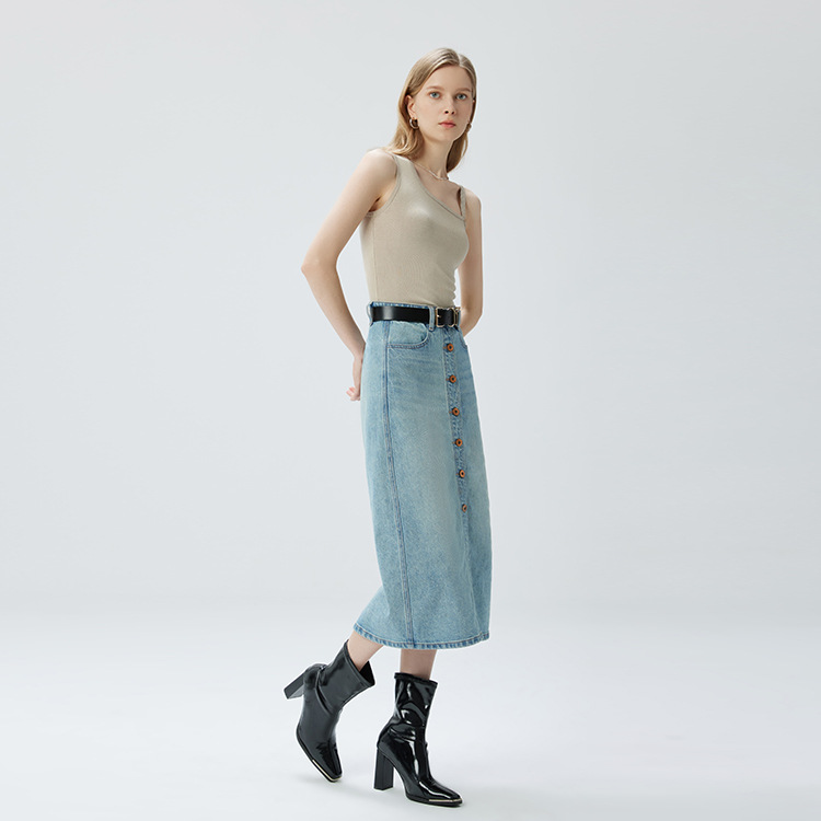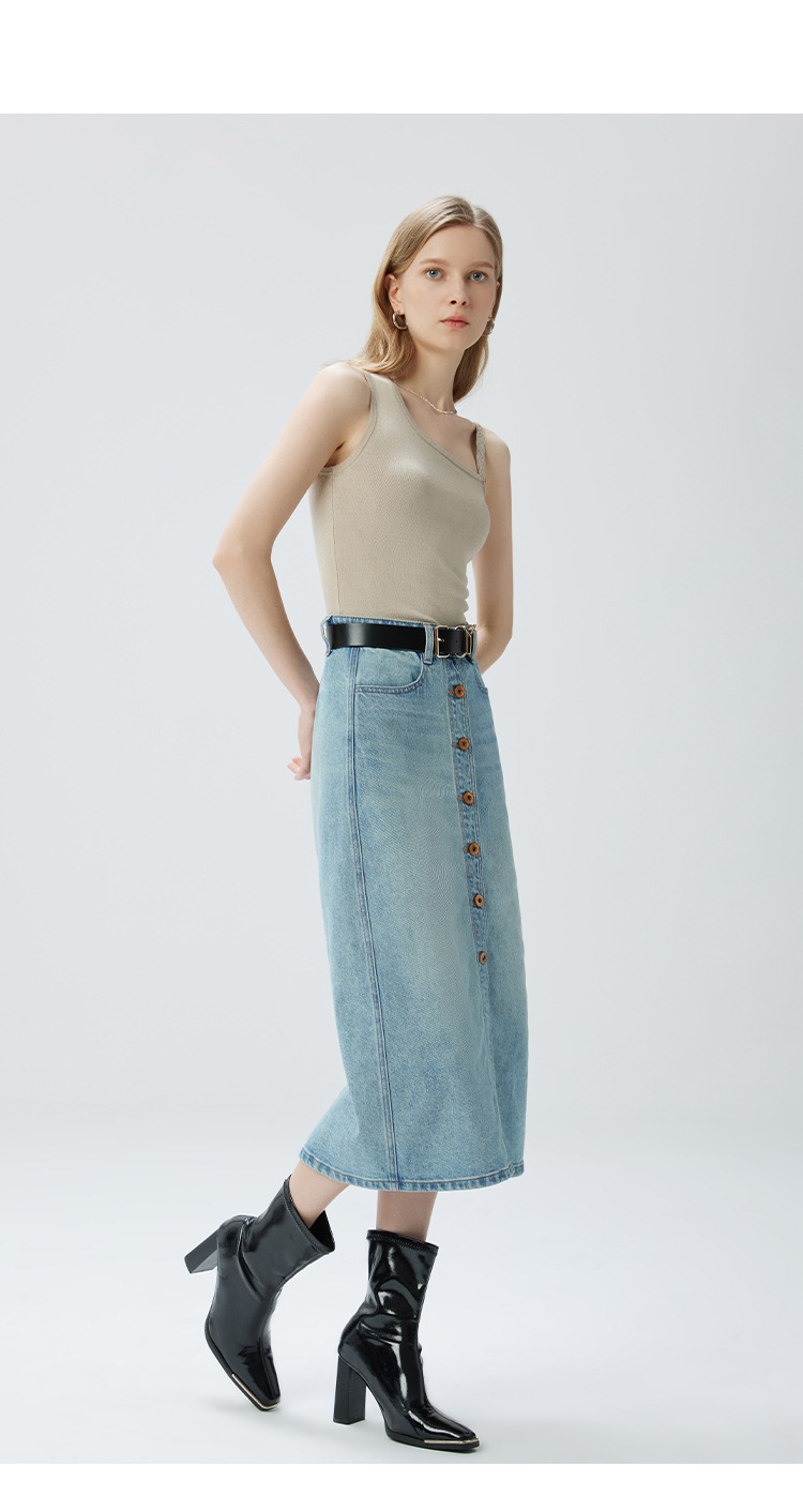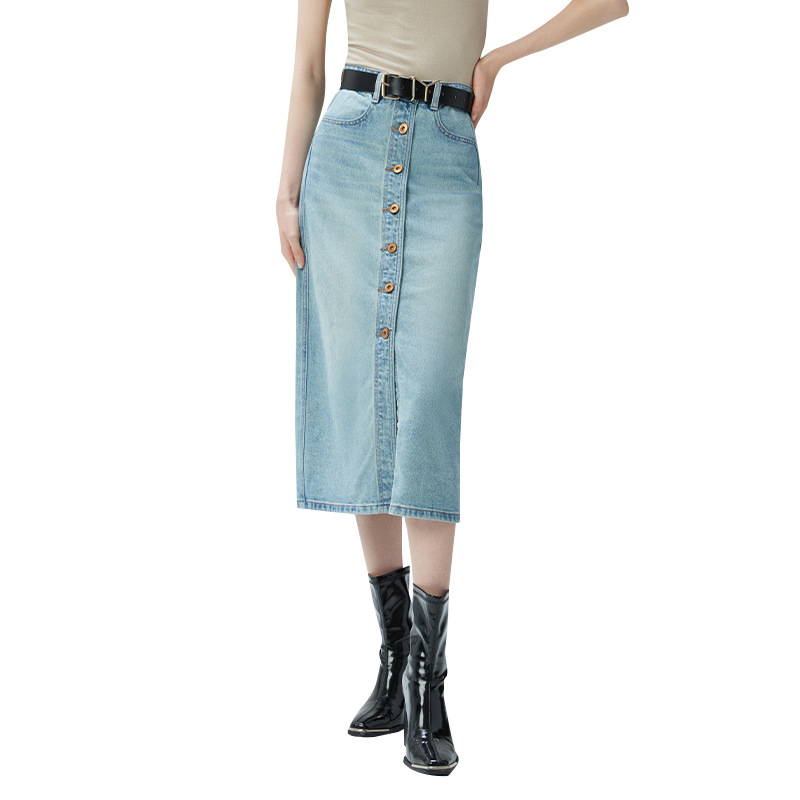 Coolmeipai 2025 여름 데님 스커트 우아한 캐주얼 하이 웨이스트 프론트 버튼 미드 스커트 레트로 블루 미디 스커트스토어 가기