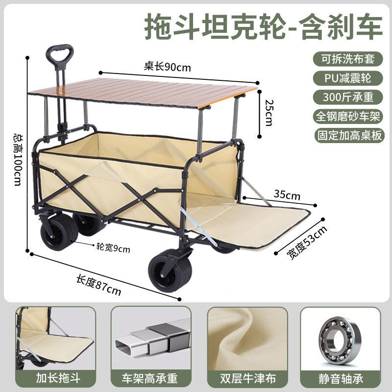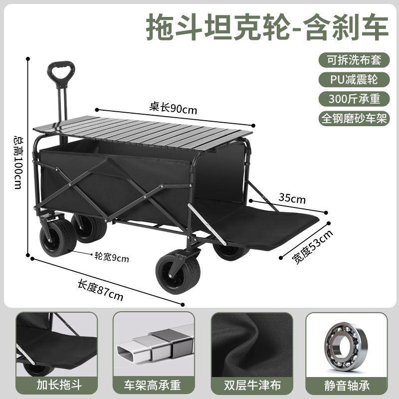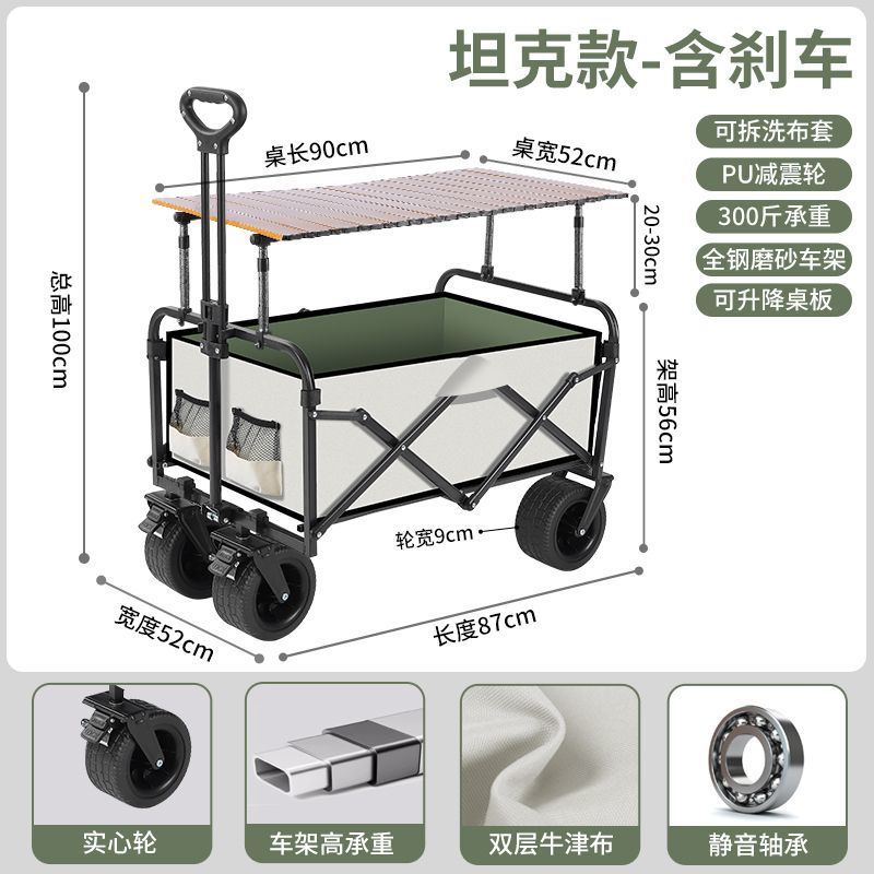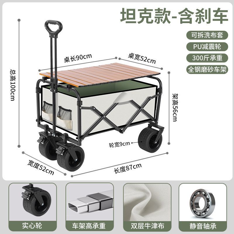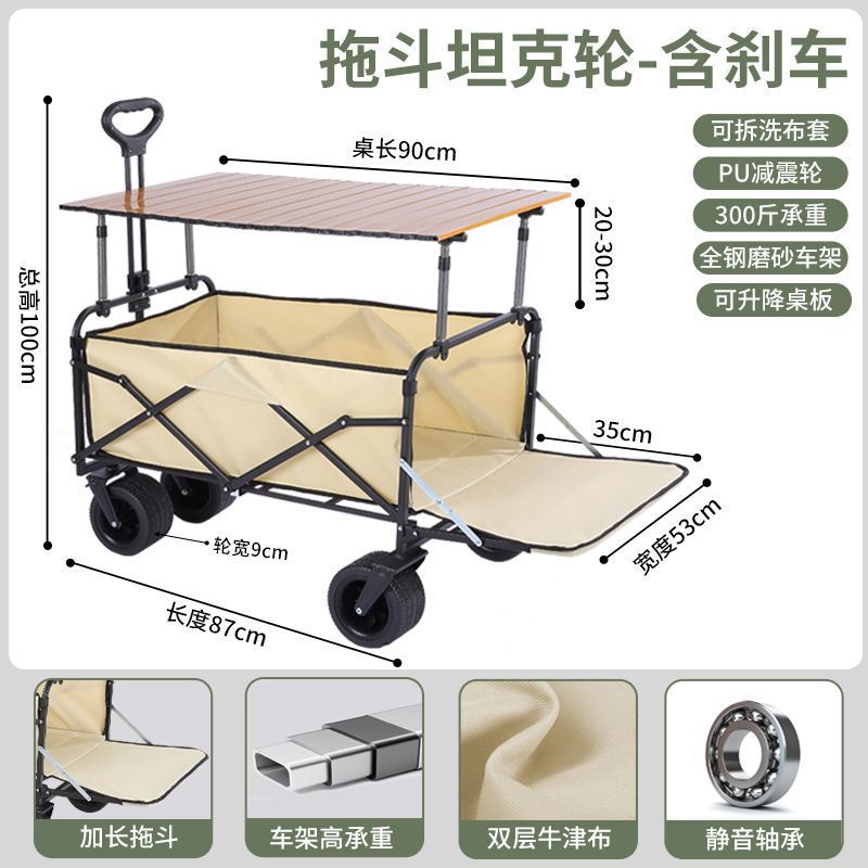 • 캠프카 + 테이블 + 하이트닝 폴 - 뒤로 10inch 탱크 휠 카키/더블 브레이크 회전 가능