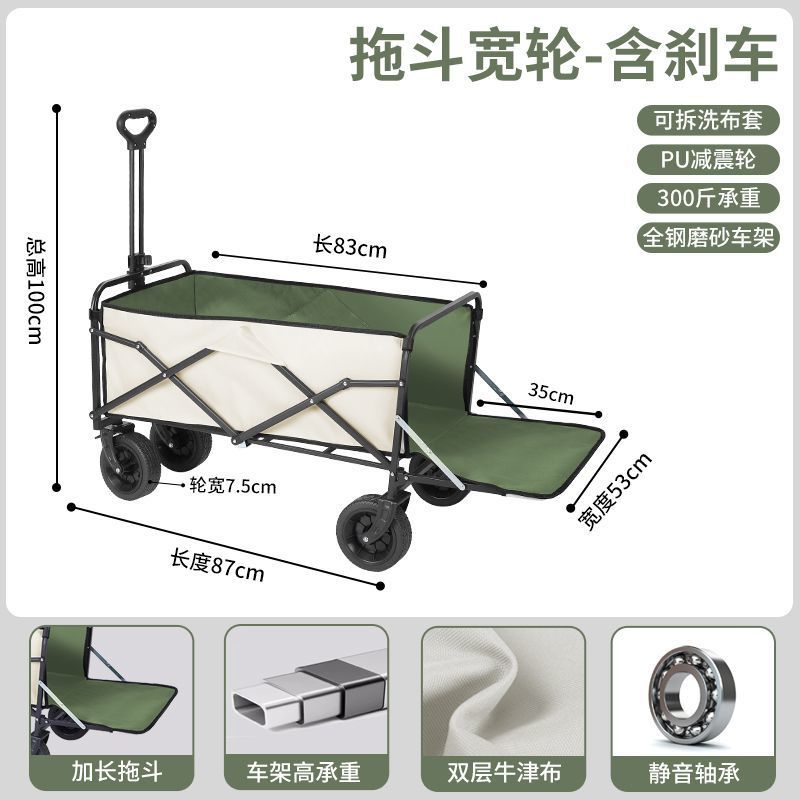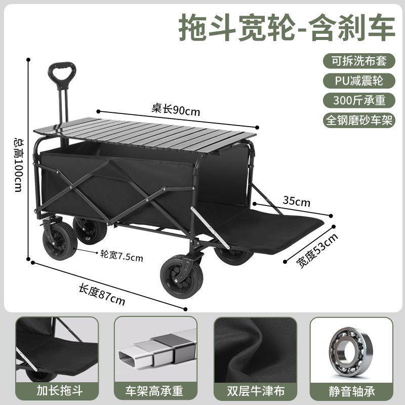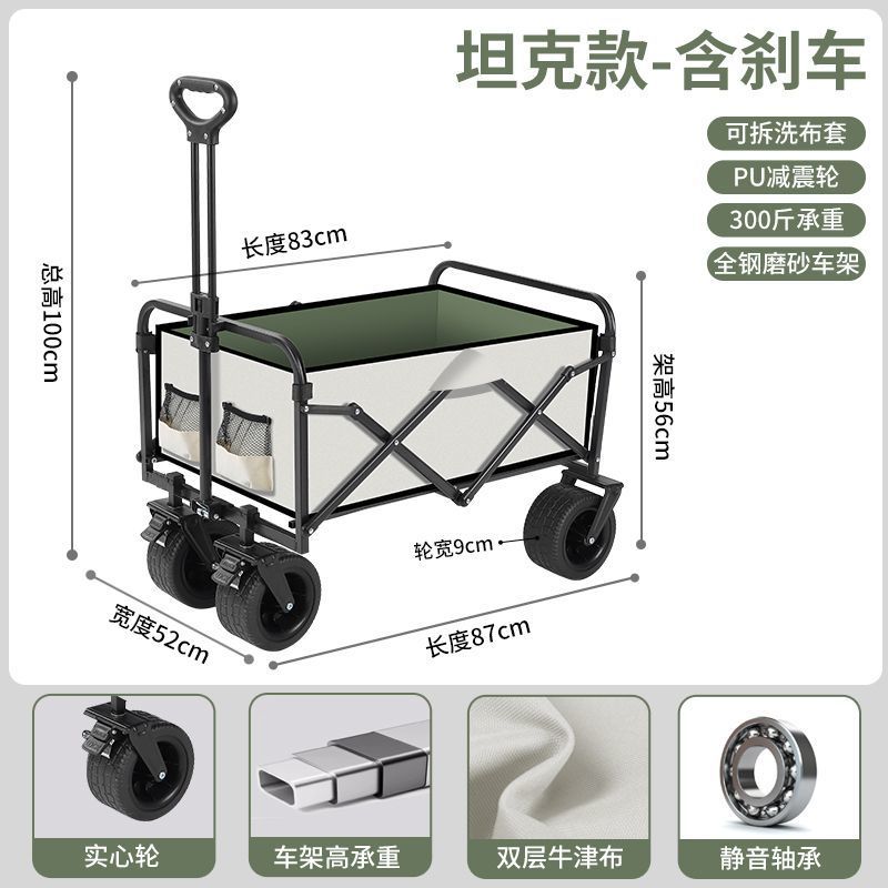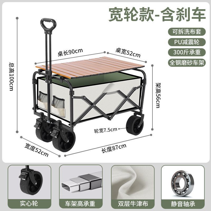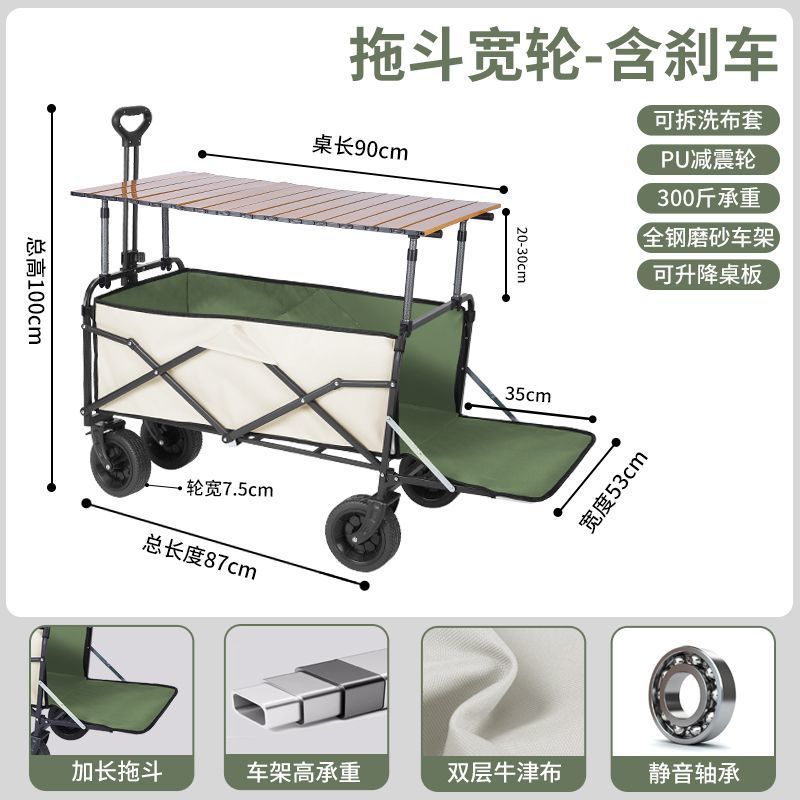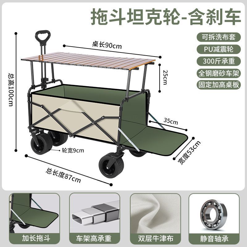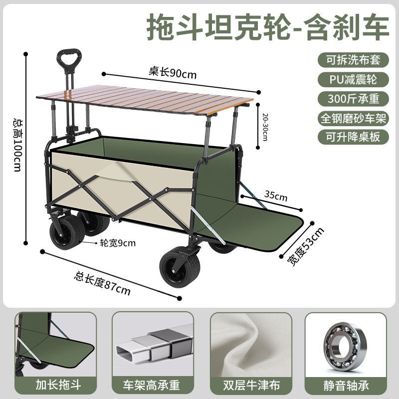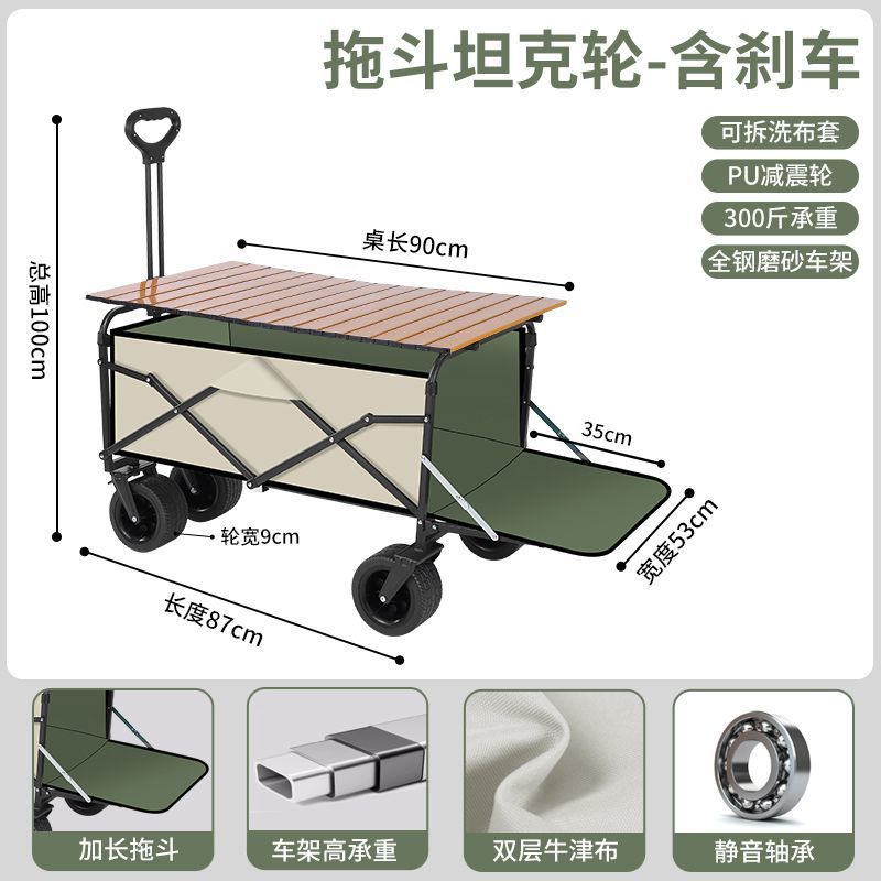 • 캠프카 + 테이블 + 하이트닝 폴 - 10inch 탱크 휠 라이스 그린/더블 브레이크로 뒤로 뒤집을 수 있음