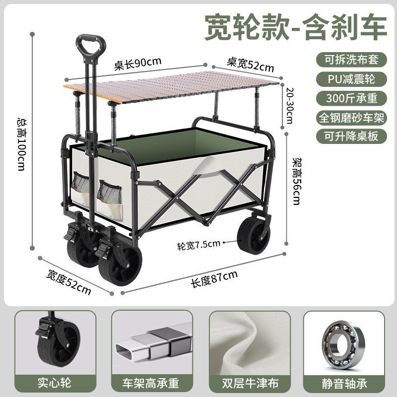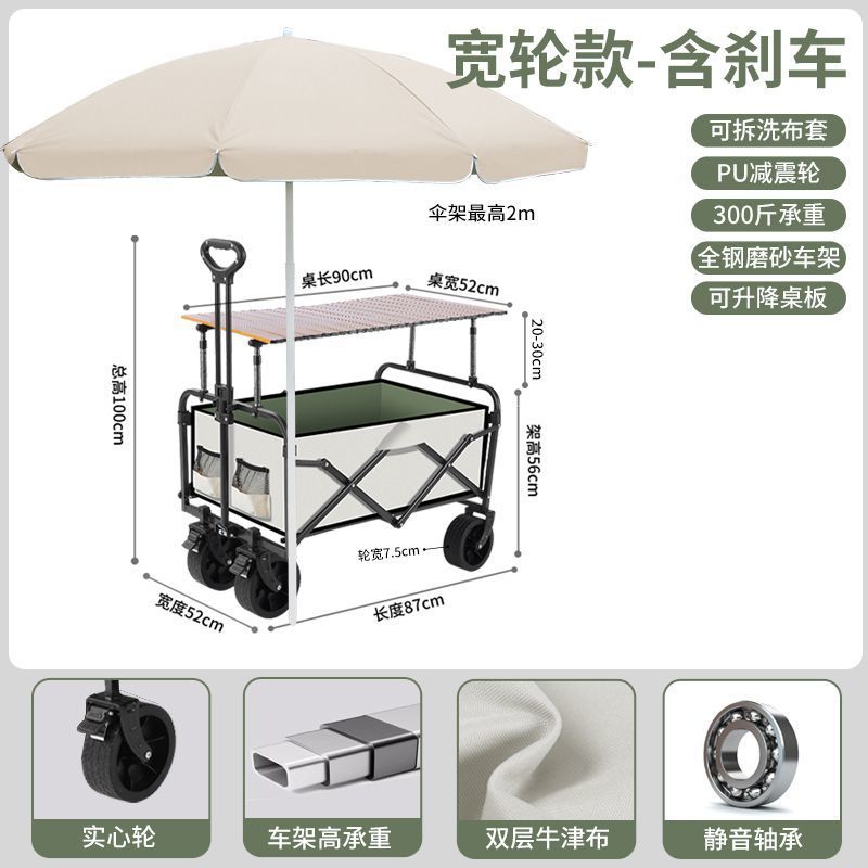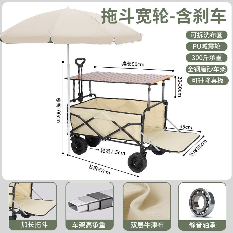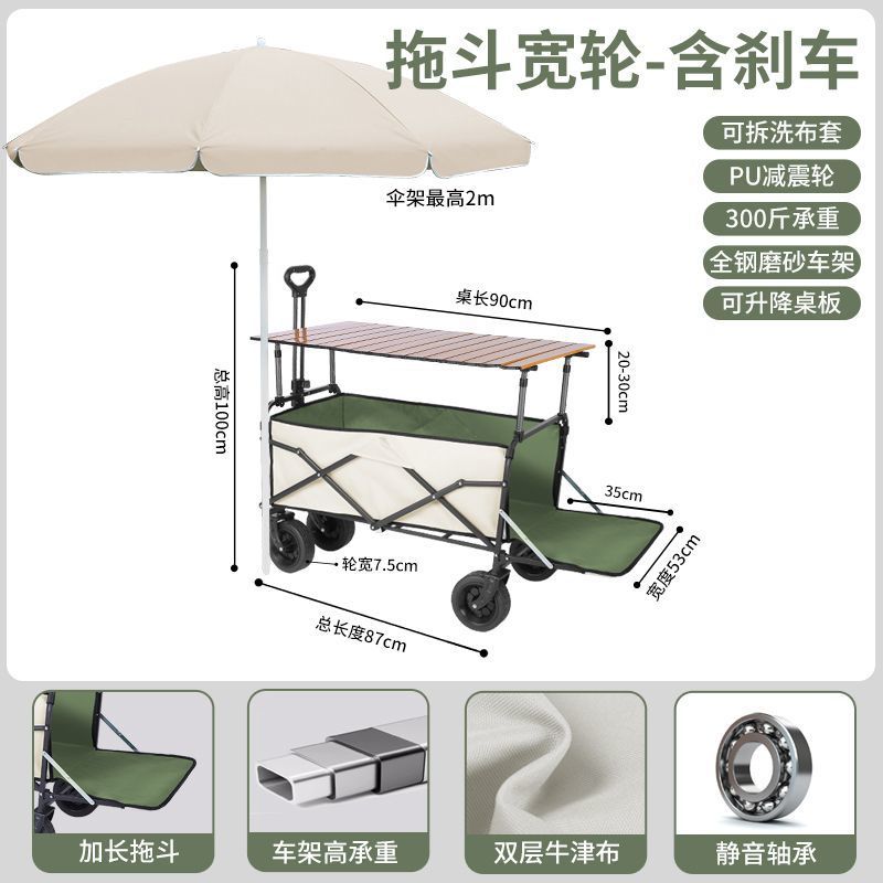 • 캠프카 + 테이블 + 리프팅 폴 + 파라솔 - 뒤로 8inch 회전 가능, 넓은 휠 카키/더블 브레이크