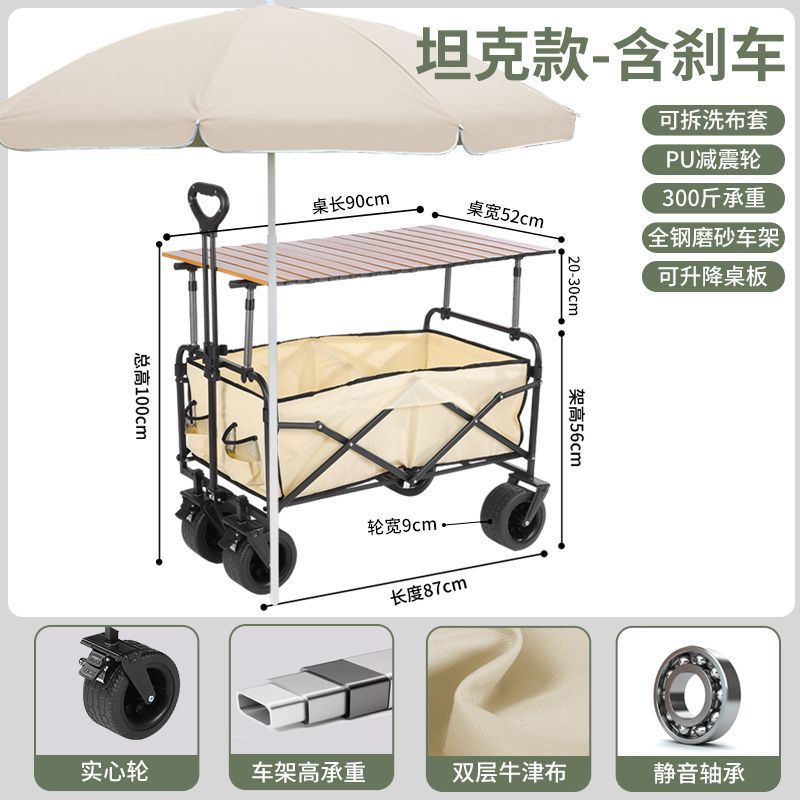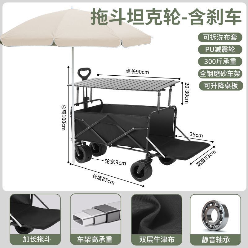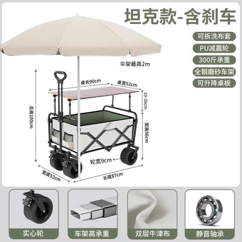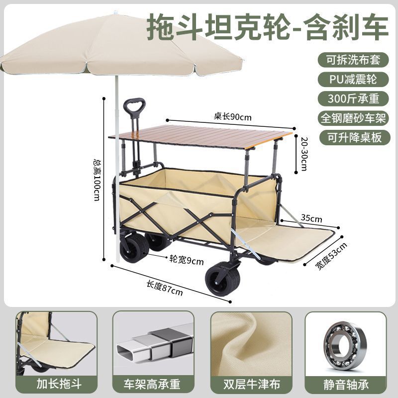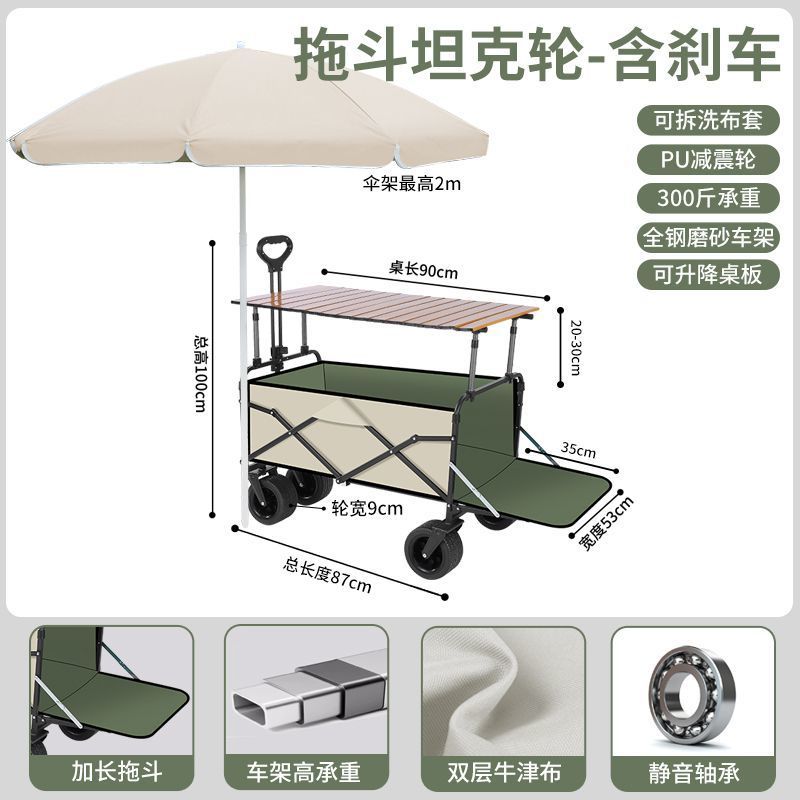 • 캠프카 + 테이블 + 리프팅 폴 + 파라솔 - 뒤로 회전 가능 10inch 탱크 휠 카키/더블 브레이크