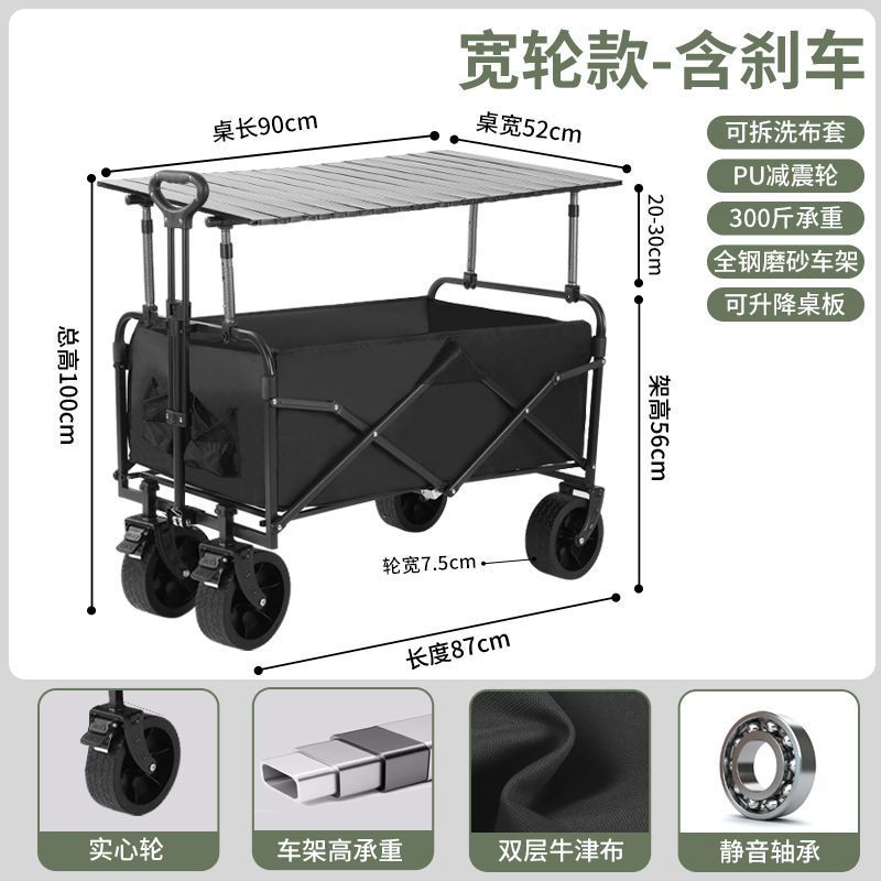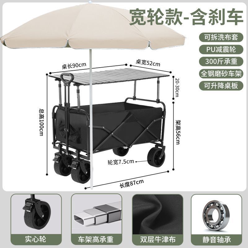 • 캠프카 + 테이블 + 리프팅 폴 + 파라솔 - 뒤로 8inch 회전 가능, 넓은 휠 블랙/더블 브레이크