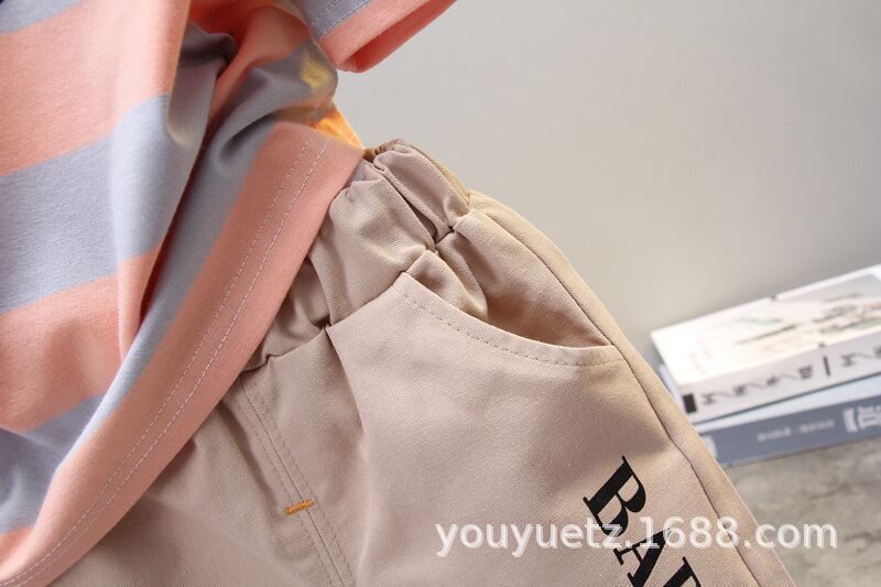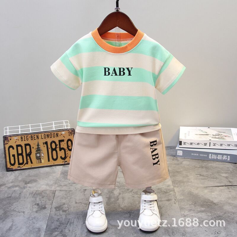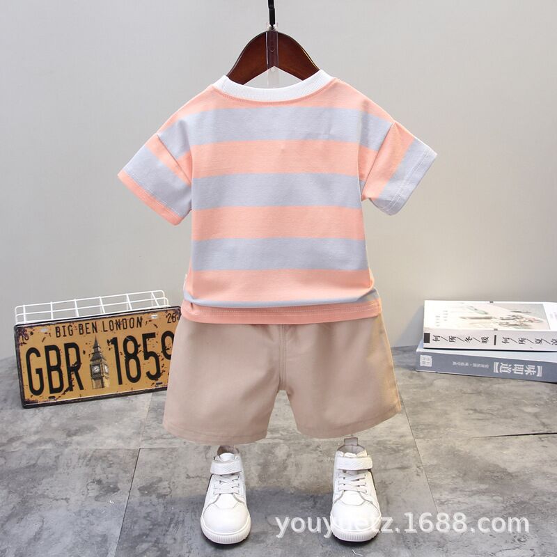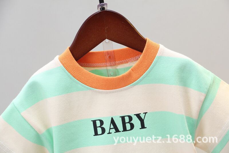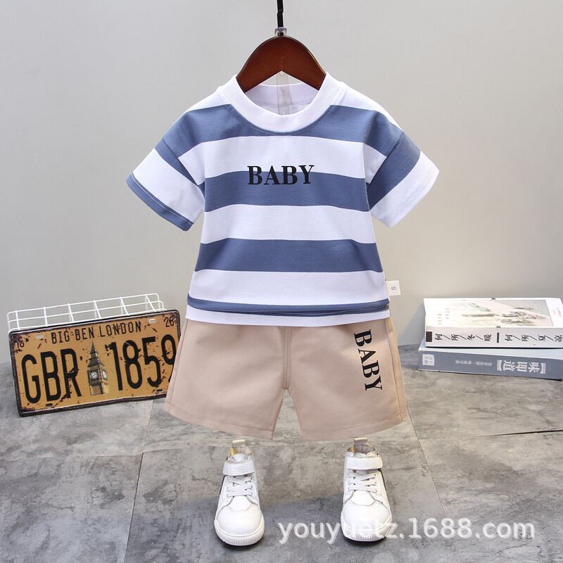 소년 여름 정장 잘 생긴 아기 줄무늬 라운드 넥 티셔츠 0-4 세 한국 스타일 어린이 반팔 옷 도매 유행