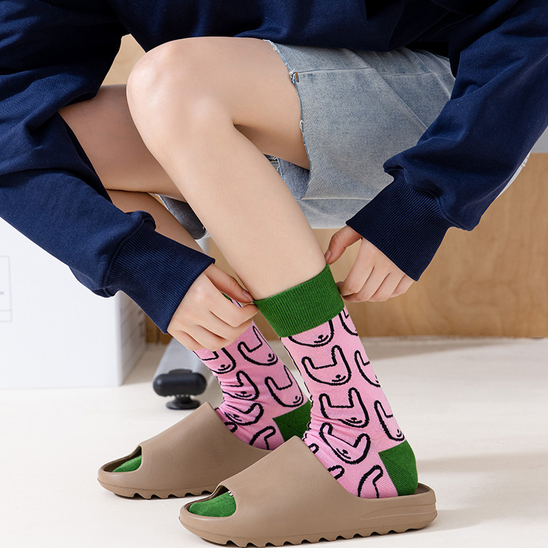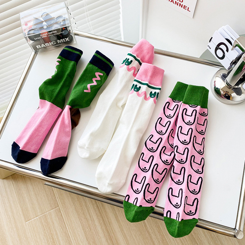 여성용 핑크와 그린 배색 양말 한국 일본식 추상 만화 토끼 중간 길이 양말 트렌디 양말스토어 가기