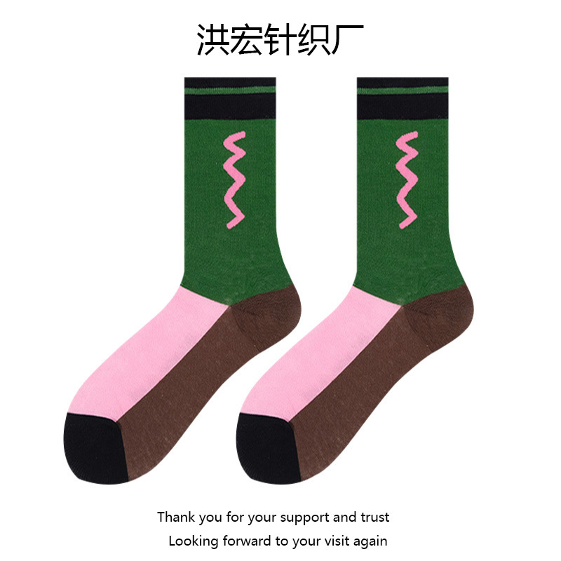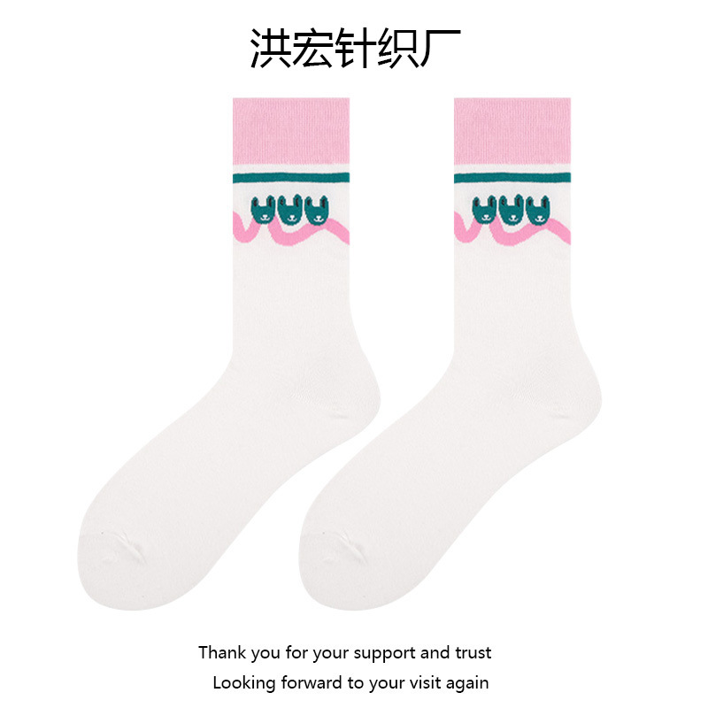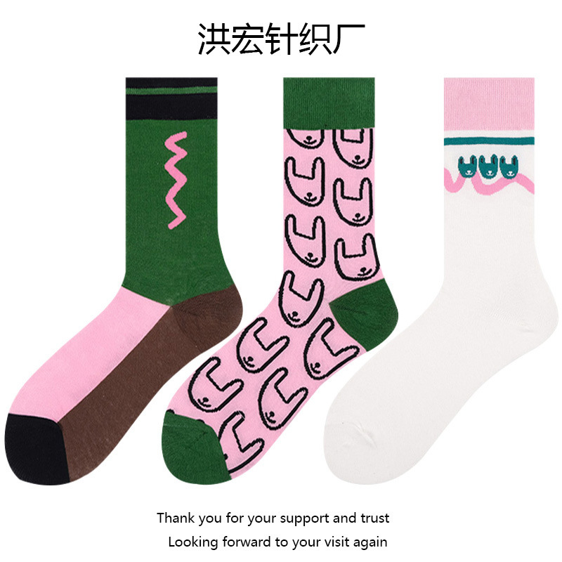 여성용 핑크와 그린 배색 양말 한국 일본식 추상 만화 토끼 중간 길이 양말 트렌디 양말