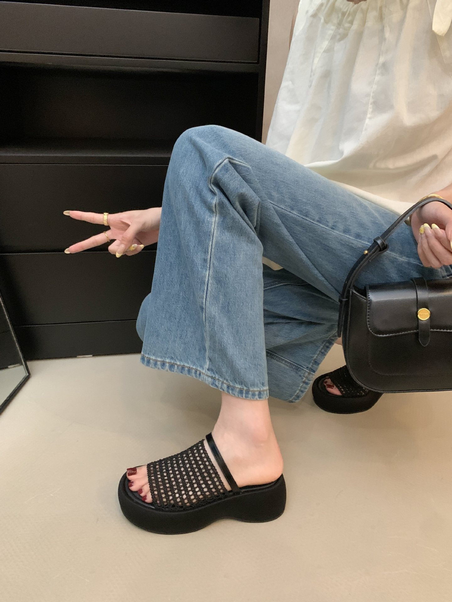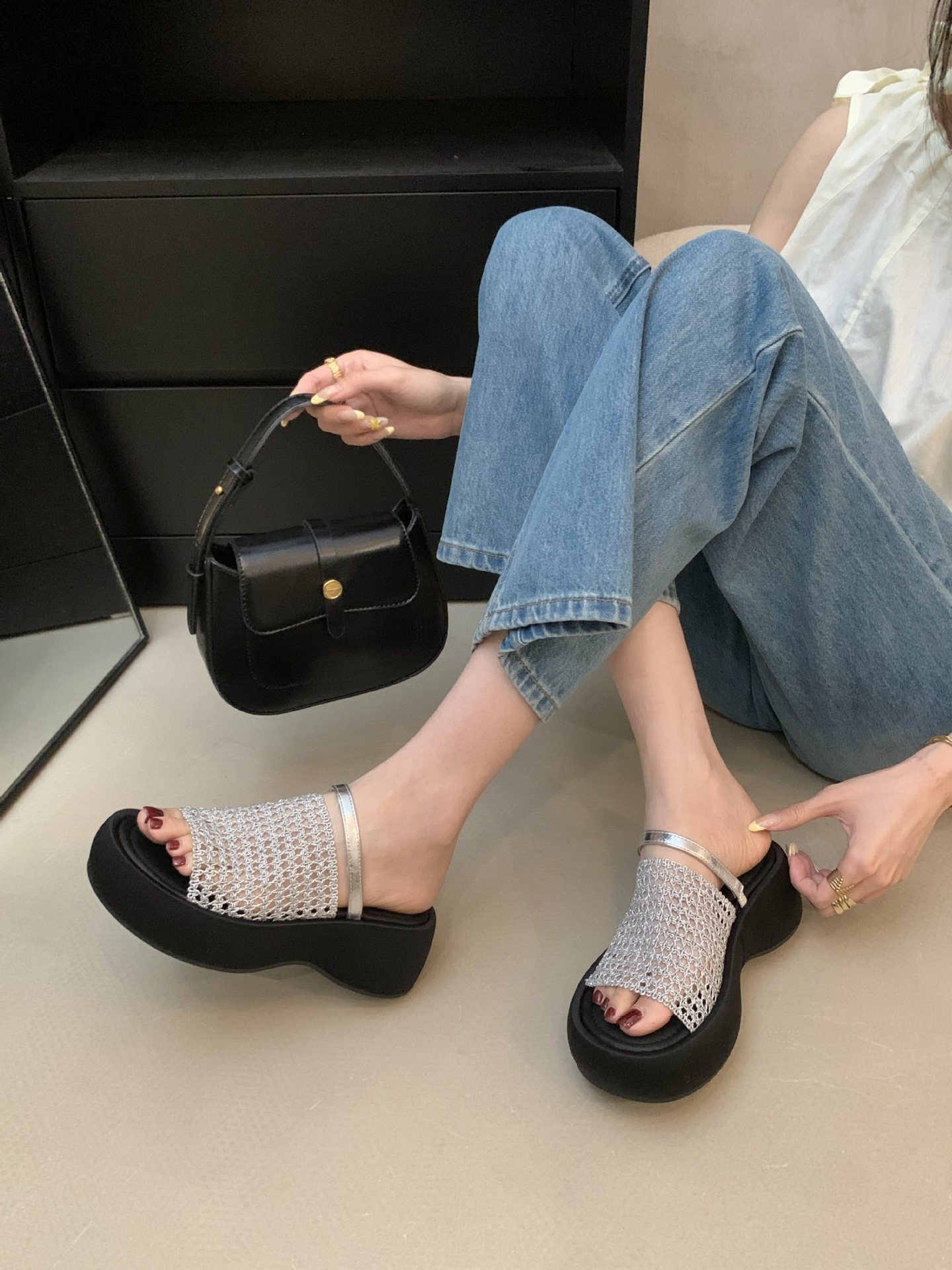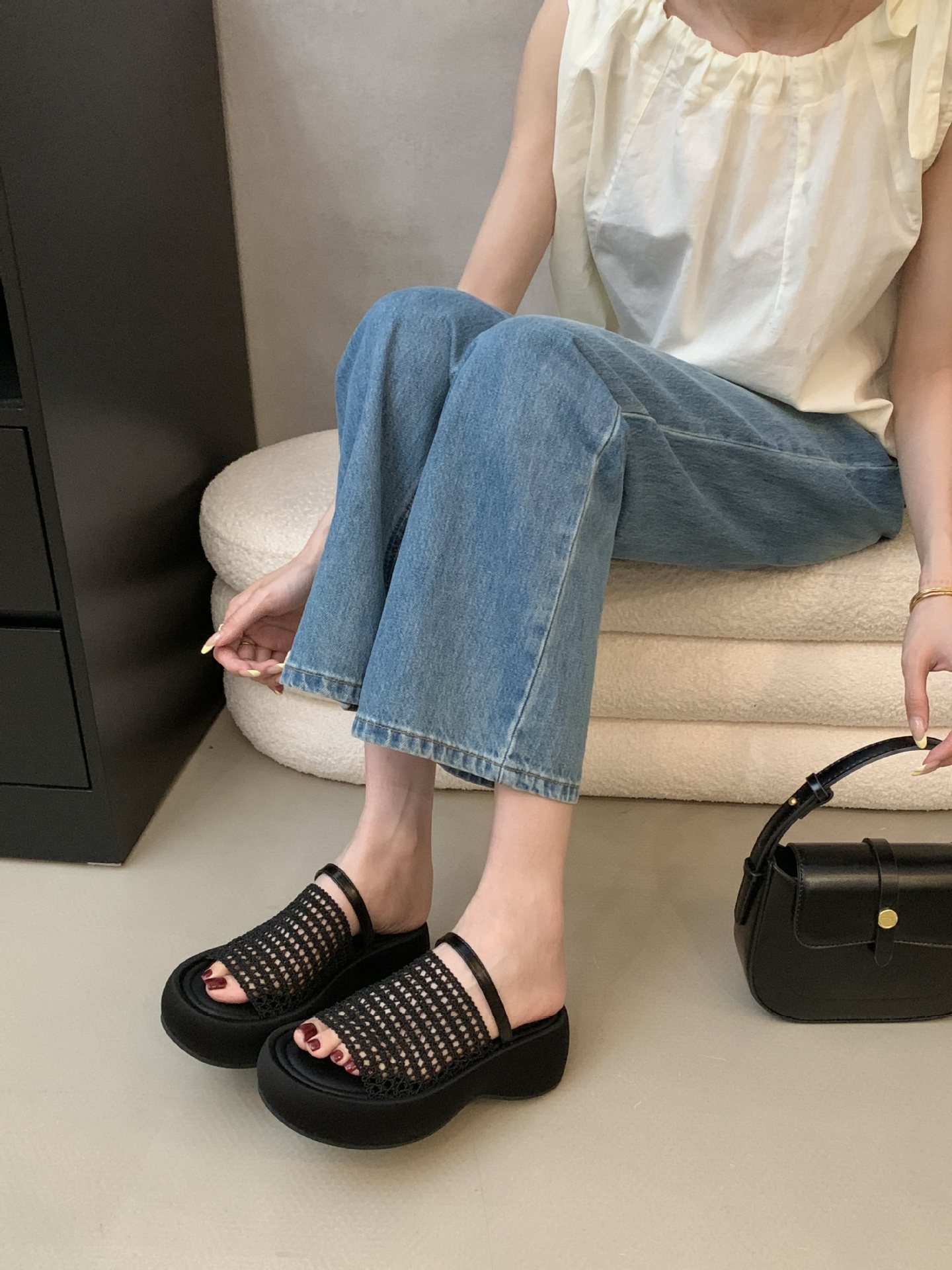 여름 아우터로 입기 좋은 여성용 플랫폼 두꺼운 굽 메쉬 샌들, 키 작은 여성을 위한 키높이 반슬리퍼