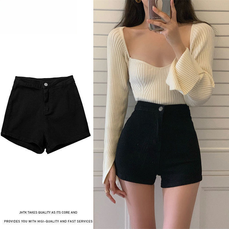 여성을위한 검은 색 꽉 데님 반바지 2025 여름 새로운 인터넷 연예인 핫 스타일 하이 웨이스트 탄성 핫 소녀 울트라 짧은 핫 바지스토어 가기
