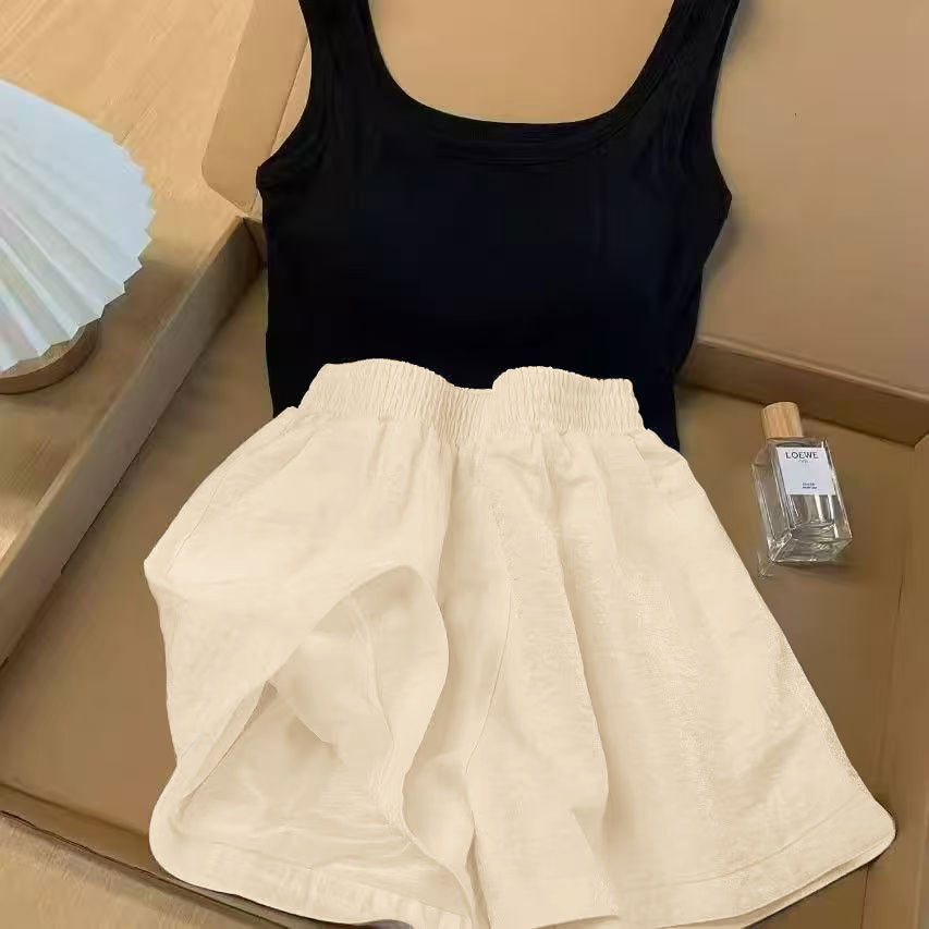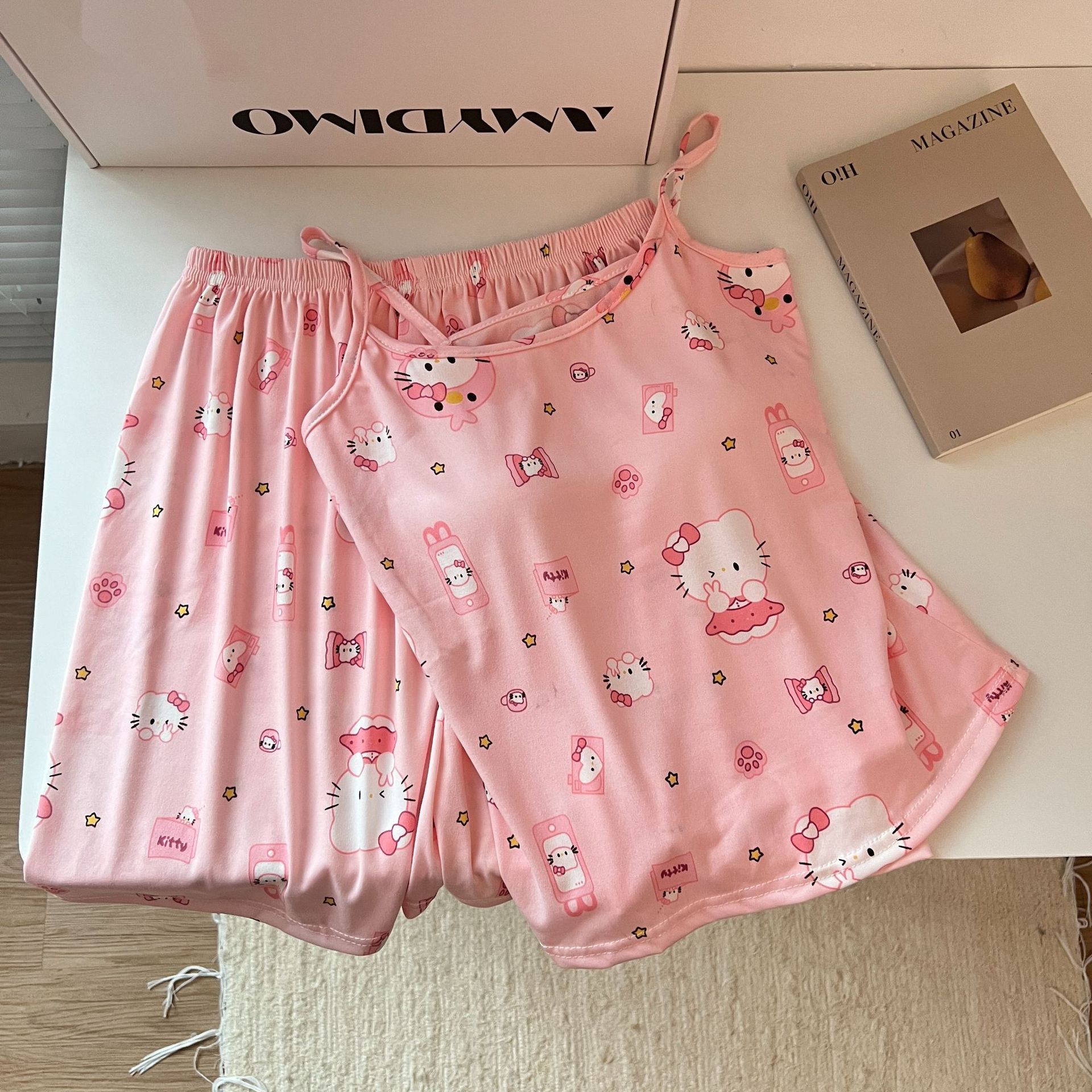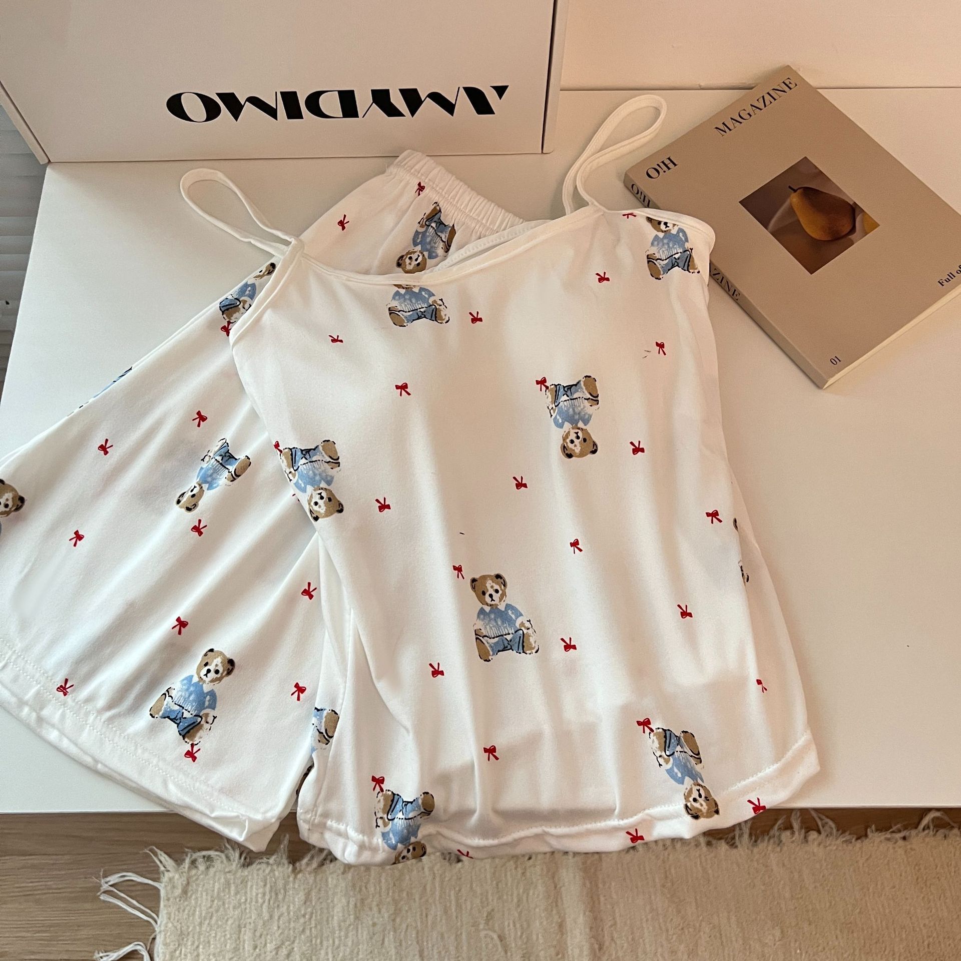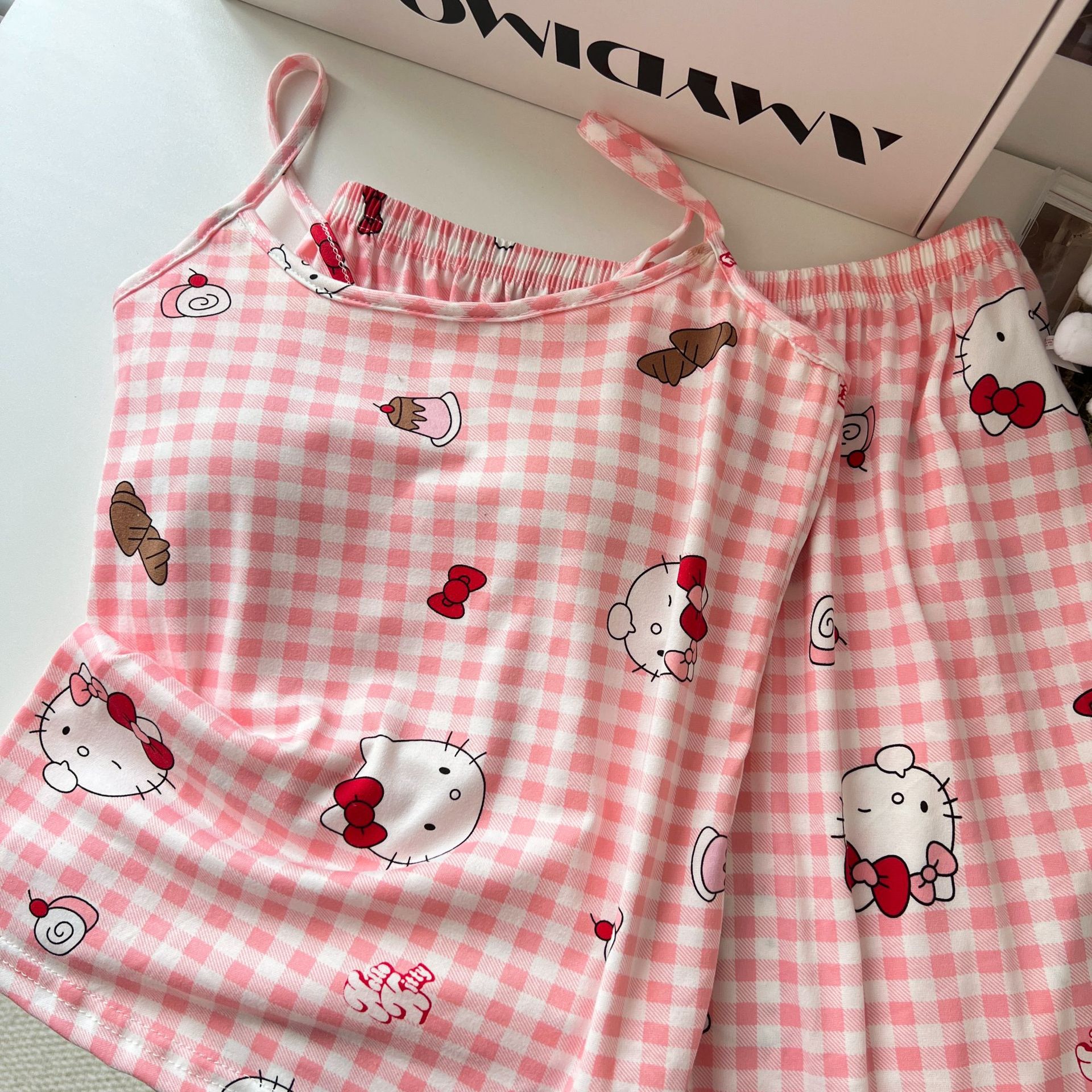 가슴 패드가 있는 여성용 올인원 캐미솔 여름 순수한 욕망 스타일 서스펜더 스트라이프 반바지 잠옷 홈웨어 투피스 세트스토어 가기