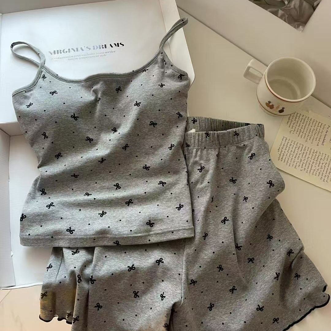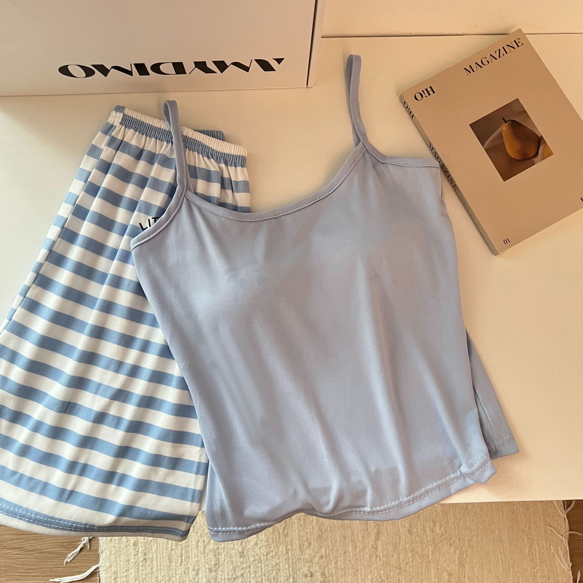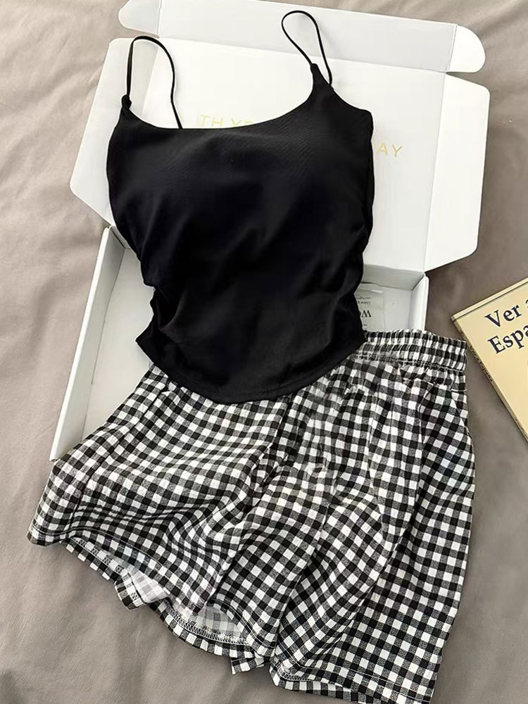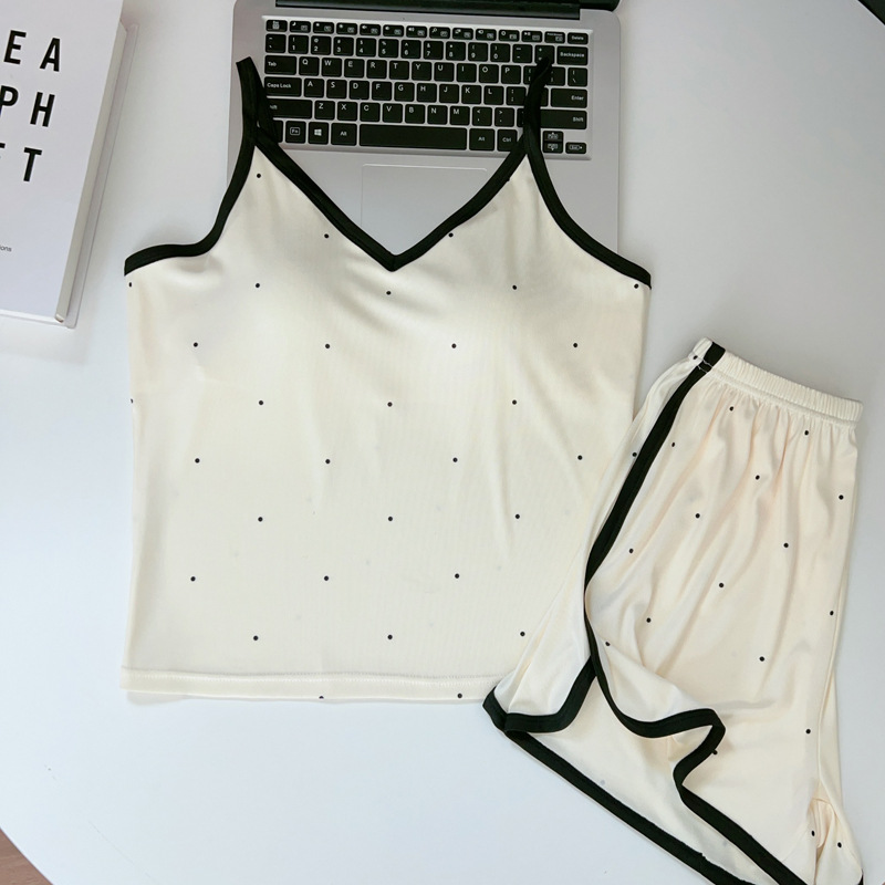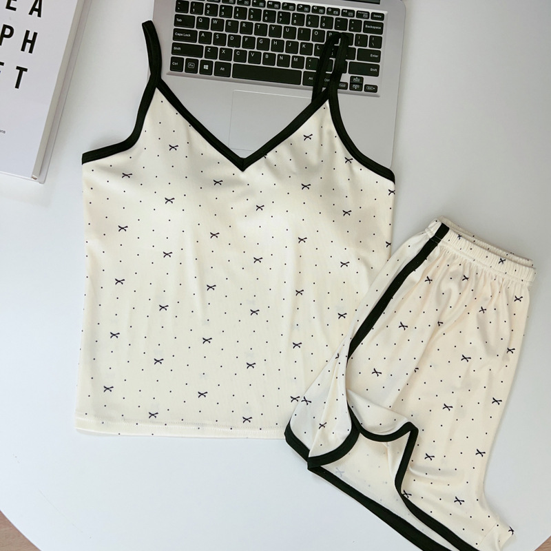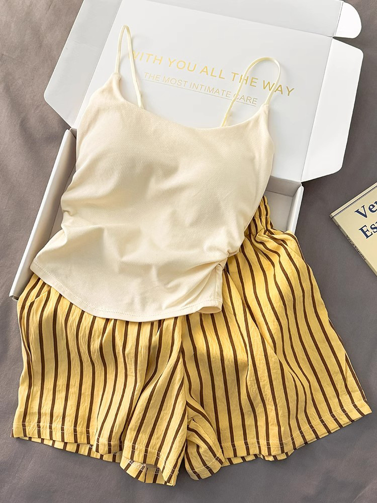 가슴 패드가 있는 여성용 올인원 캐미솔 여름 순수한 욕망 스타일 서스펜더 스트라이프 반바지 잠옷 홈웨어 투피스 세트