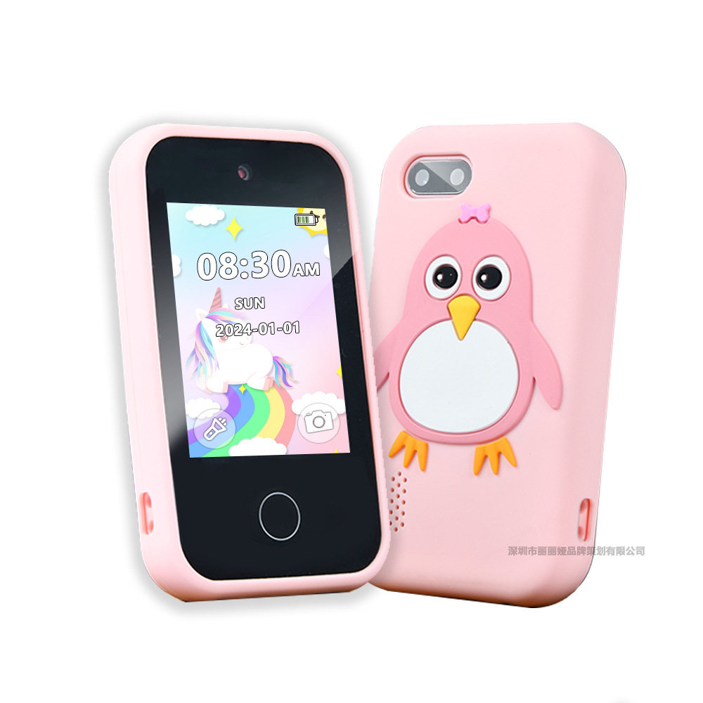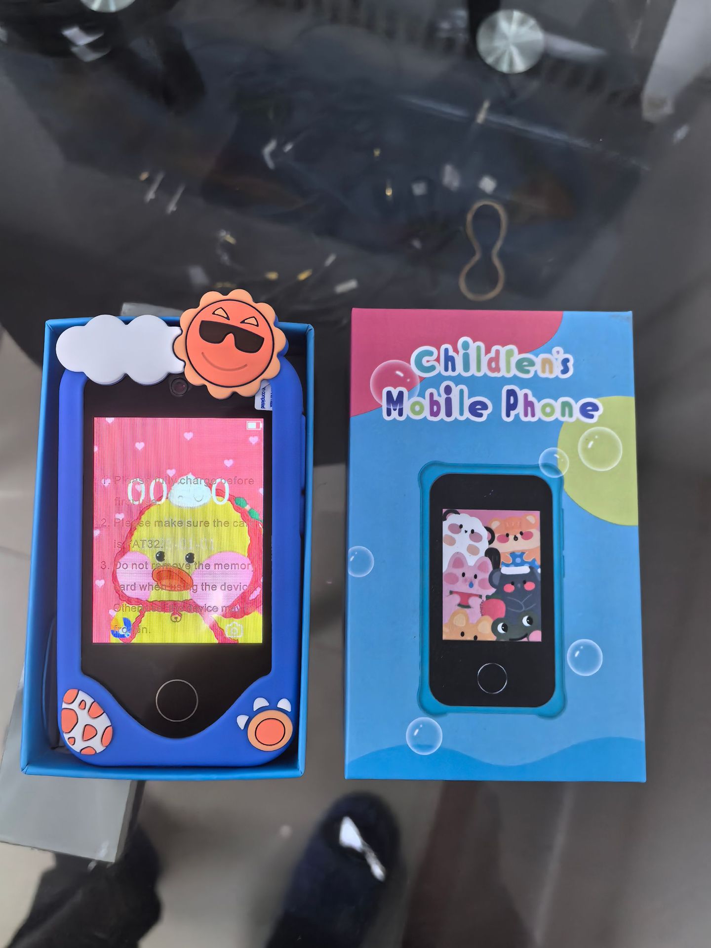 本产品儿童手机S5,主要特点是大屏幕2.8寸可触摸功能,有手电简,时间,秒表,可以拍照,录像,大头贴变化,玩小游戏等功能,支持32G内存卡,配件有说明书,充电线,TPV软胶壳(后面可印自己喜欢的图案),挂绳,天地盒子。
