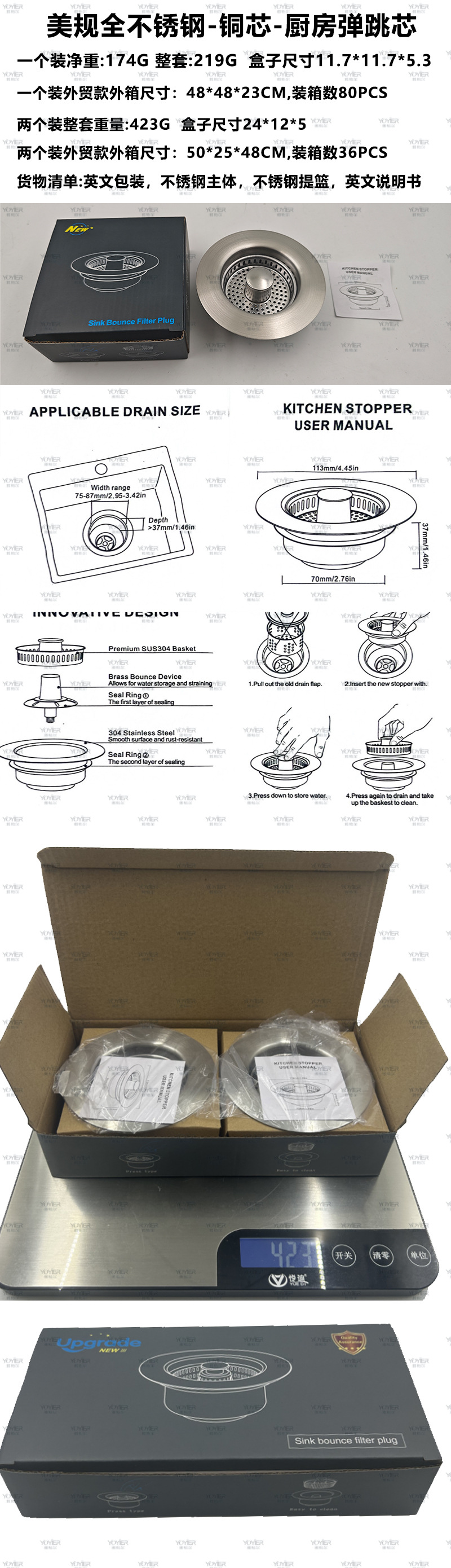 ♔ 스테인레스 스틸 주방 싱크대 바운스 코어 누수 플러그 필터 배수구 세탁 싱크대 세면대 바구니 필터