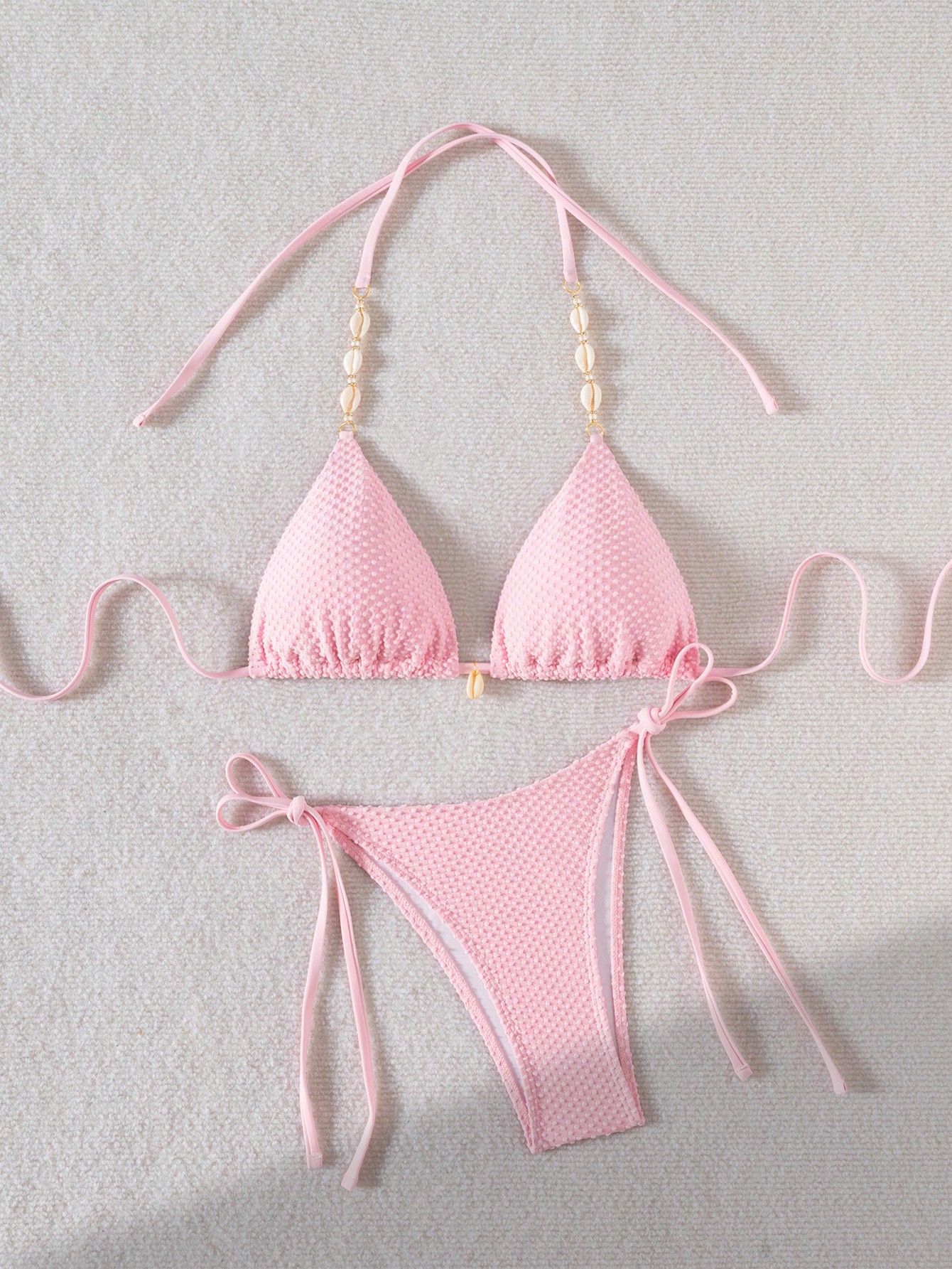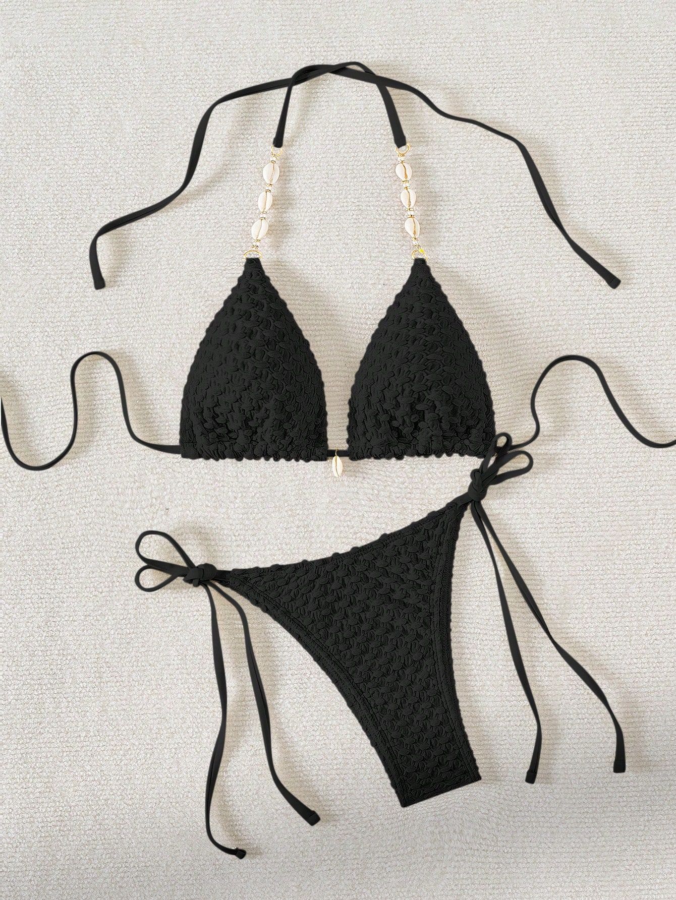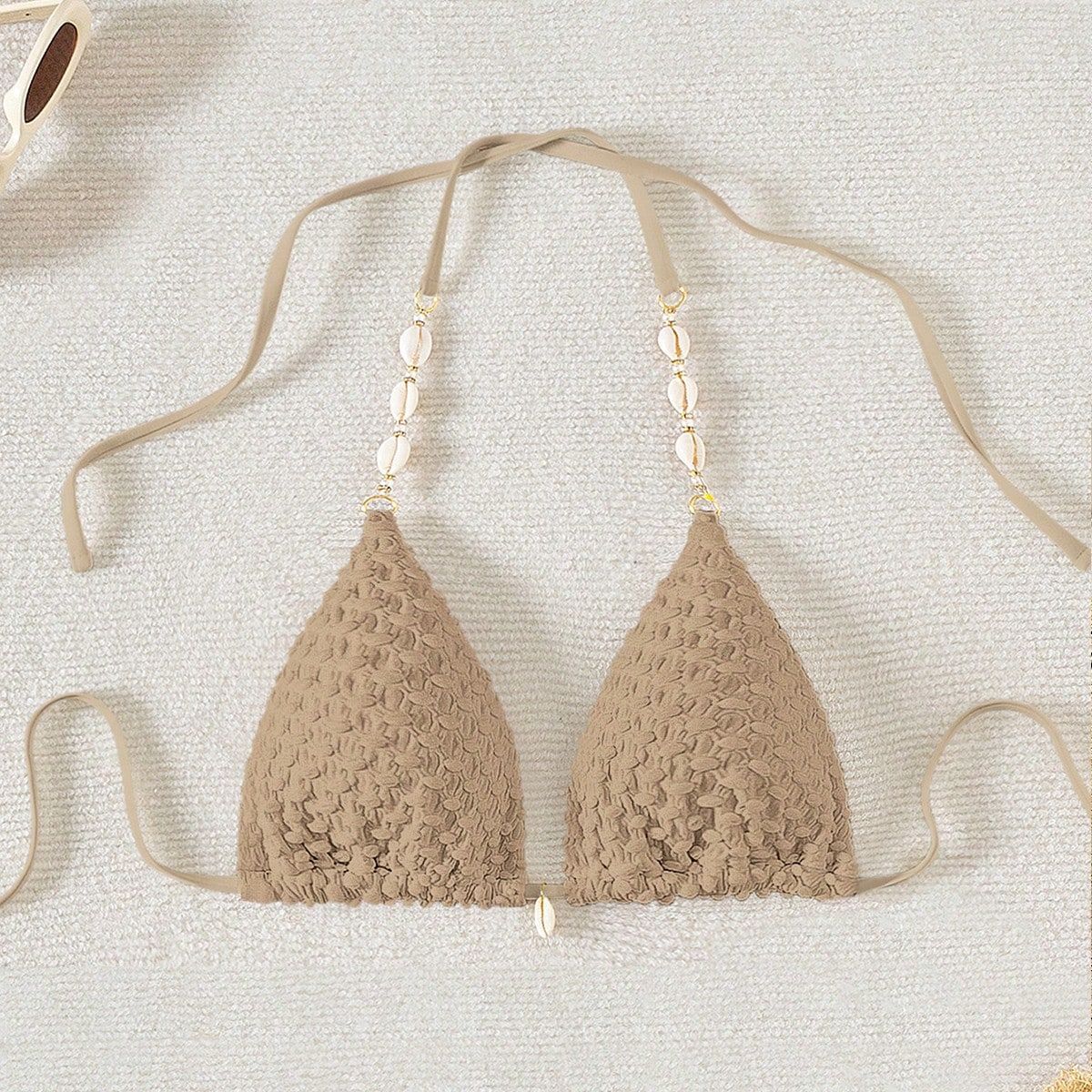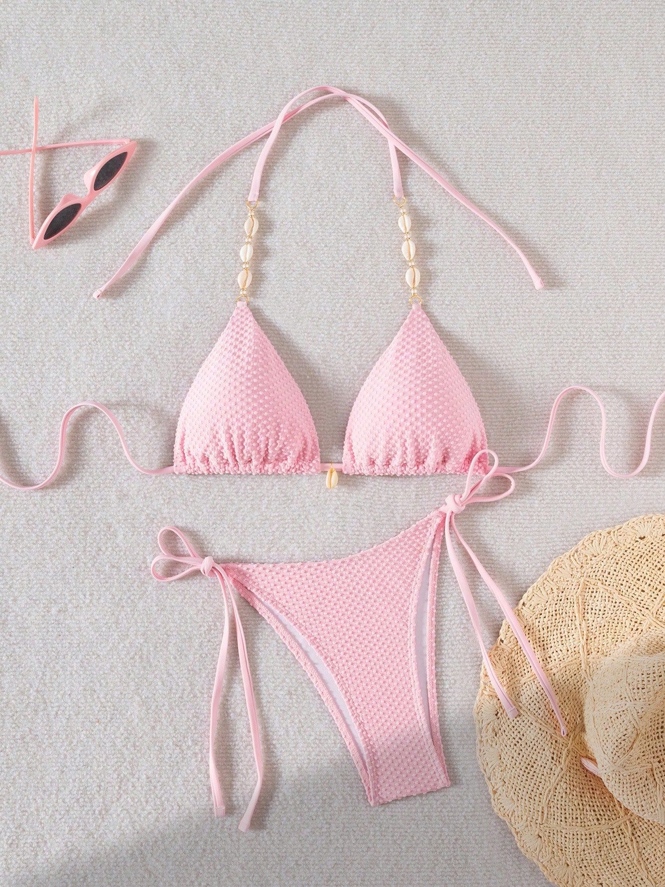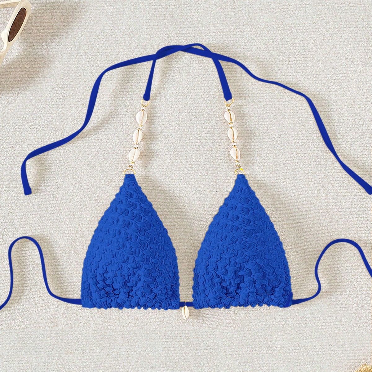2025 유럽과 미국의 수영복 새로운 솔리드 컬러 쉘 섹시한 비키니 레이스 업 홀터 스플릿 비키니 수영복 도매스토어 가기