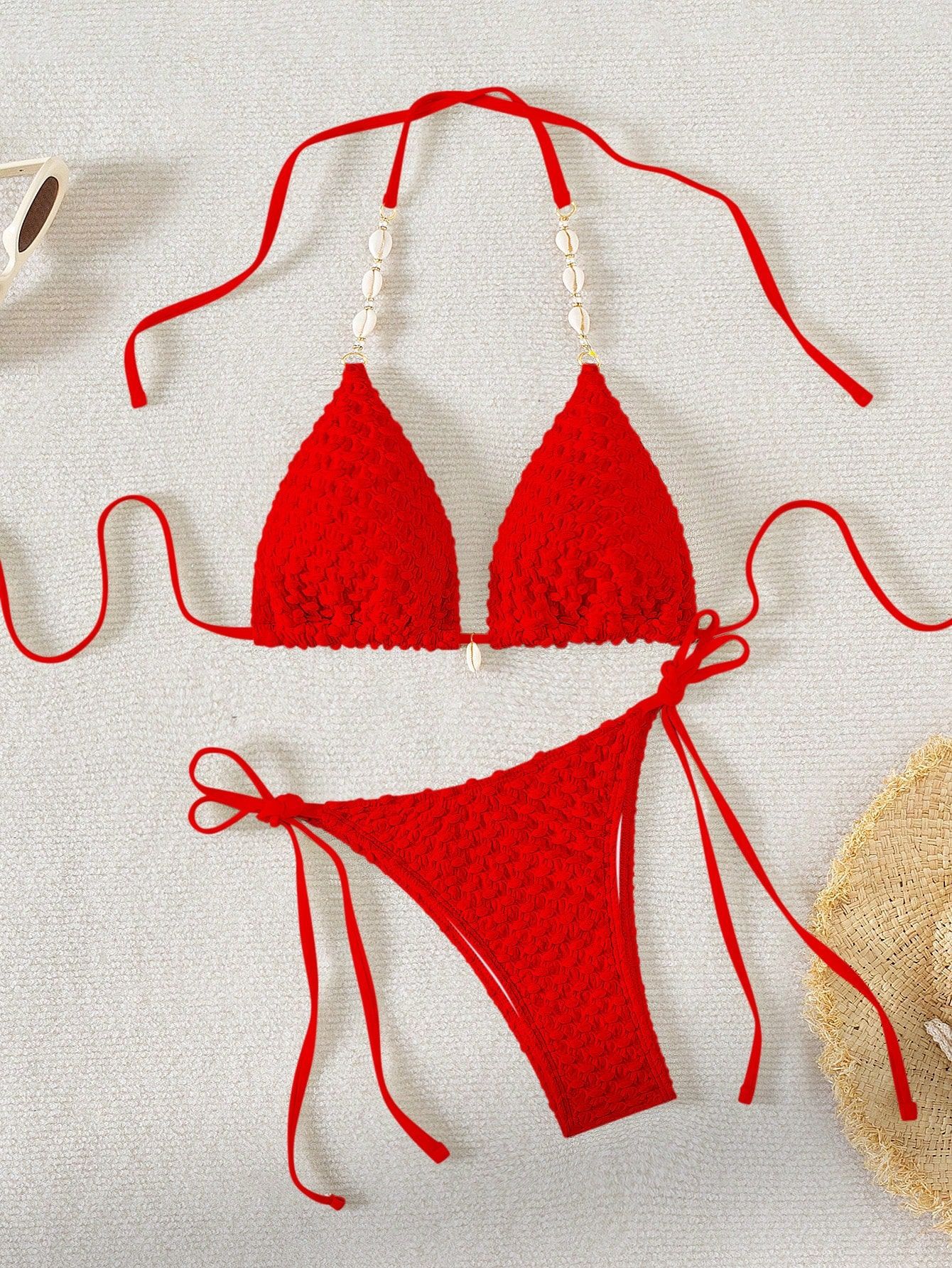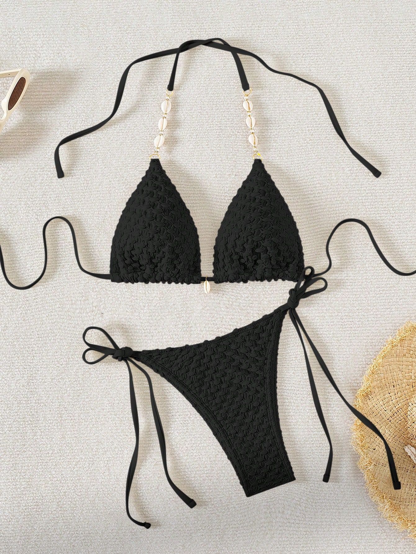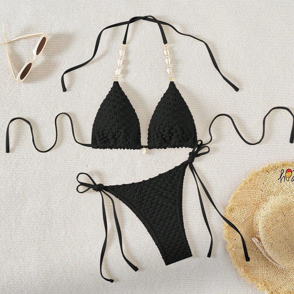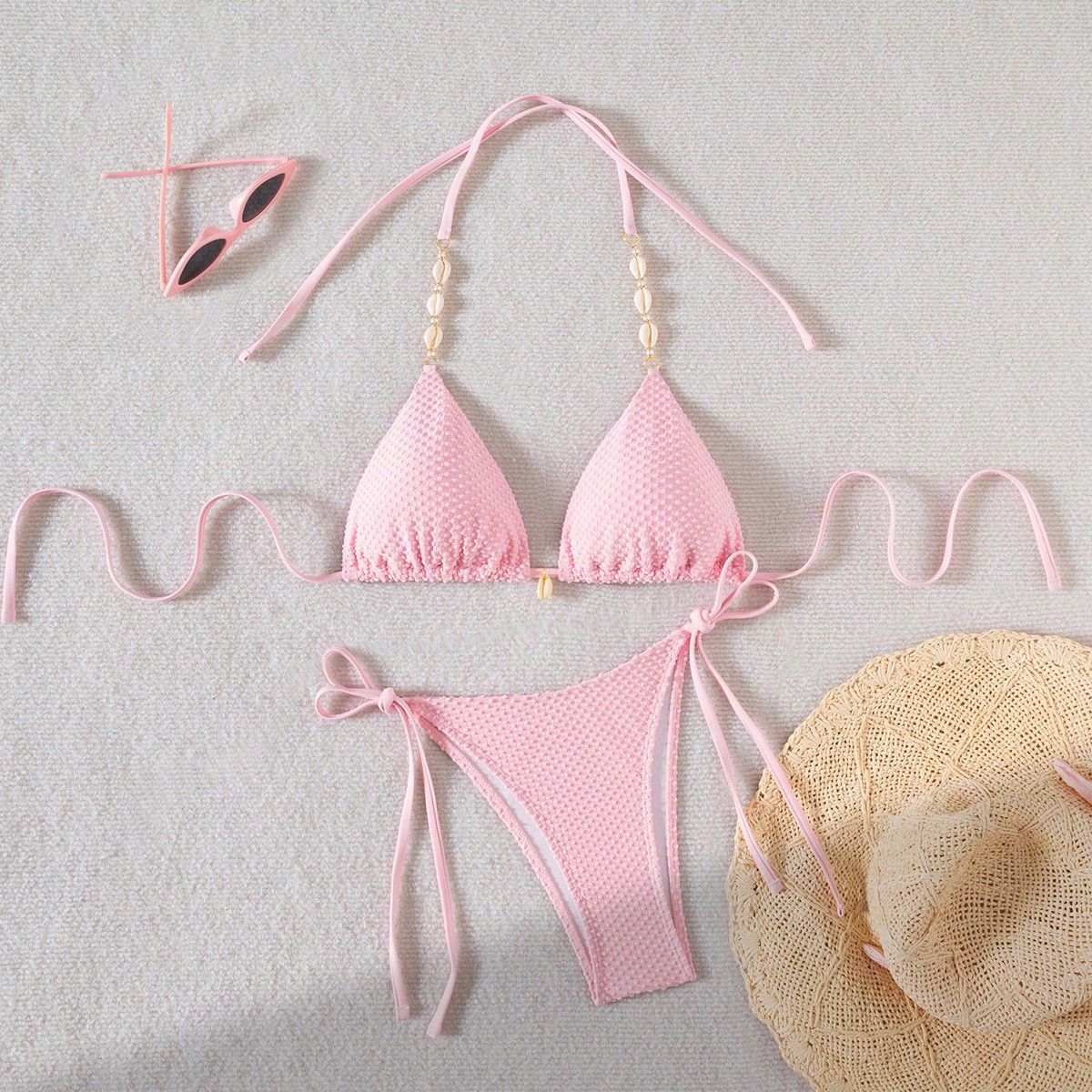 2025 유럽과 미국의 수영복 새로운 솔리드 컬러 쉘 섹시한 비키니 레이스 업 홀터 스플릿 비키니 수영복 도매