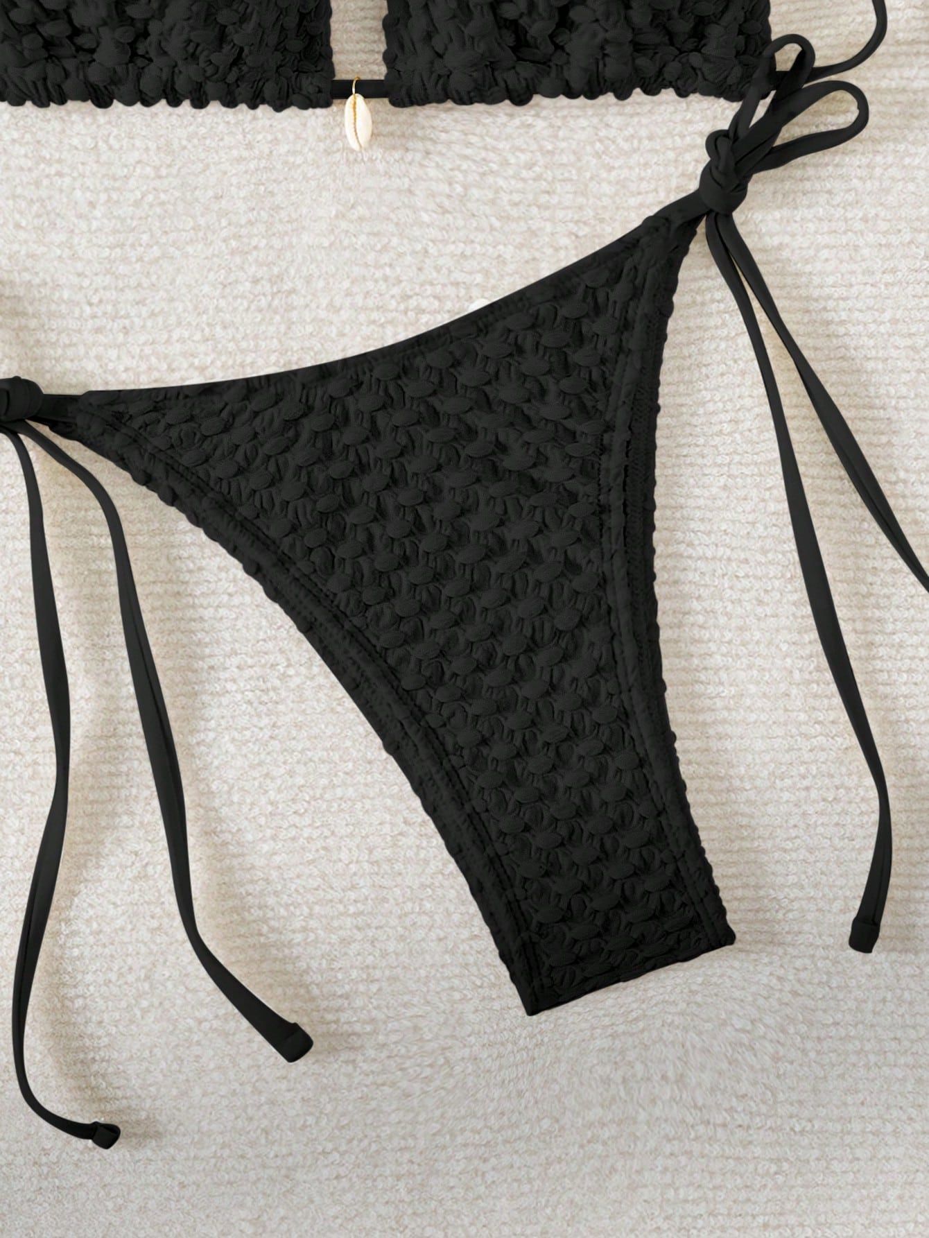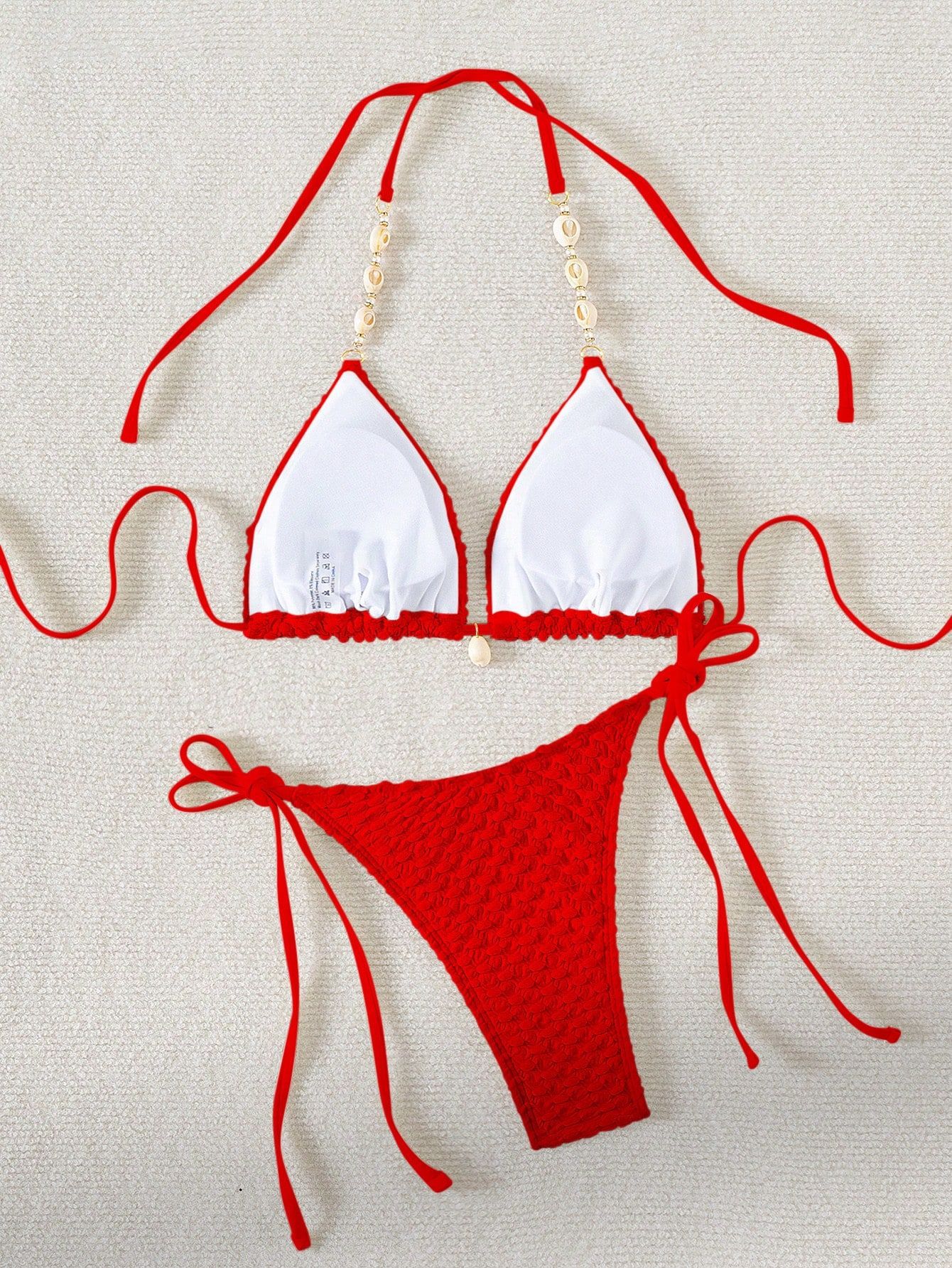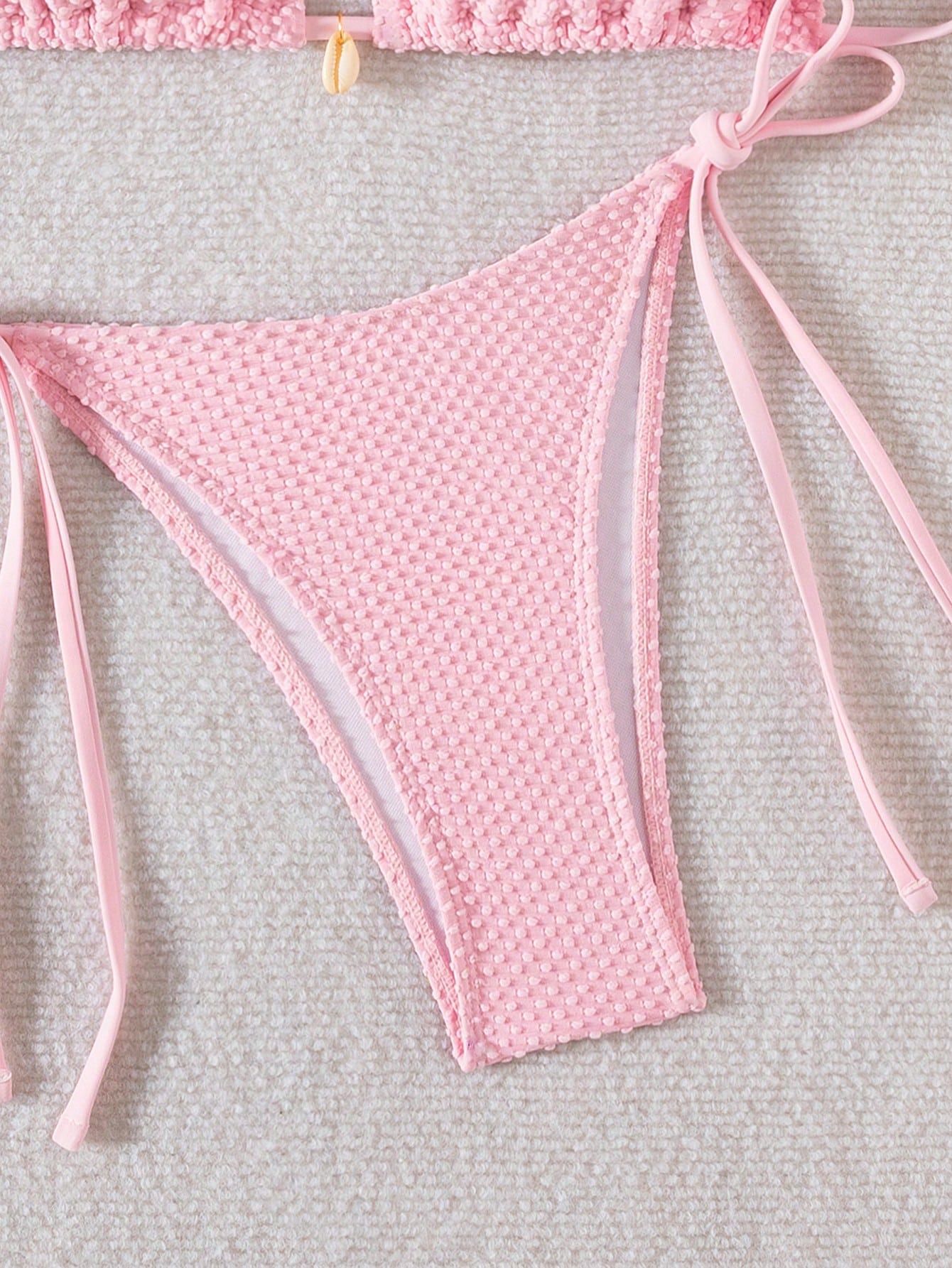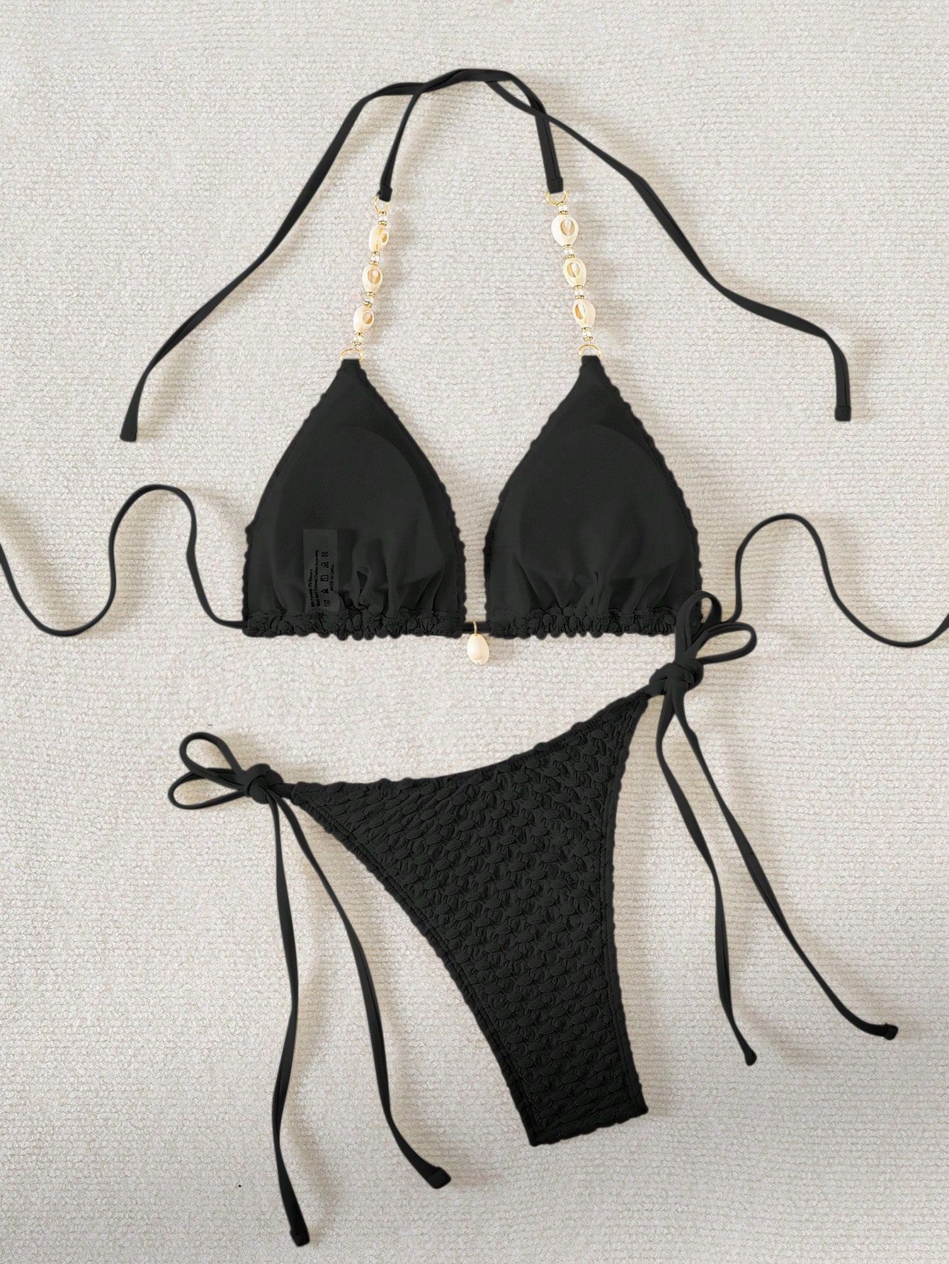 2025 유럽과 미국의 수영복 새로운 솔리드 컬러 쉘 섹시한 비키니 레이스 업 홀터 스플릿 비키니 수영복 도매