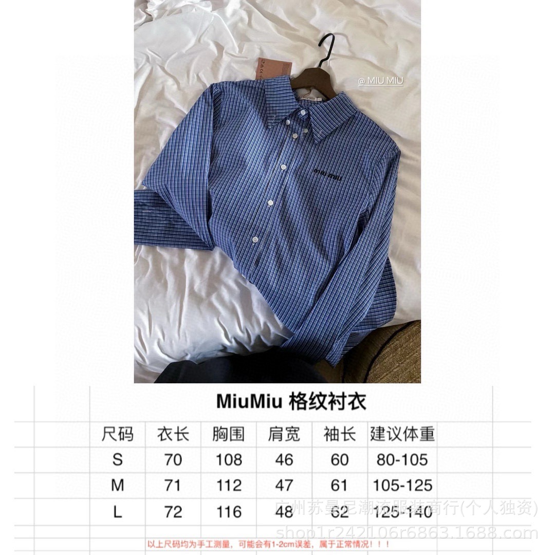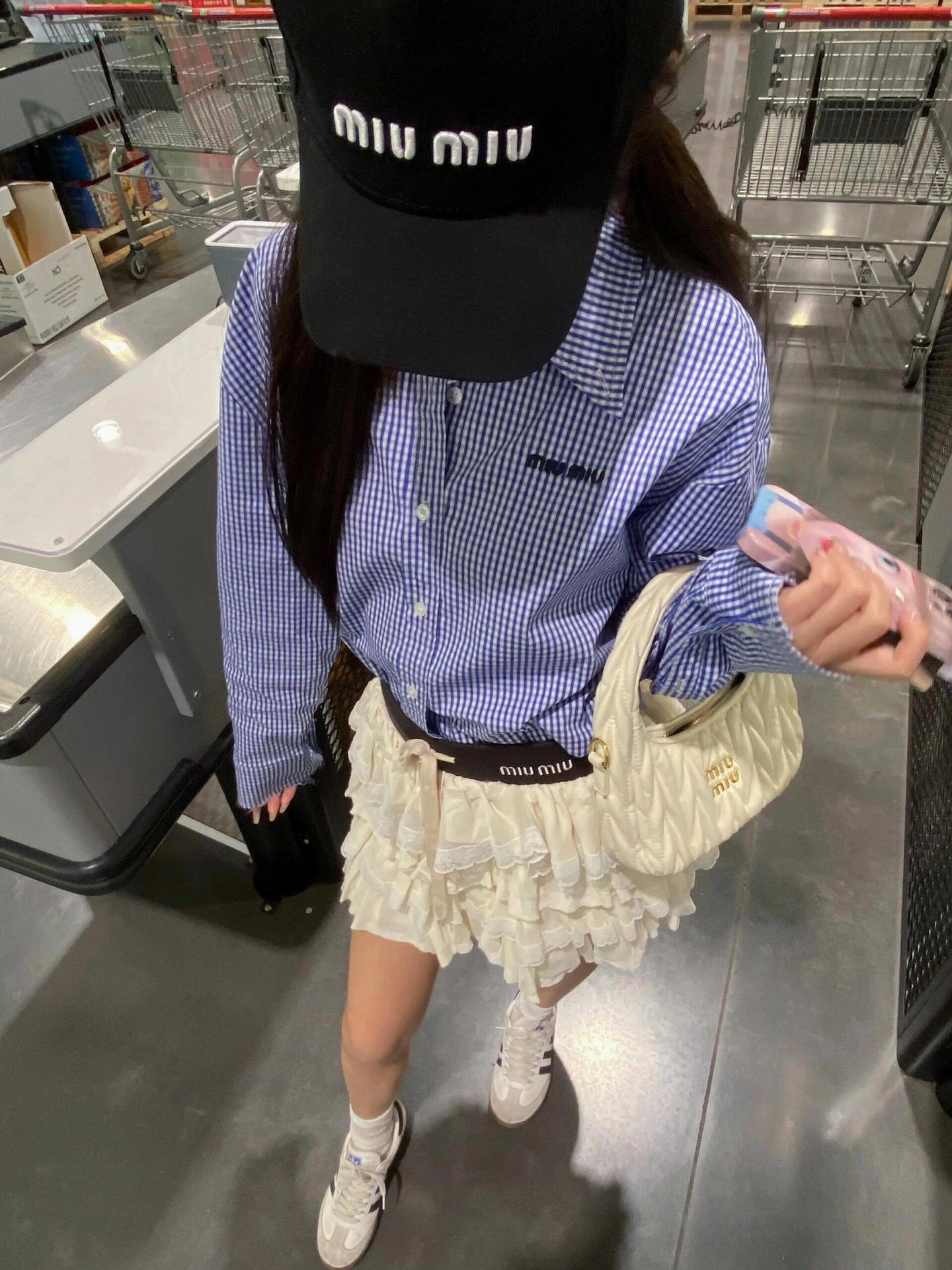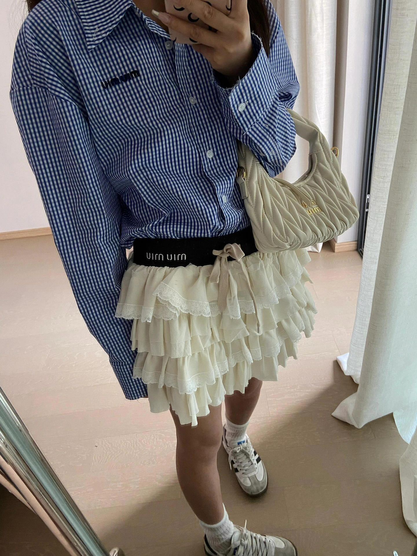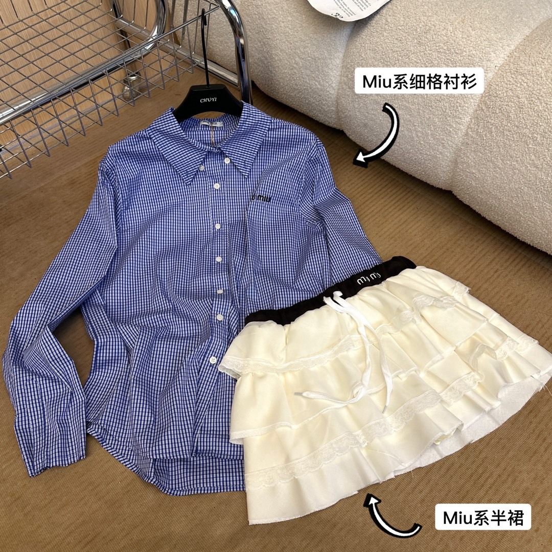 미우 그레이 레터 자수 지적인 레이어드 체크무늬 셔츠 발레 소녀 퍼프 스커트 슈트스토어 가기