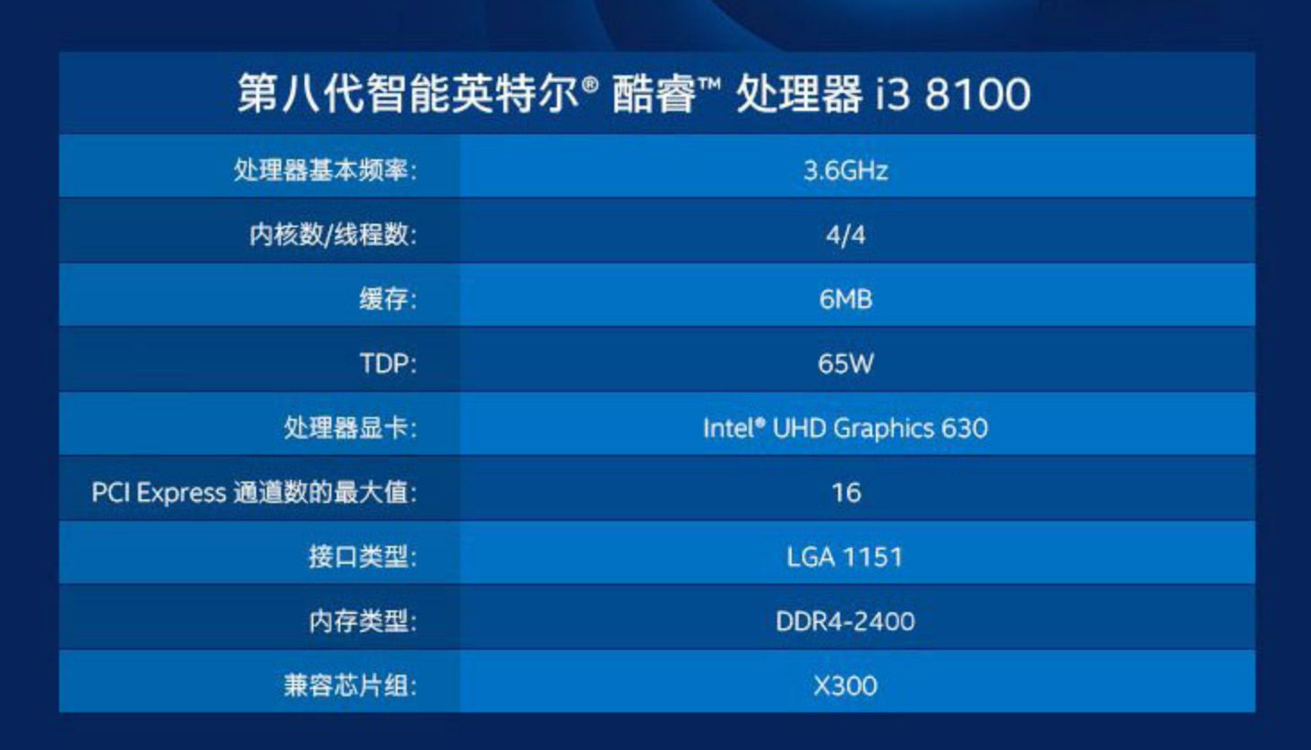 查看: 基本参数适用类型台式机CPU系列酷睿i3 8代系列制作工艺14纳米核心代号Coffee Lake性能参数CPU主频3.6GHz核心数量四核心线程数量四线程三级缓存6MB总线规格DMI3 8GT/s热设计功耗(TDP)65W内存参数支持最大内存64GB内存类型DDR4 2400MHz最大内存通道数2ECC内存支持是显卡参数集成显卡英特尔 超核芯显卡 630显卡基本频率350MHz显卡最大动态频率1.1GHz显卡其它特性DirectX支持:12