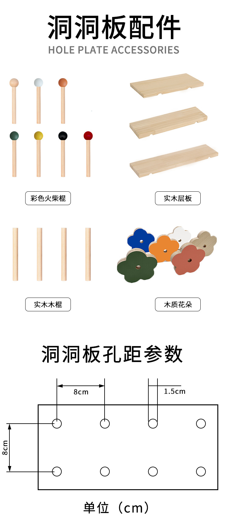 홀 보드 액세서리, 대형 성냥 막대, 둥근 구멍, 나무 막대, 칸막이, 랙, 후크, 펜던트, 목재 보관함