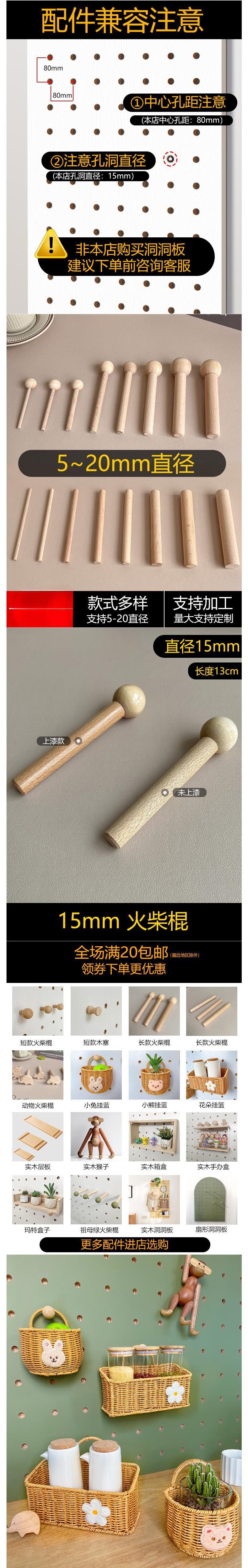 홀 보드 액세서리 단단한 나무 범용 후크 선반 나무 둥근 구멍 성냥 막대 15mm 나무 막대 삽입 나무 막대 걸이 못스토어 가기