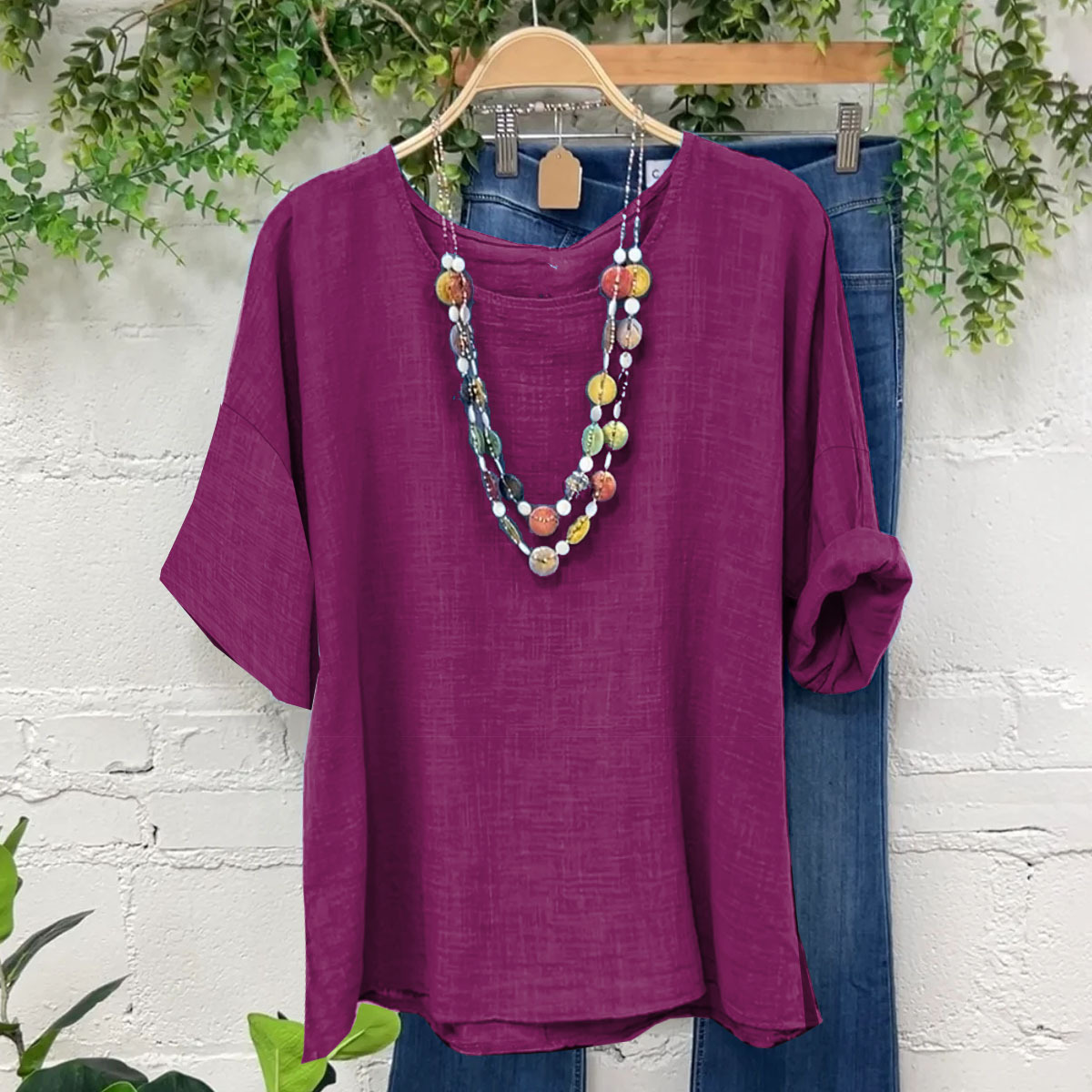 2025 Amazon shein 크로스보더 독립 스테이션 유럽과 미국의 면 및 린넨 라운드 넥 탑 새로운 핫 스타일