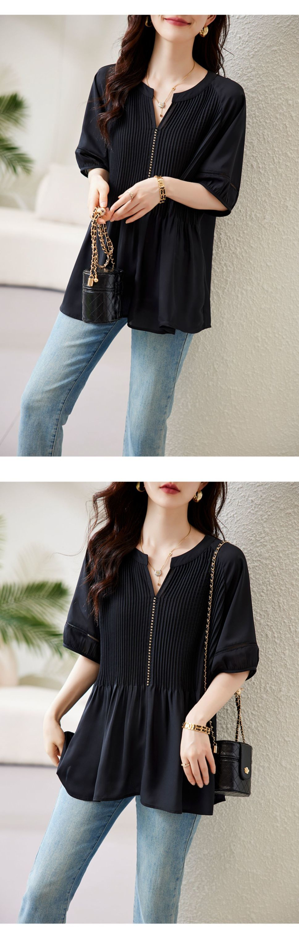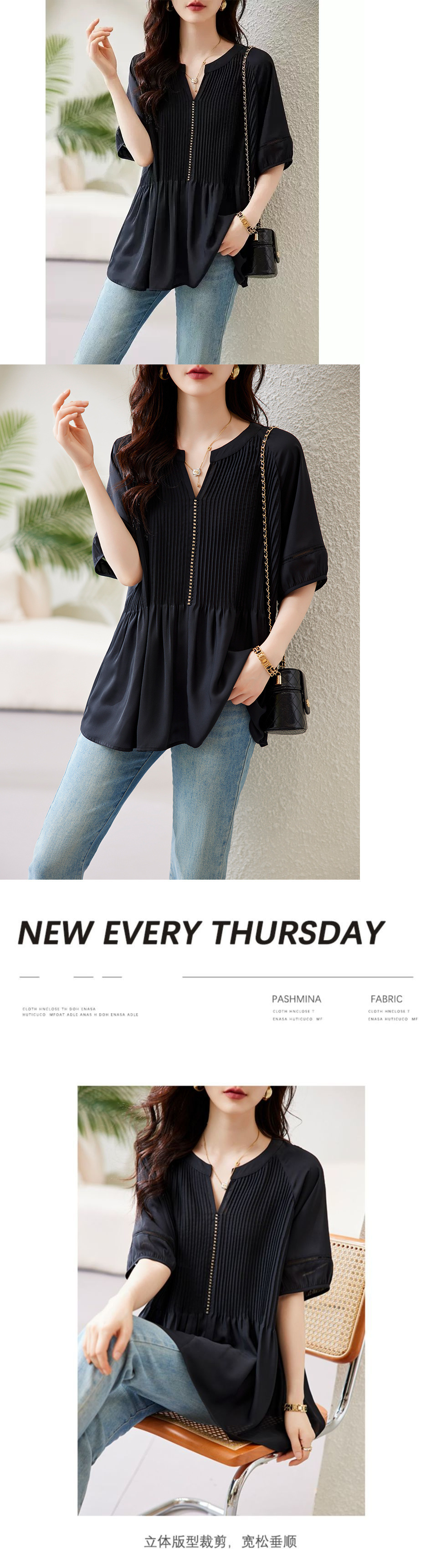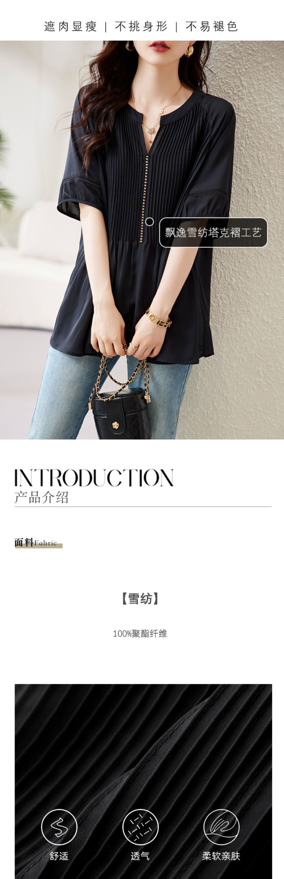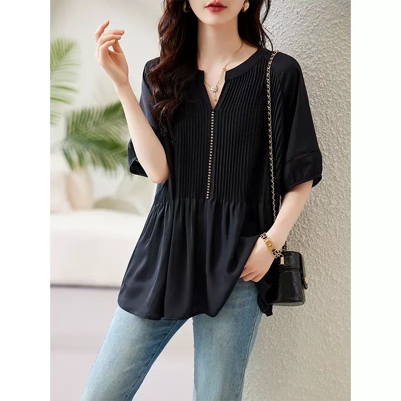 여성용 블랙 브이넥 쉬폰 셔츠, 여름 유럽 스타일, 루즈하고 세련된 셔츠, 빅사이즈, 뚱뚱한 mm, 배를 커버하고 슬리밍 탑스토어 가기