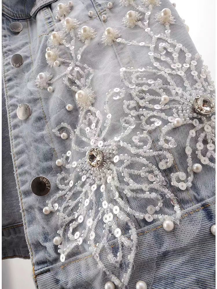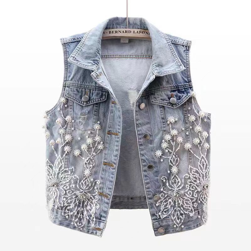 2024 봄 여름 새로운 스타일 헤비 듀티 비즈 꽃 데님 조끼 여성 짧은 찢어진 조끼 조끼 탑스토어 가기