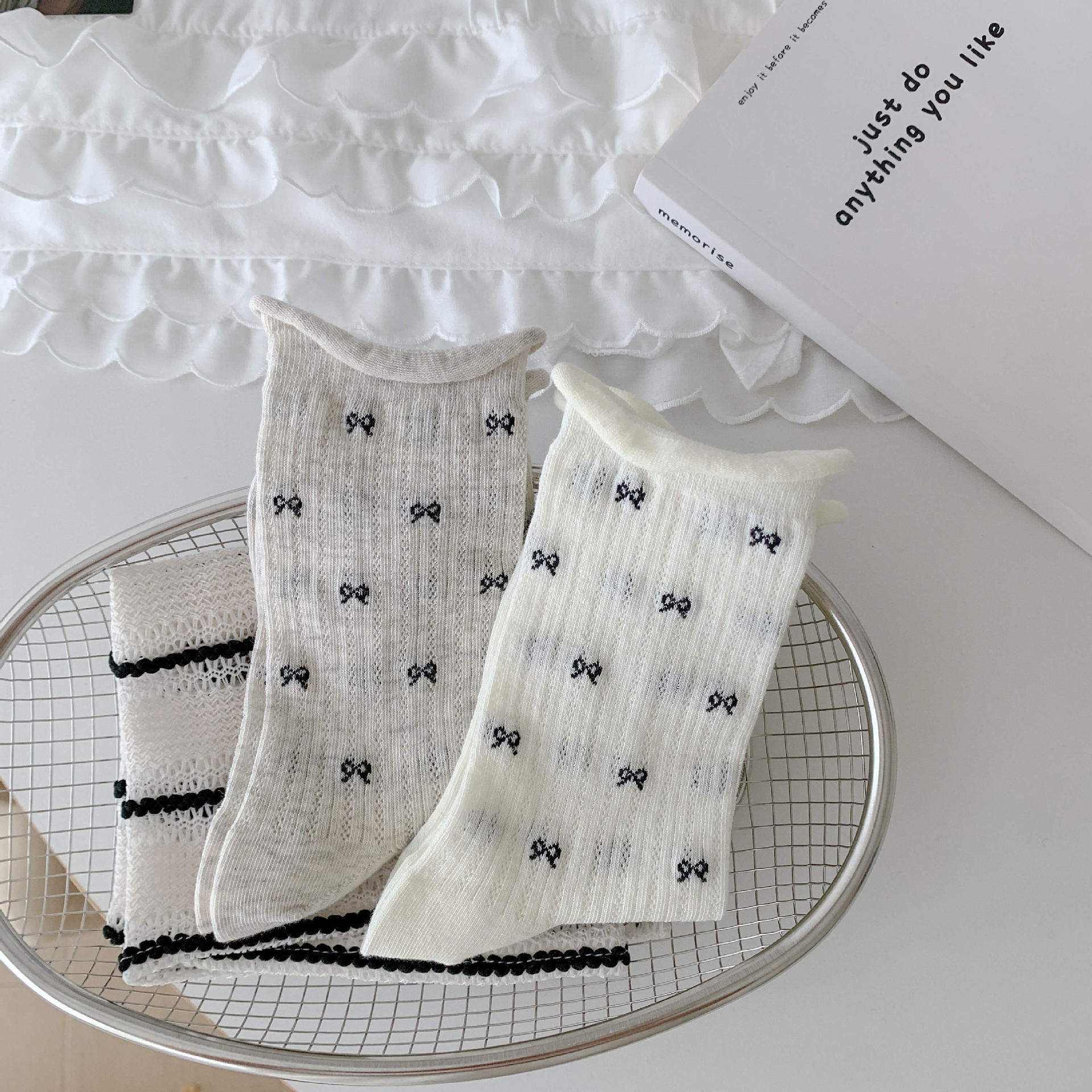 여성을위한 한국 스타일 ins 스타일 보우 양말 봄과 여름 얇은 여성 여름 중공 메쉬 발레 스타일 긴 튜브 양말
