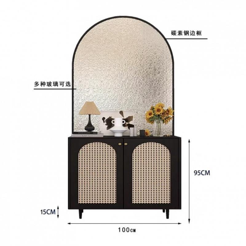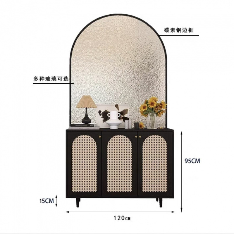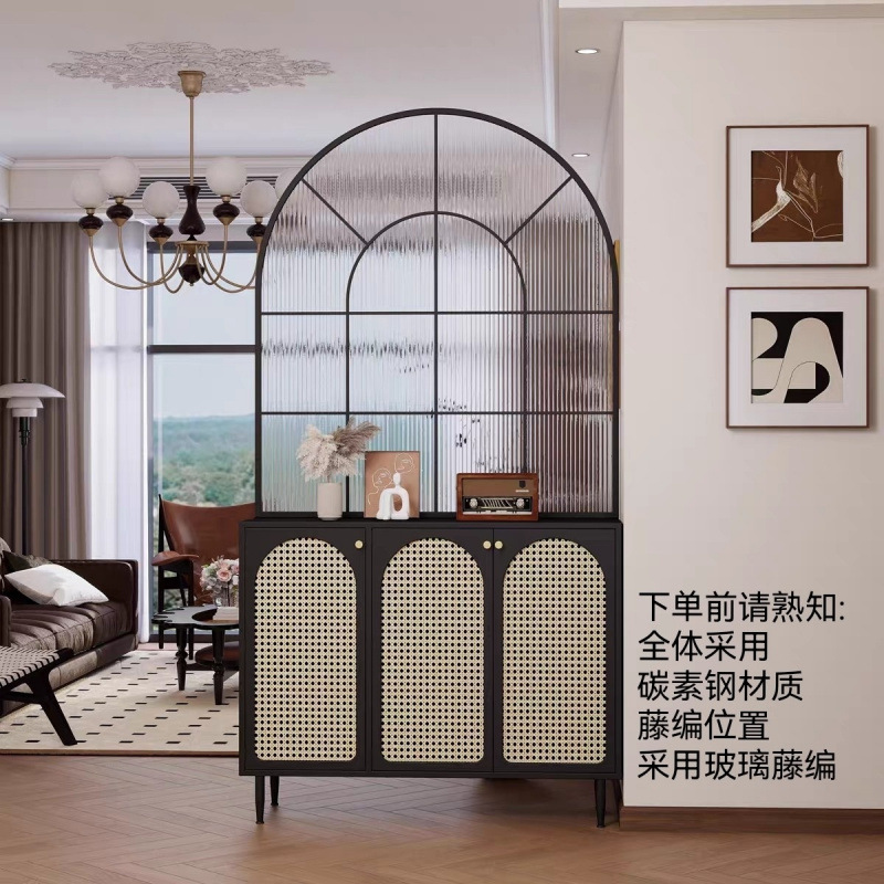 法式复古玄关柜鞋柜一体中古风玻璃铁艺入户正对门屏风藤编隔断柜