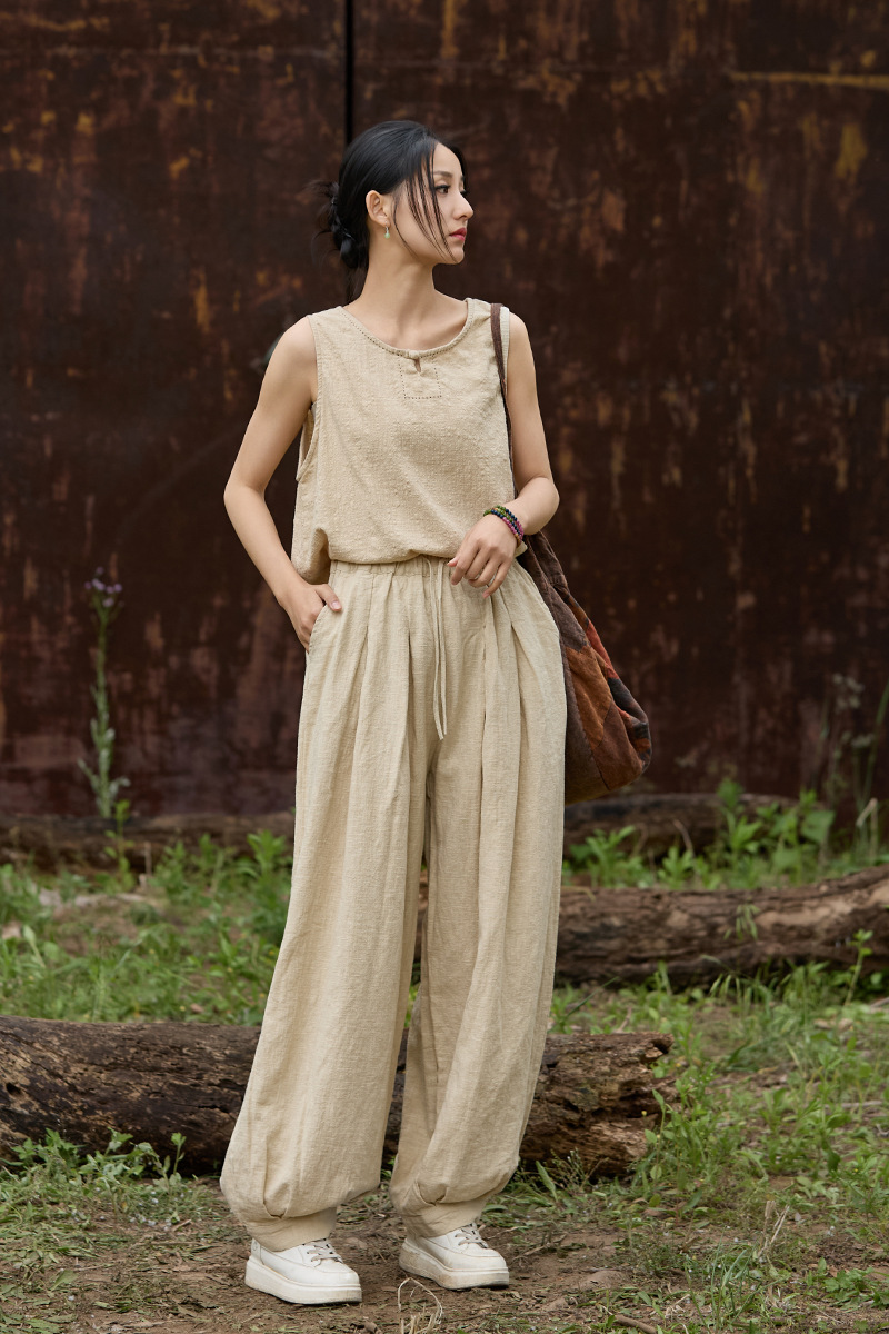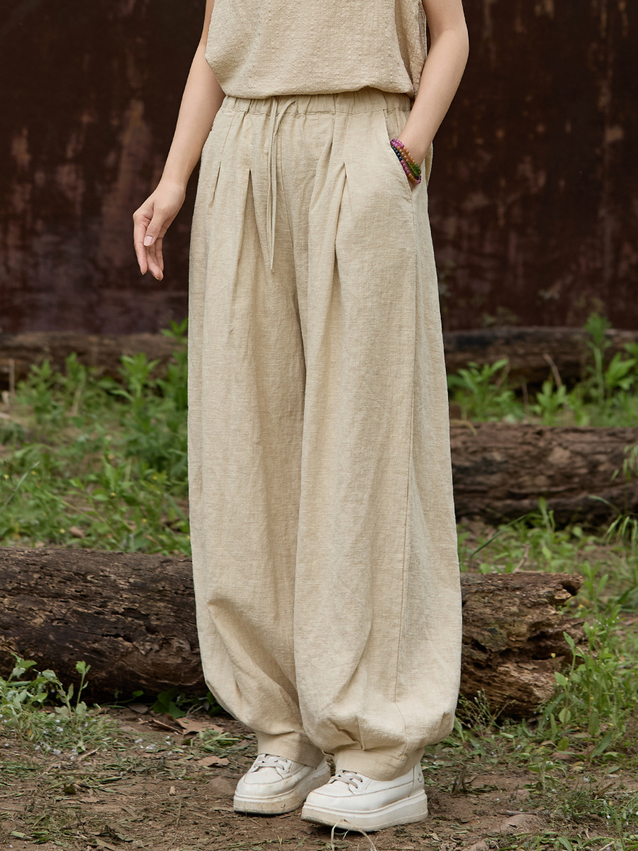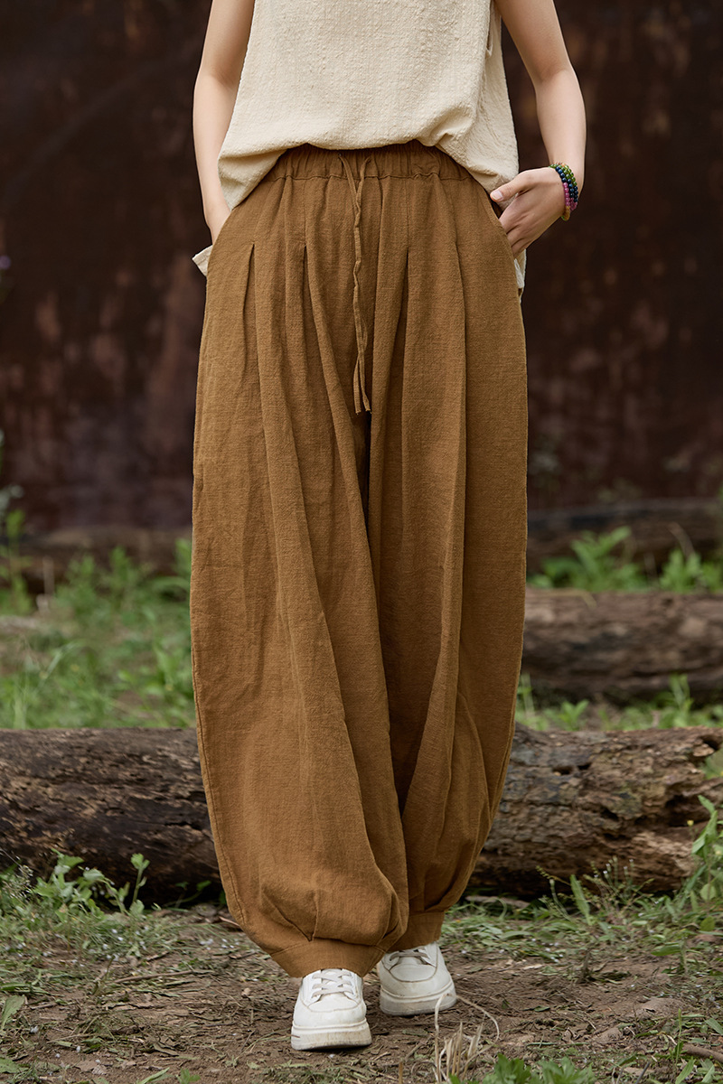 25 가을 겨울 신상 면마 여성복, 모시 샌드워싱 롱 팬츠, 신축성 있는 허리끈, 다용도 여성 캐주얼 팬츠, 랜턴 팬츠