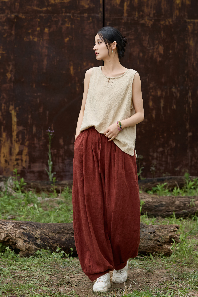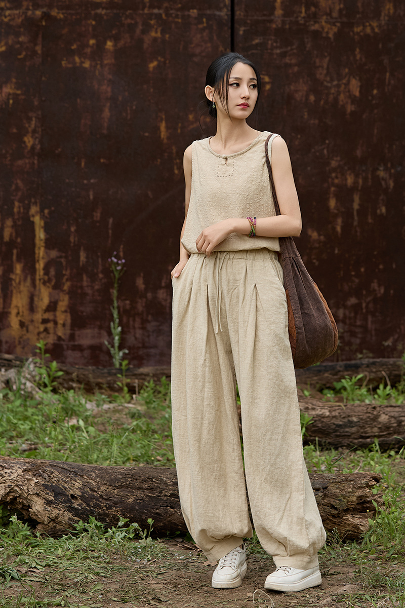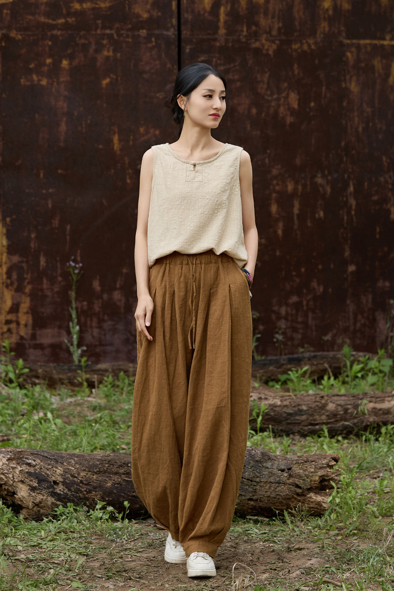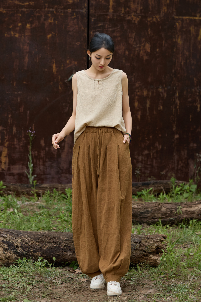 25 가을 겨울 신상 면마 여성복, 모시 샌드워싱 롱 팬츠, 신축성 있는 허리끈, 다용도 여성 캐주얼 팬츠, 랜턴 팬츠