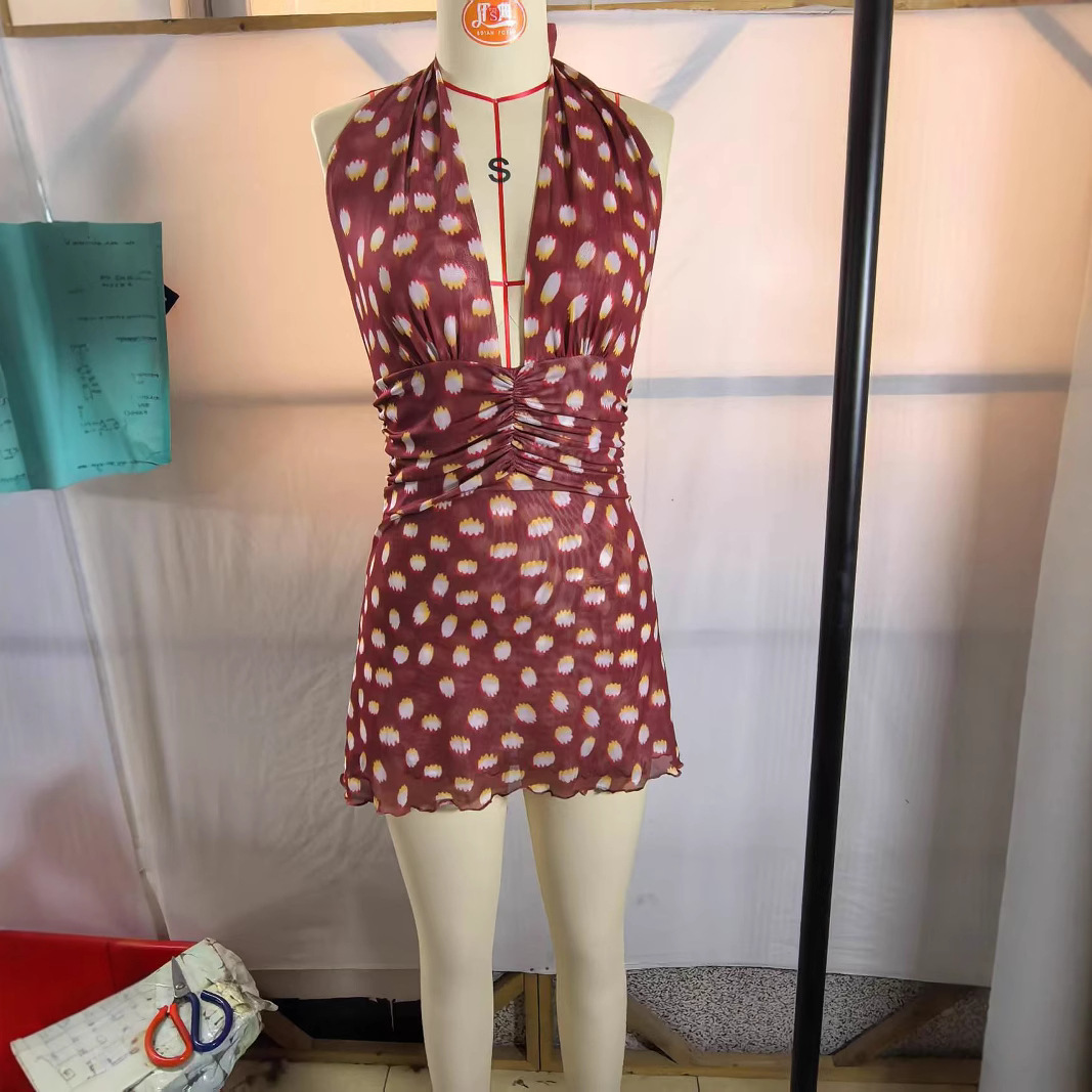 2025 새로운 국경 간 아마존 폴카 도트 디지털 인쇄 유럽과 미국의 홀터넥 백리스 허리 여성 드레스스토어 가기