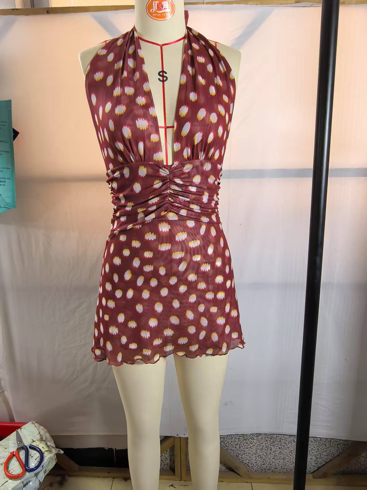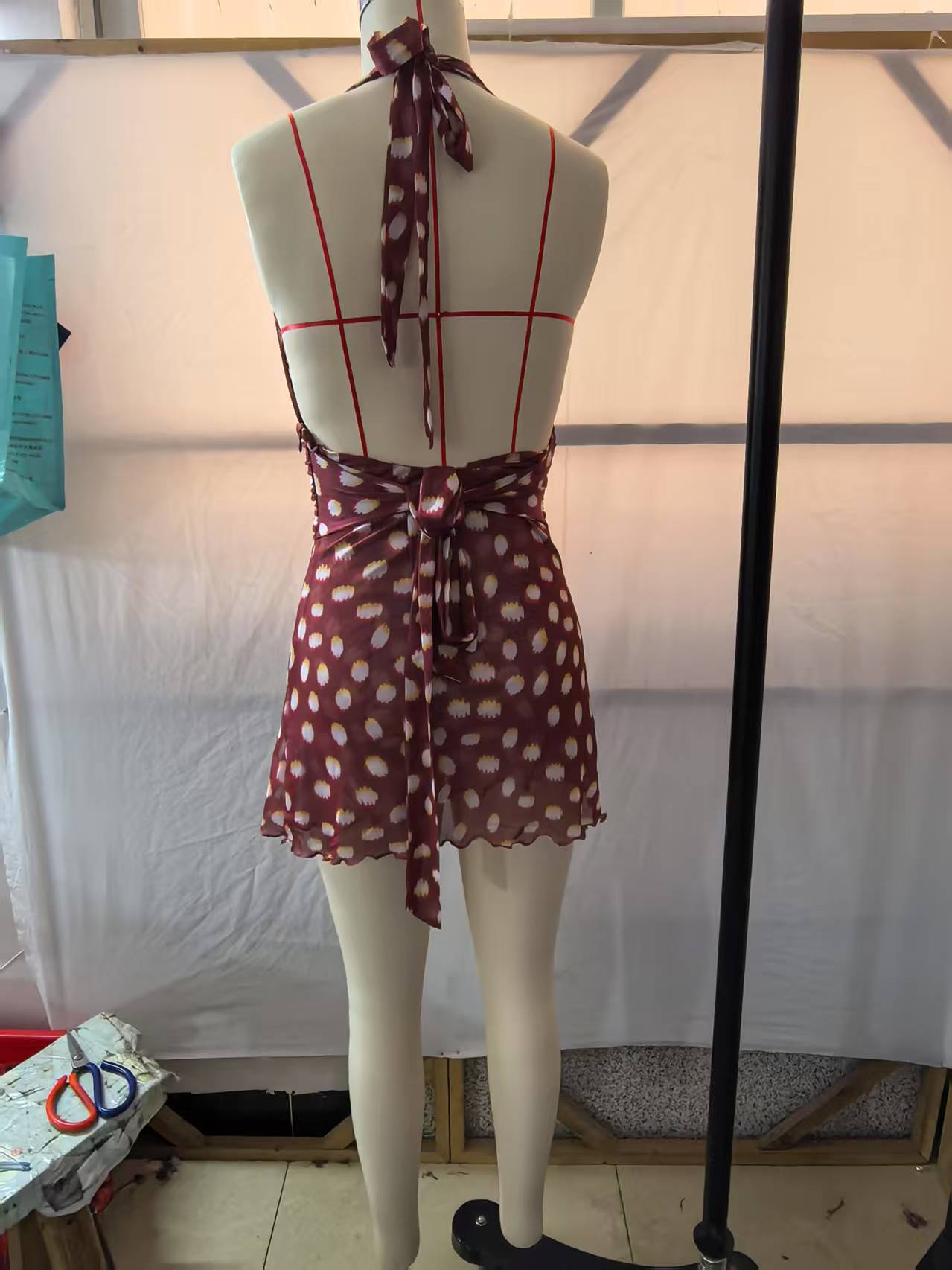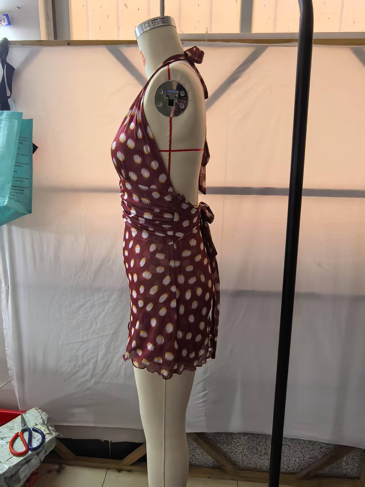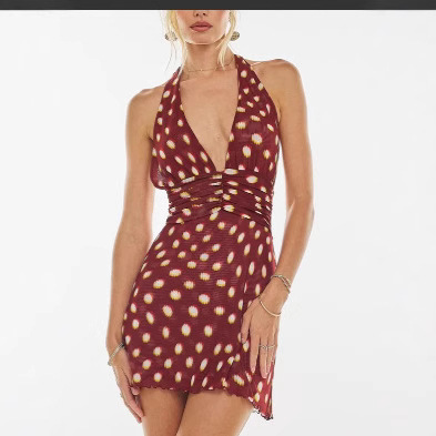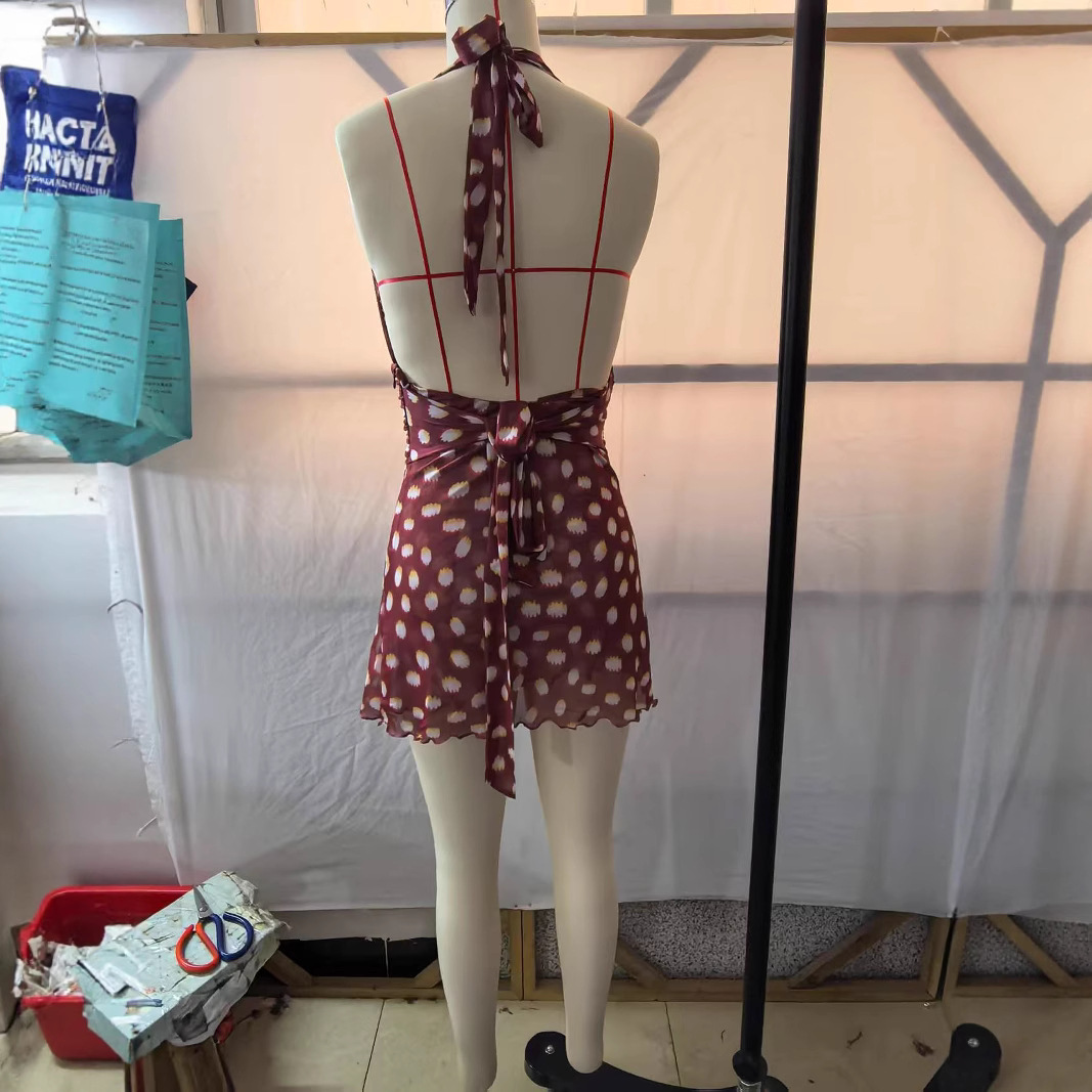 2025 새로운 국경 간 아마존 폴카 도트 디지털 인쇄 유럽과 미국의 홀터넥 백리스 허리 여성 드레스