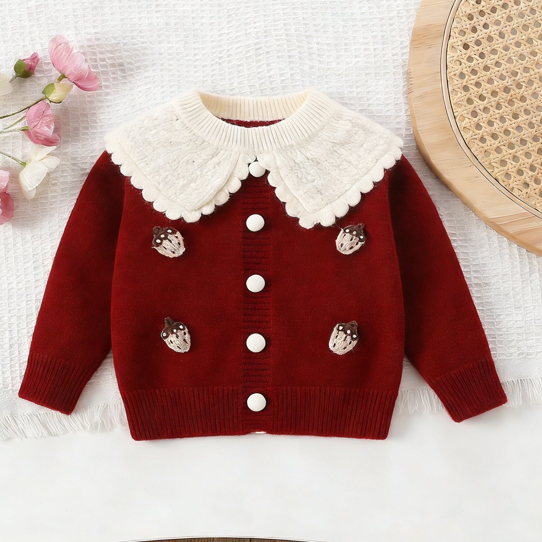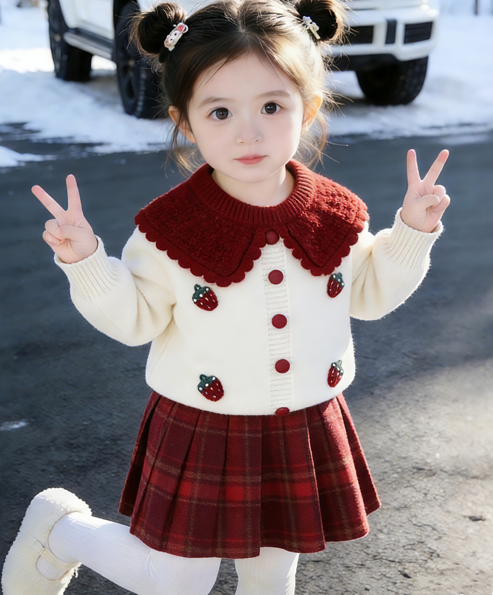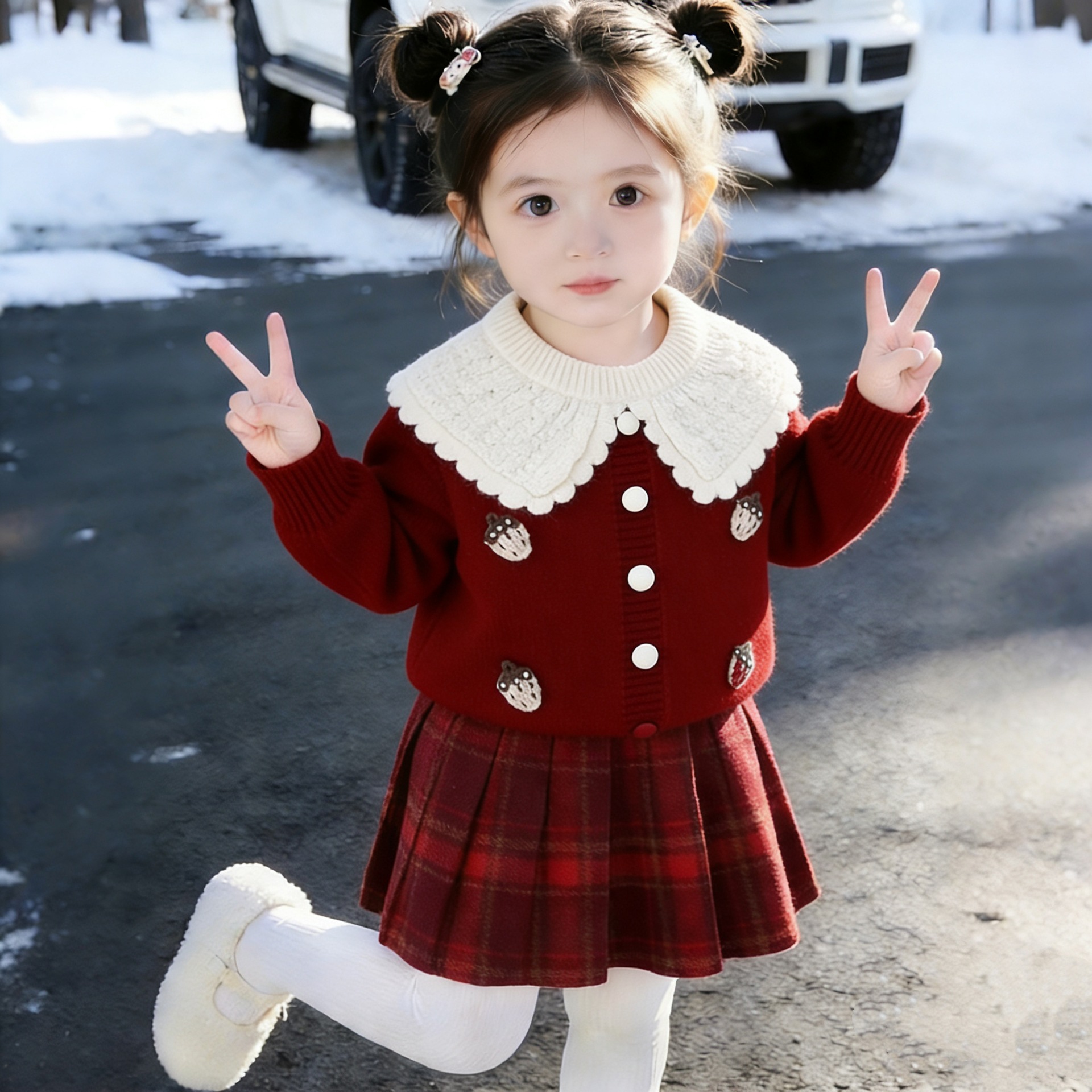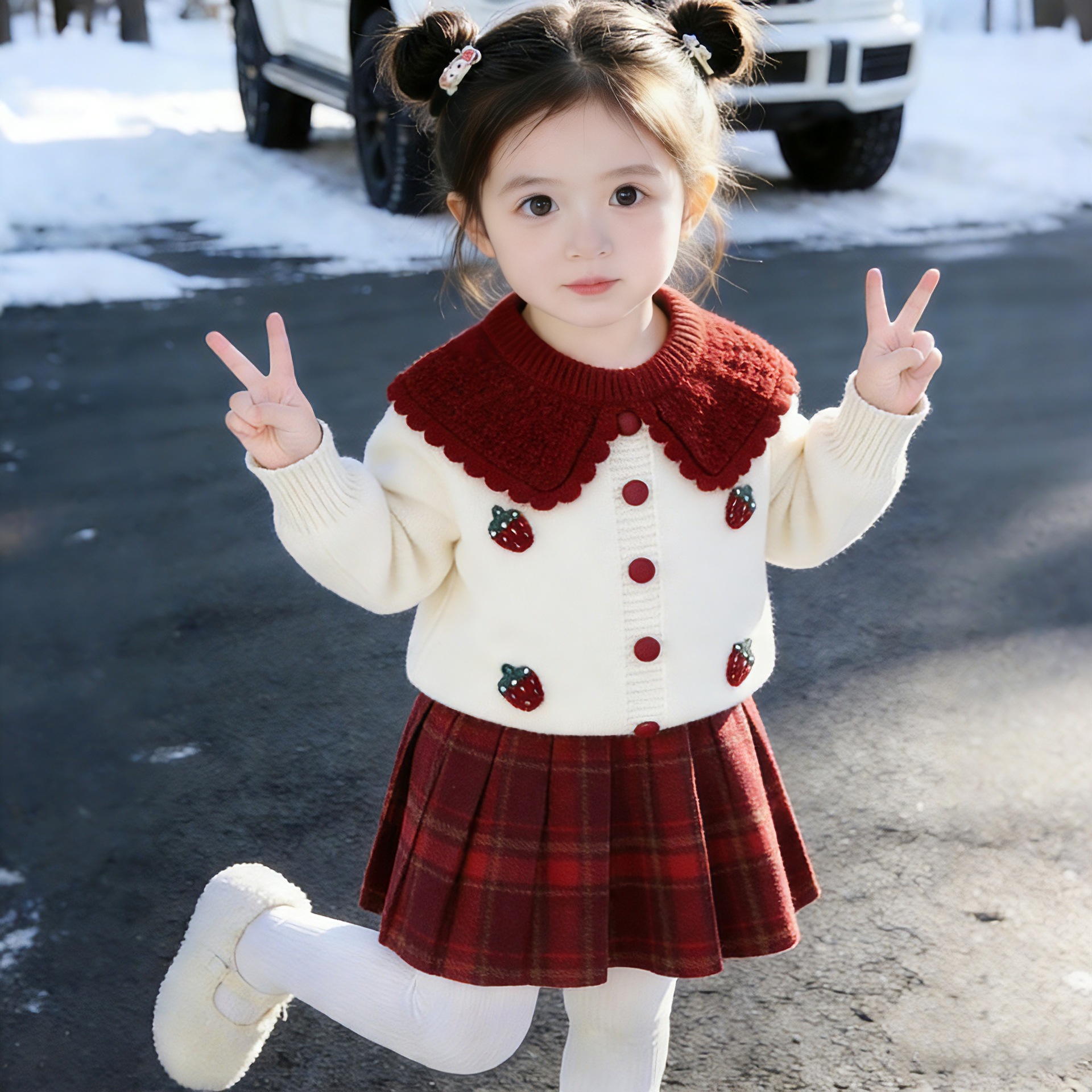 여자 스웨터 격자 무늬 스커트 가을 새 정장 2025 아기 소녀 빨간색 유행 니트 카디건 딸기 옷깃스토어 가기