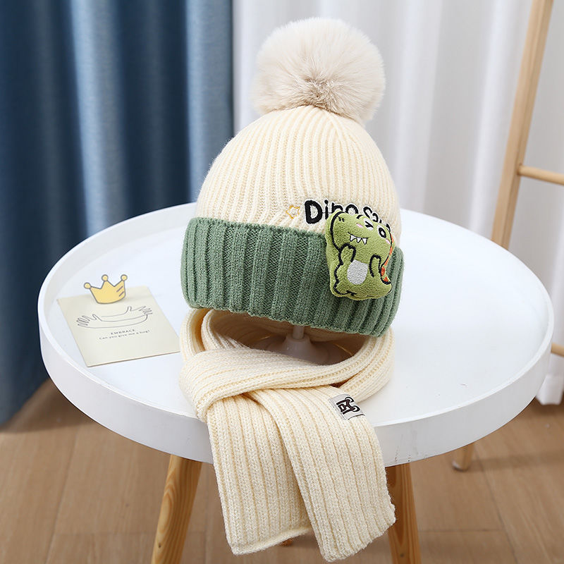 어린이 모자와 스카프 투피스 만화 공룡 남성과 여성의 아기 정장 따뜻한 가을, 겨울 중대형 어린이 모직 모자스토어 가기