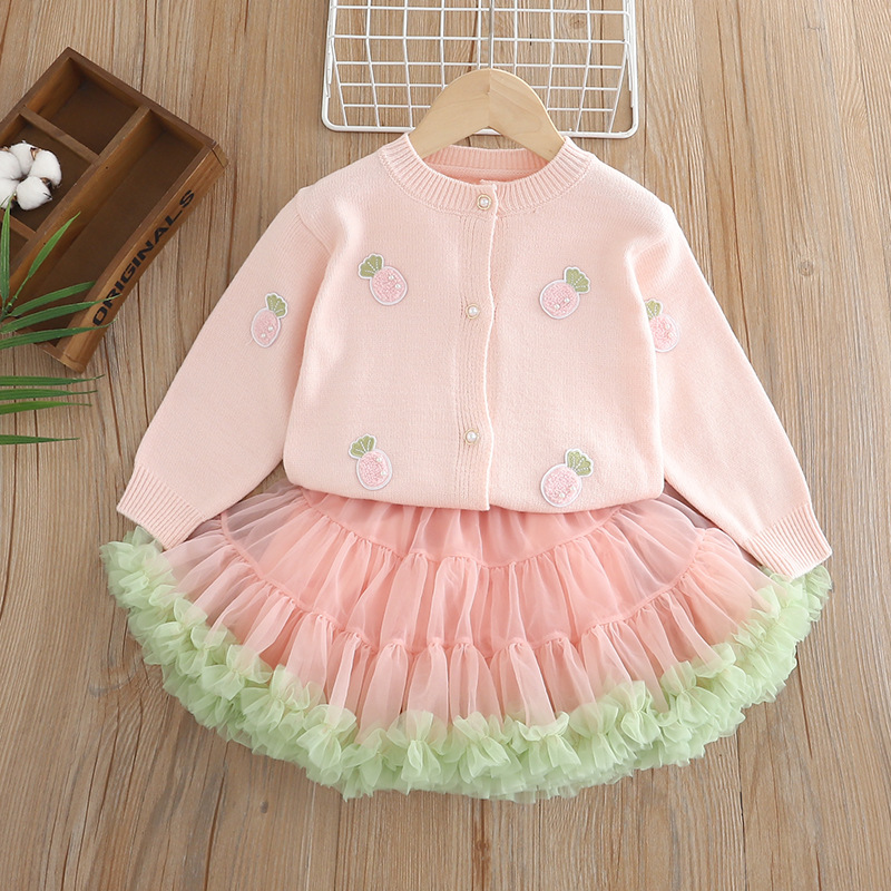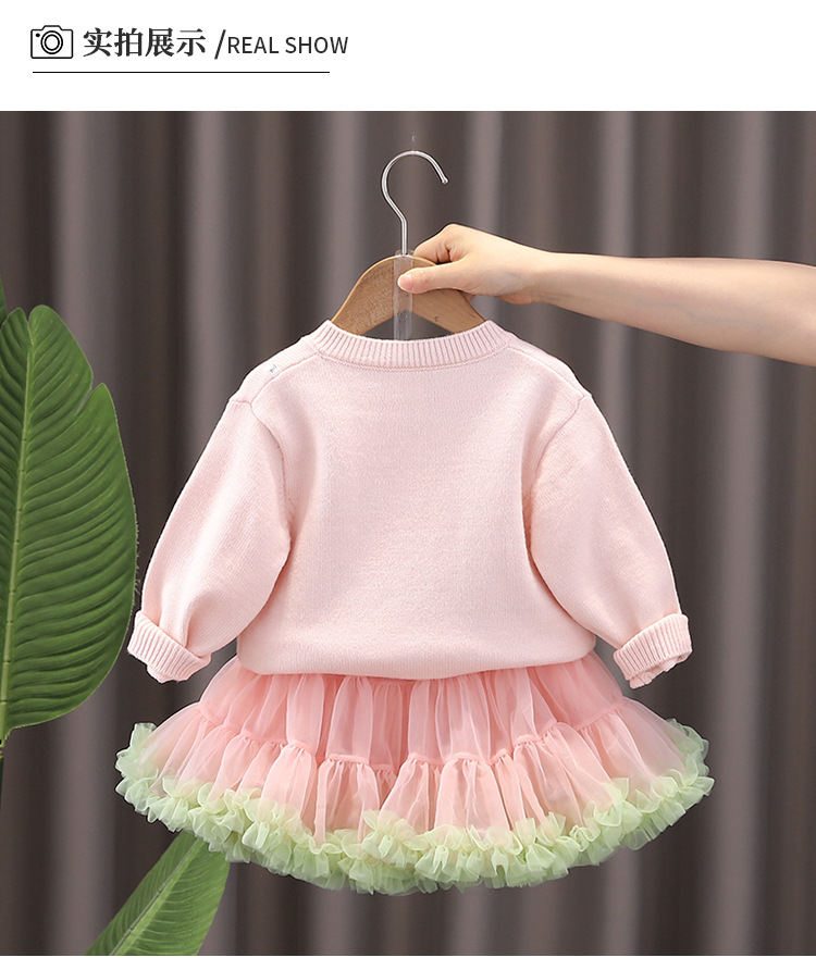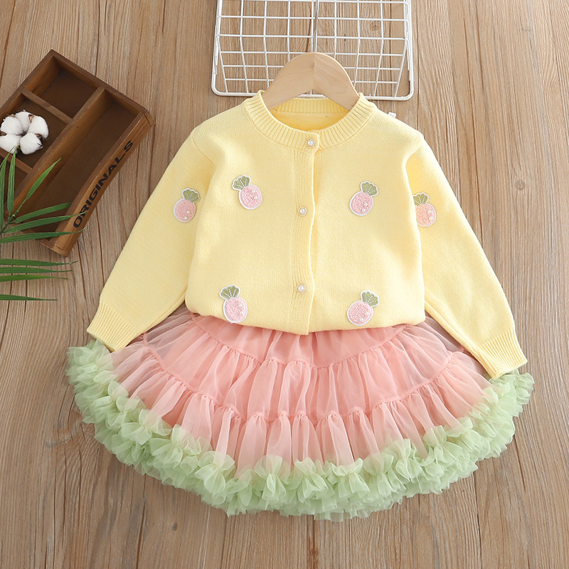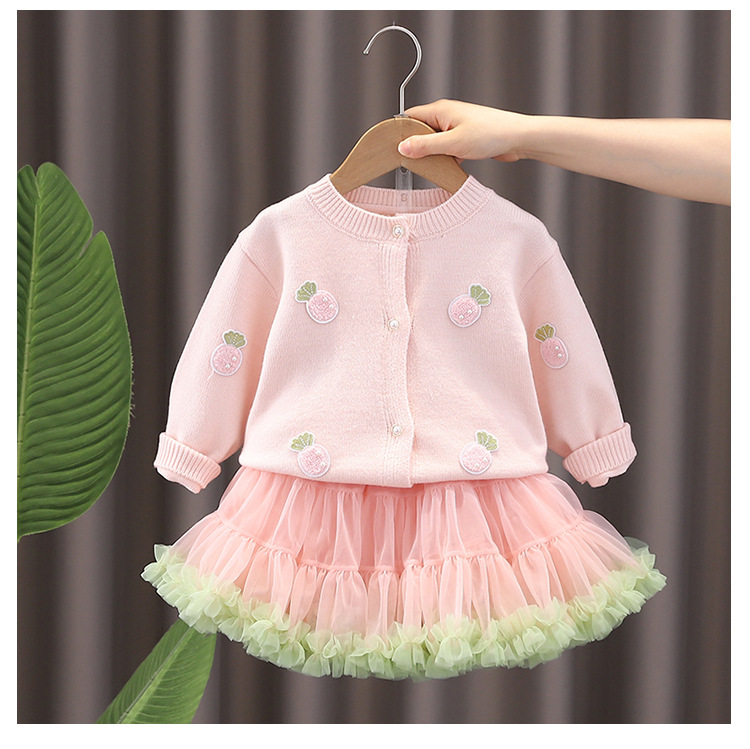 여자 정장 2025 가을, 겨울 새로운 노란색 핑크 스웨터 카디건 공주 스커트 아기 니트 탑 투피스 세트스토어 가기