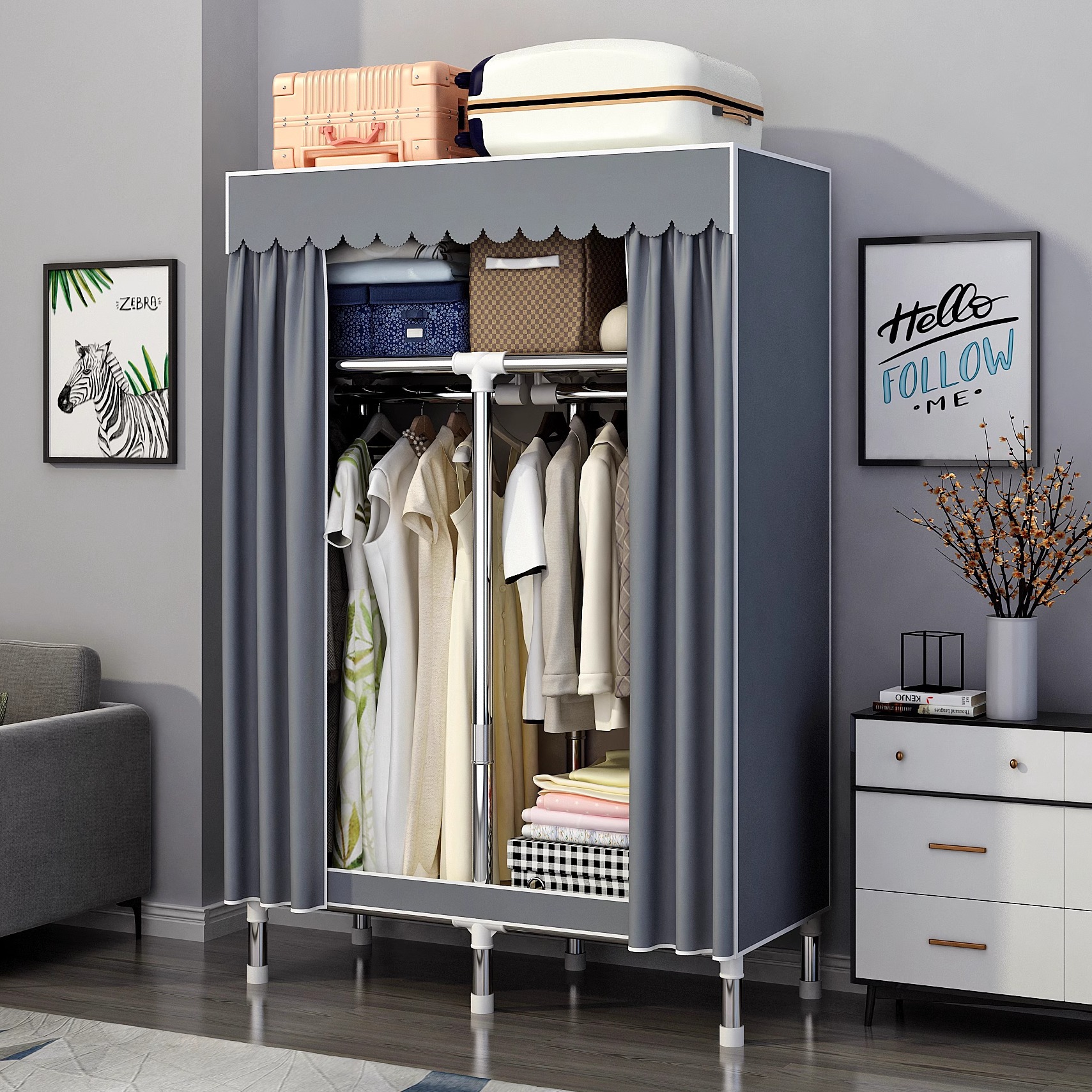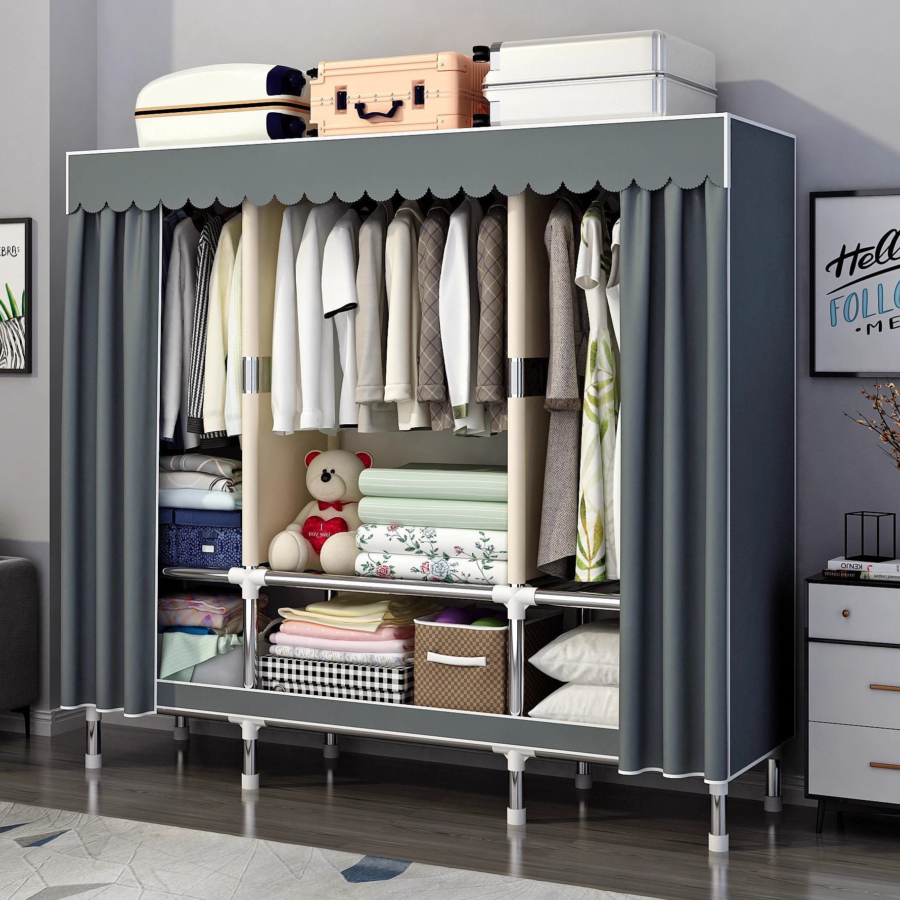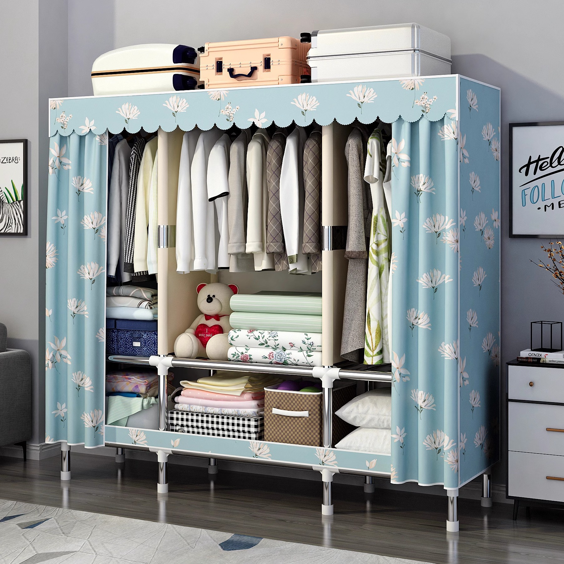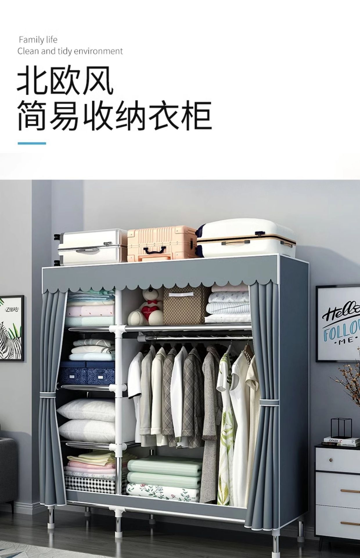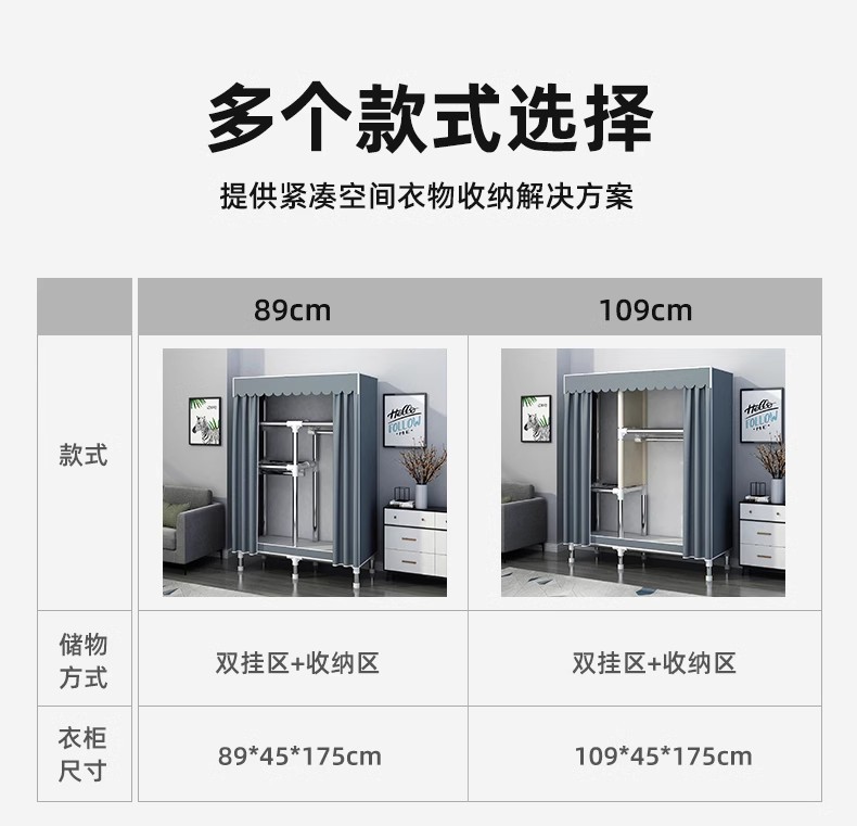 간단한 옷장 홈 침실 조립 천 옷장 강철 파이프 강력하고 내구성이 뛰어난 임대 주택 옷장 캐비닛 경제적스토어 가기