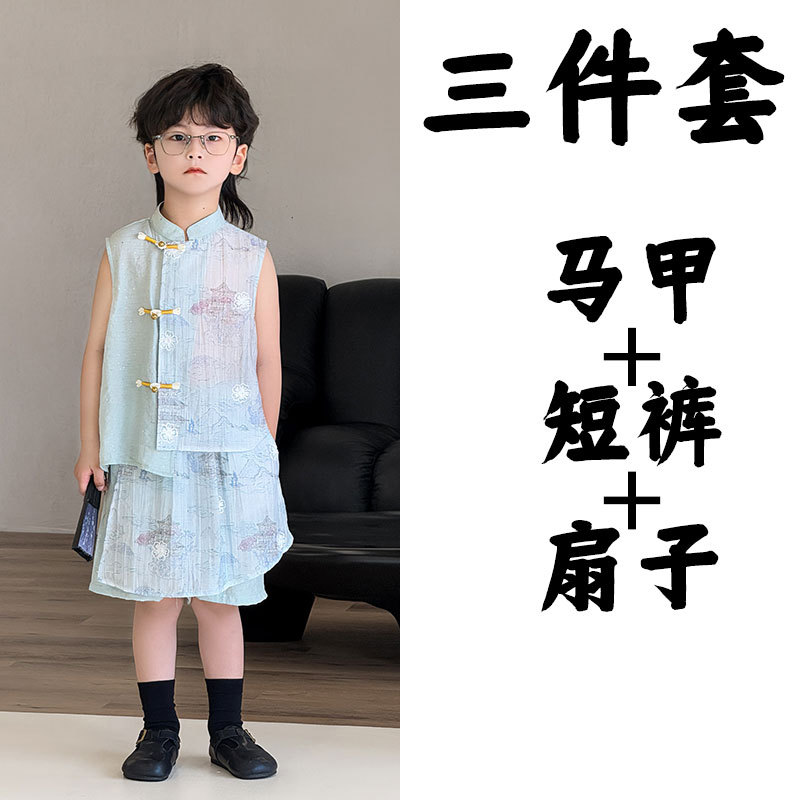 어린이 조끼 정장 반바지 2025 여름 새로운 새로운 중국 스타일 소년 민트 그린 Hanfu 잘 생긴 원피스 드롭 배송