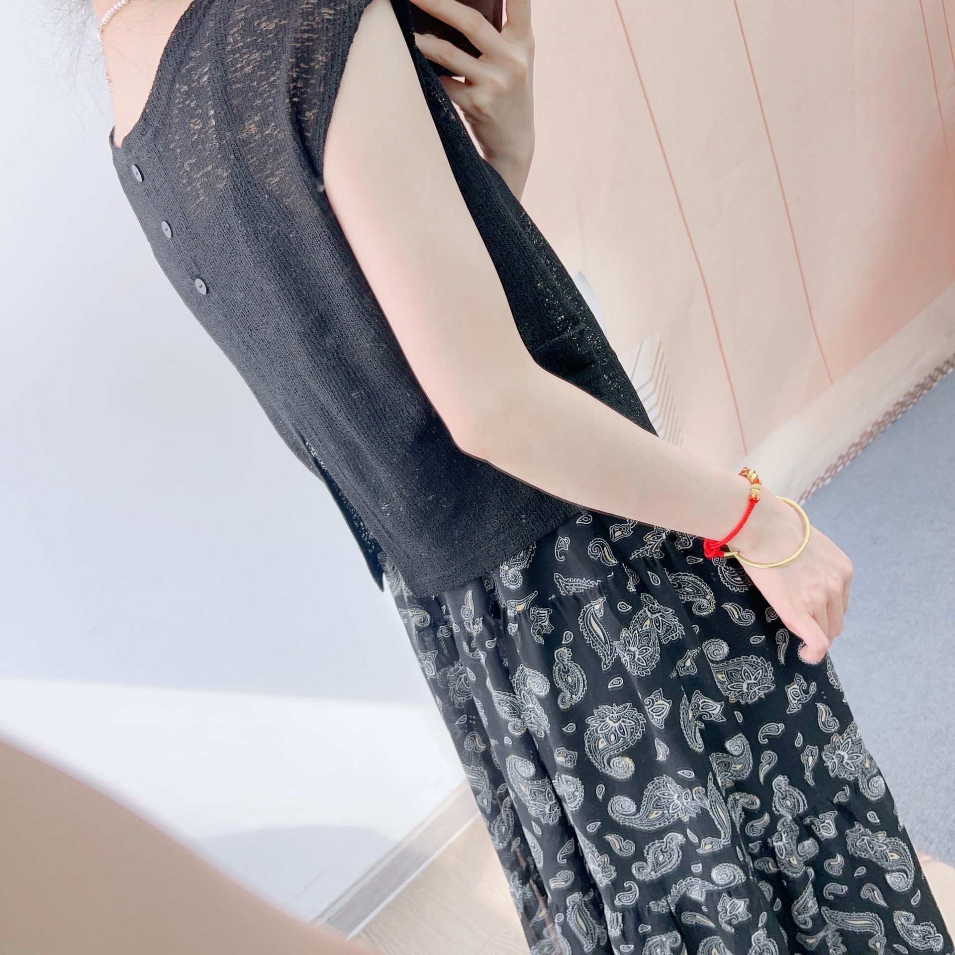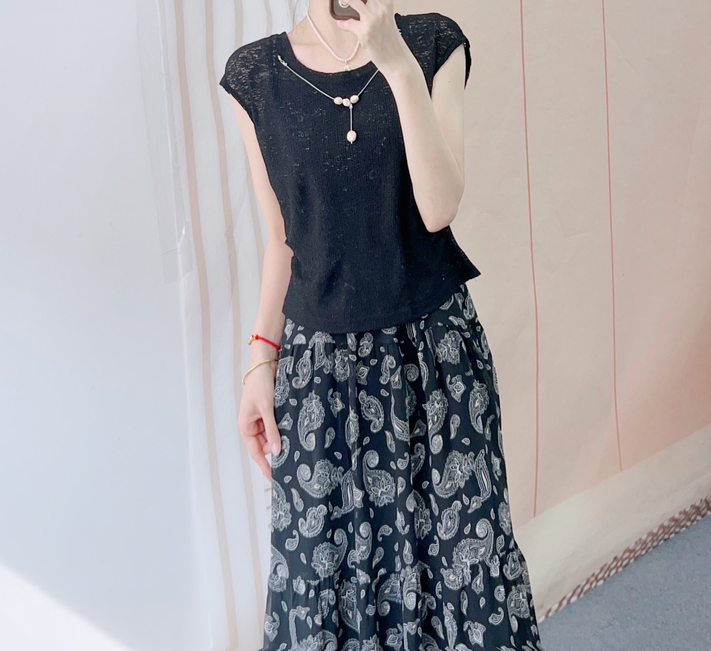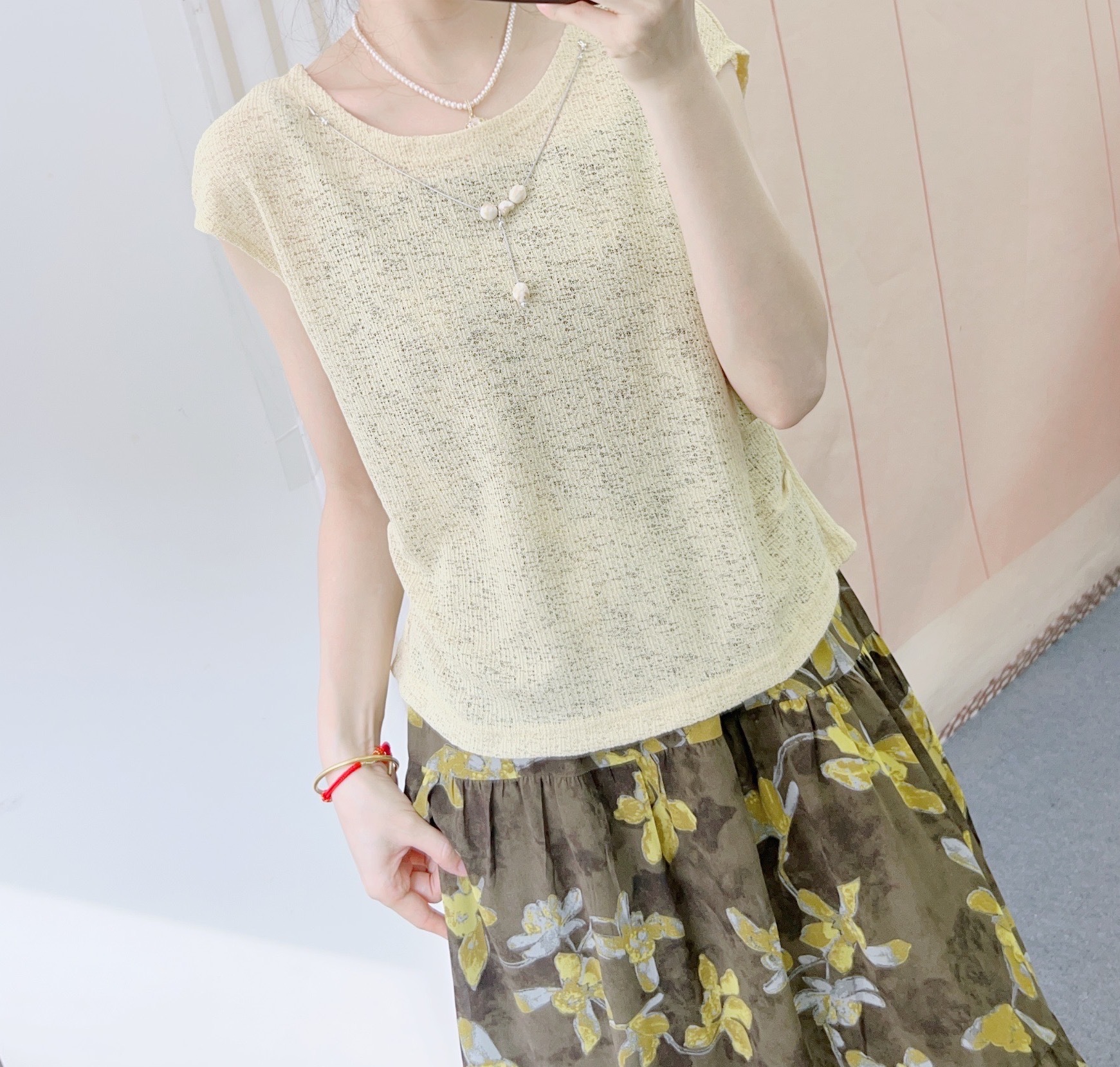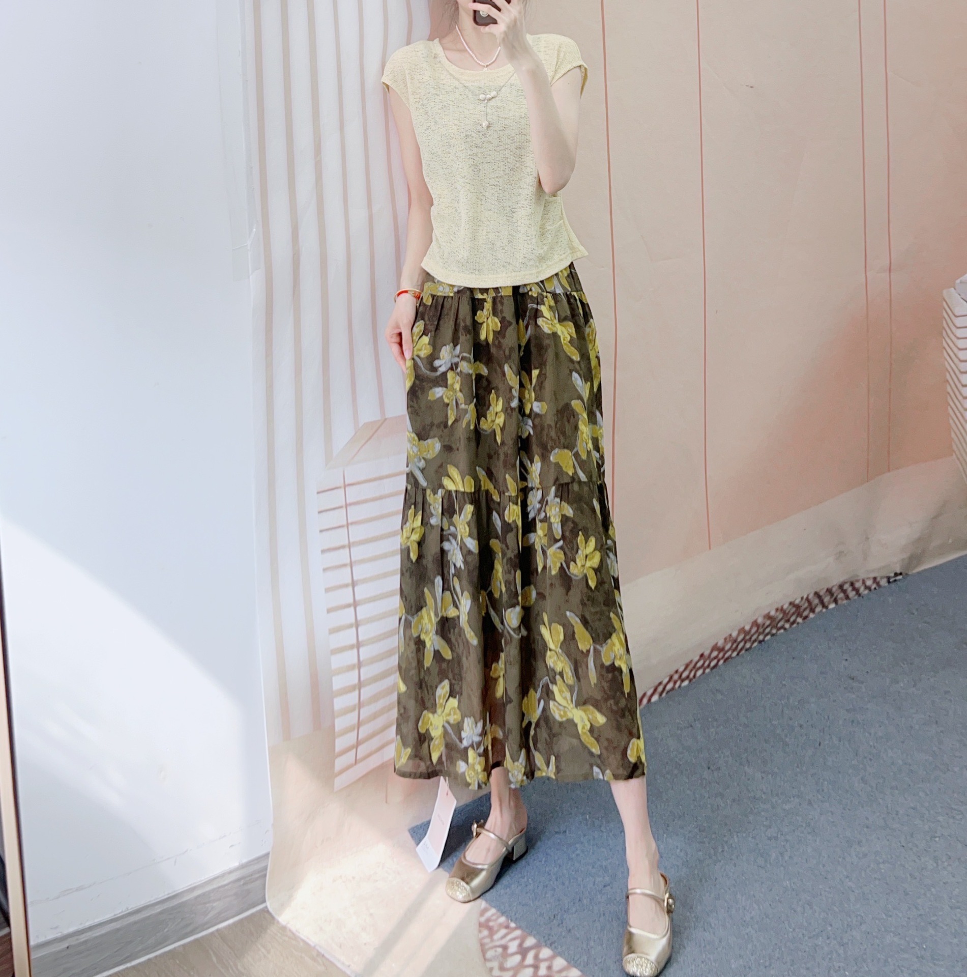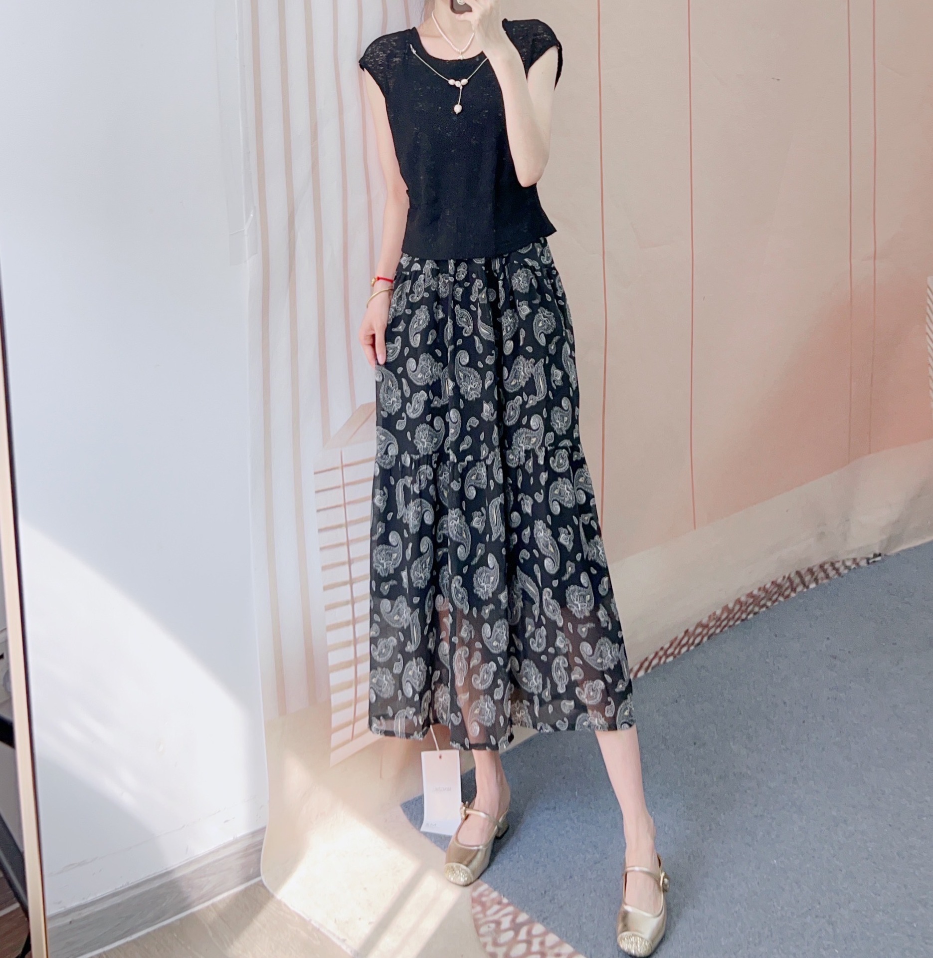 2025년 여름 신상 패셔너블 니트 블라우스 + 쉬폰 서스펜더 스커트 투피스 스커트 77스토어 가기