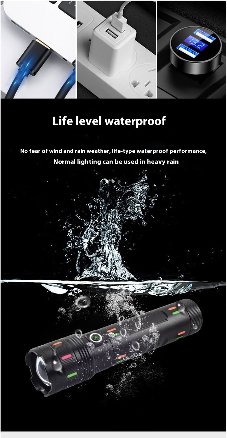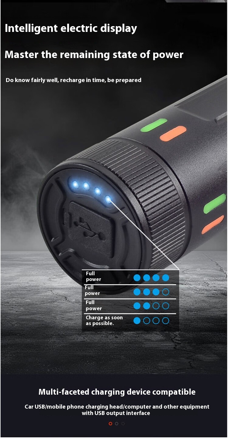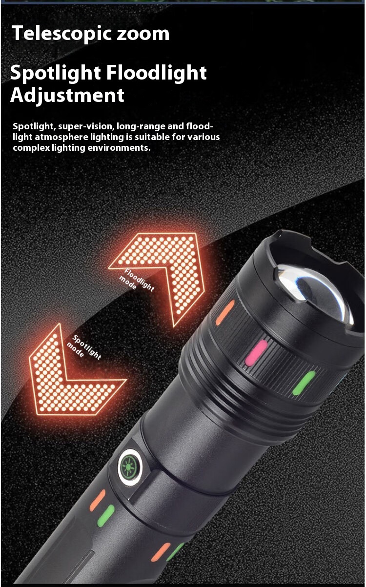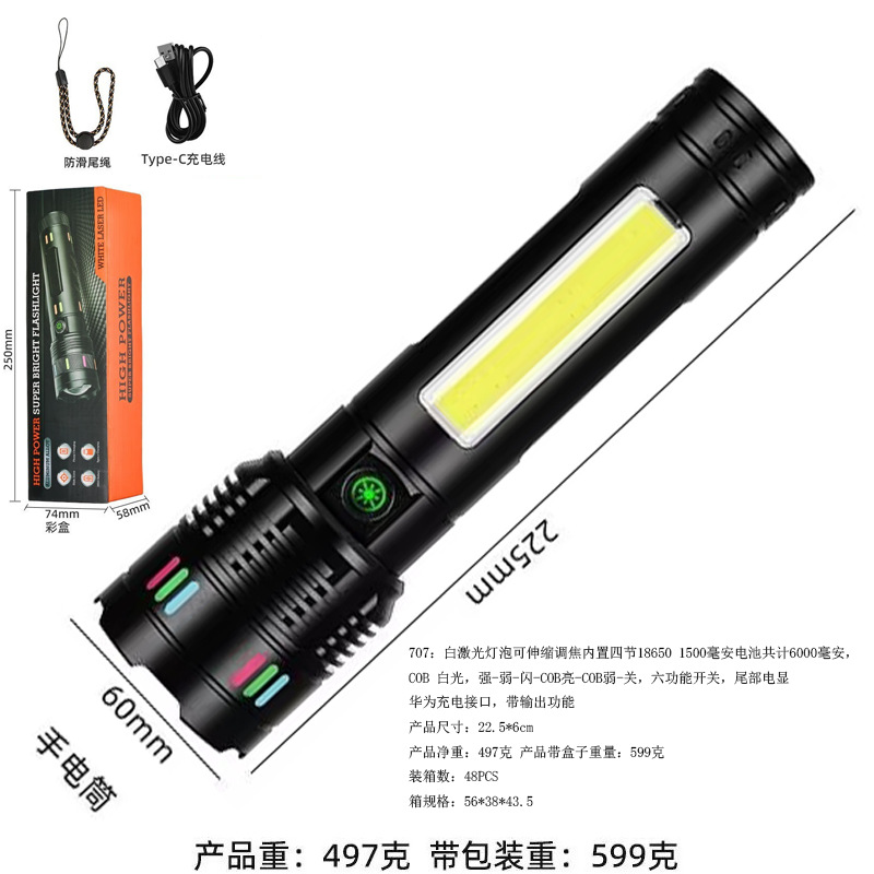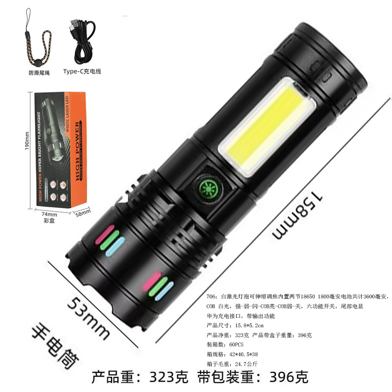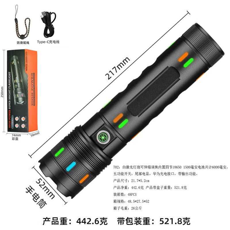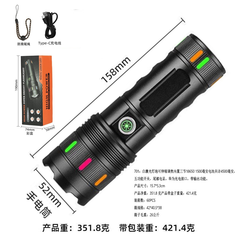 701:白激光灯泡可伸缩调焦内置三节18650 1500毫安电池共计4500毫安,五功能开关,尾部电显,华为充电接口,带输出功能。