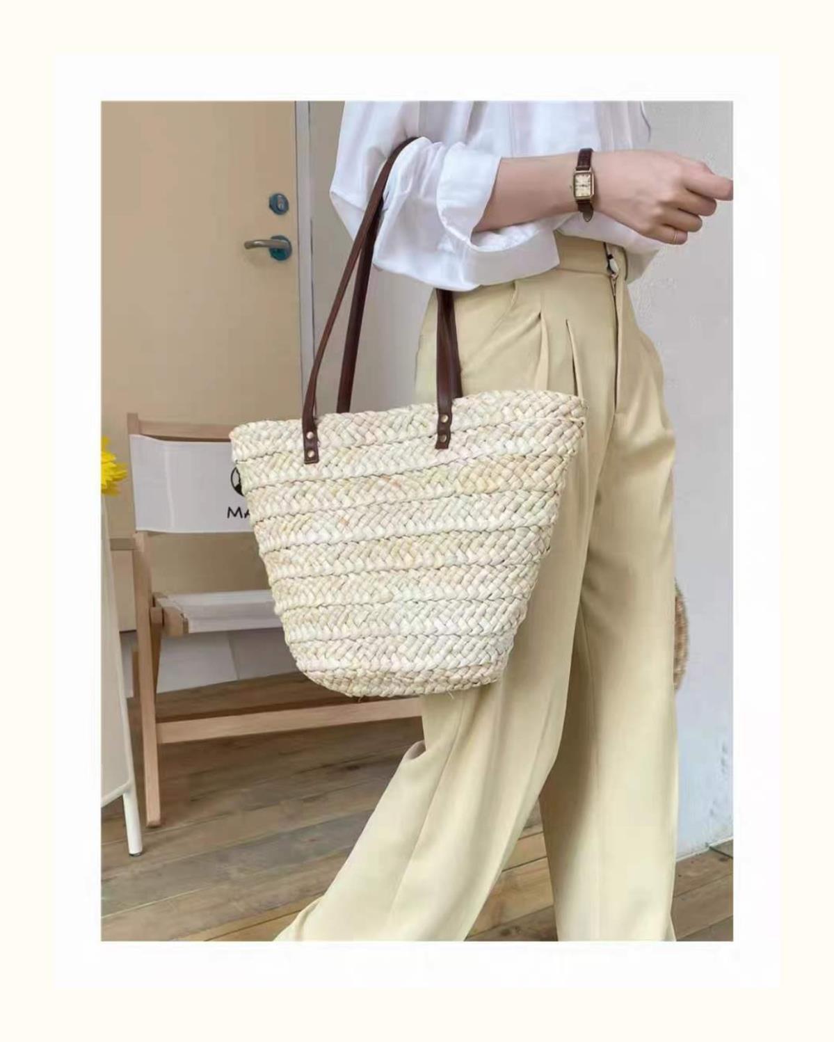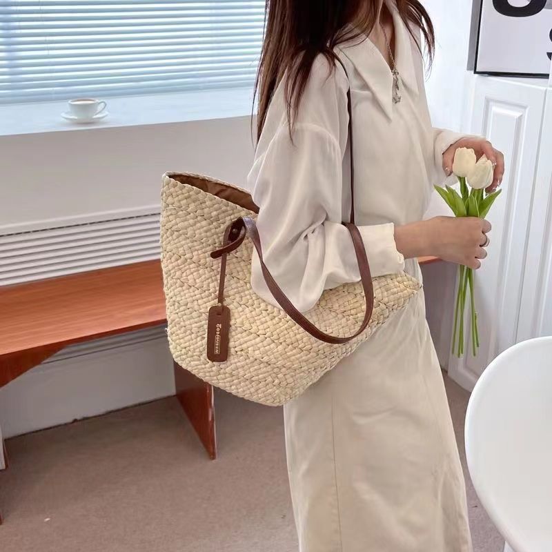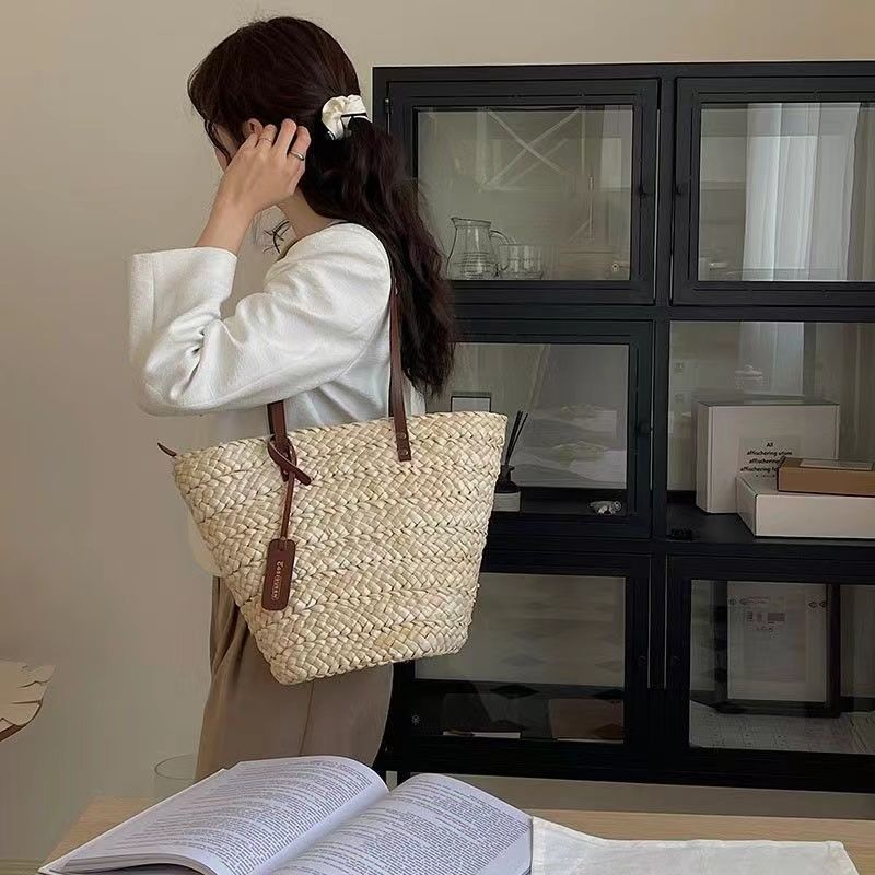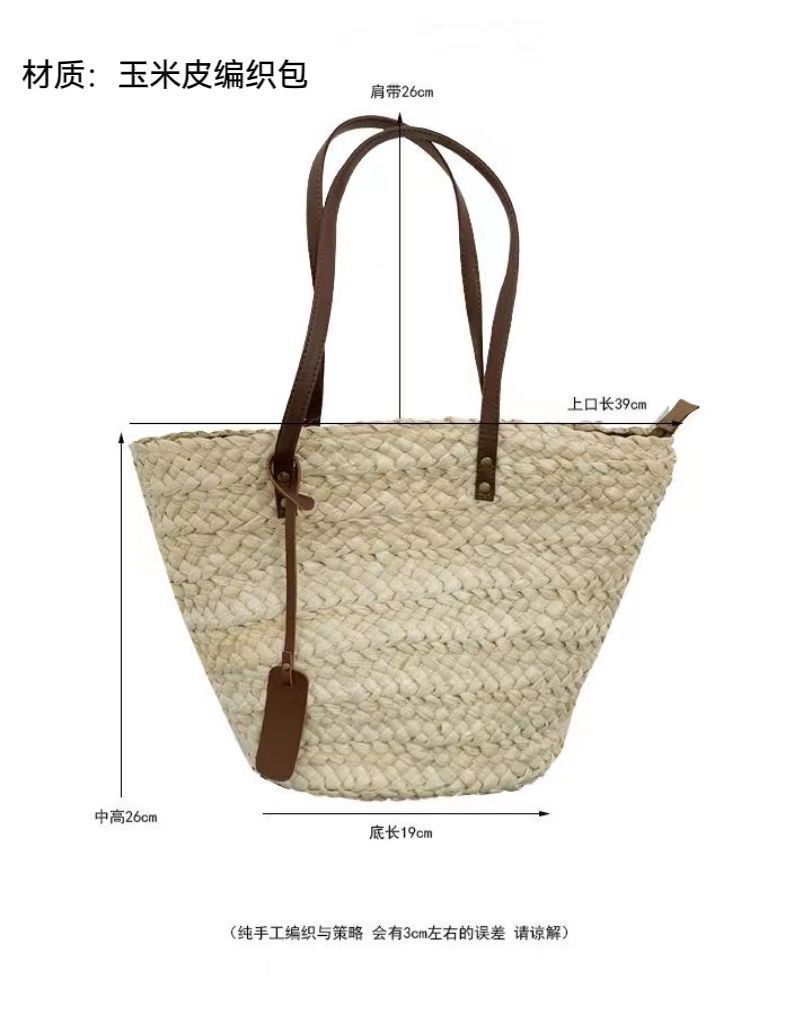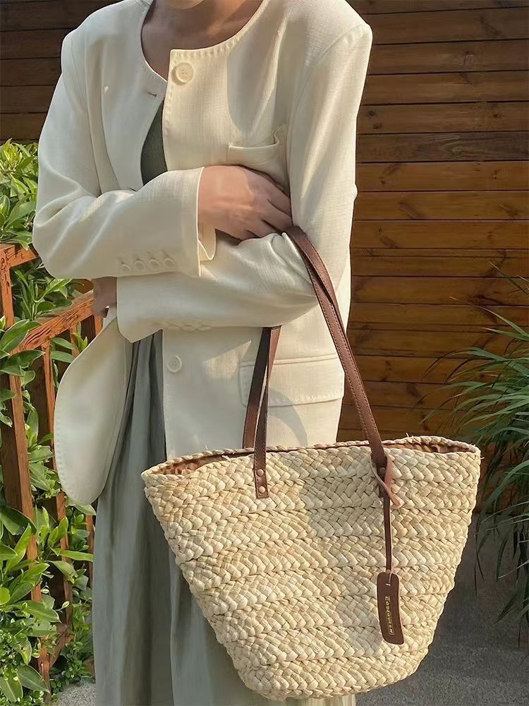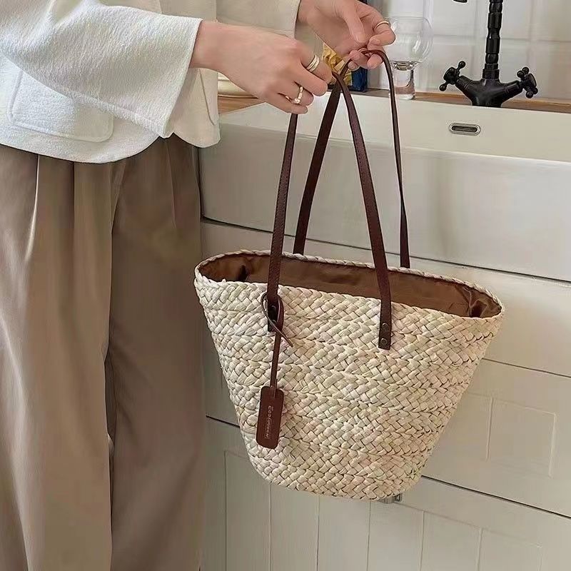 수제 프랑스어 원 숄더 대용량 옥수수 껍질 짠 휴대용 밀짚 가방 야채 바구니 휴가 해변 가방 여성 복고풍