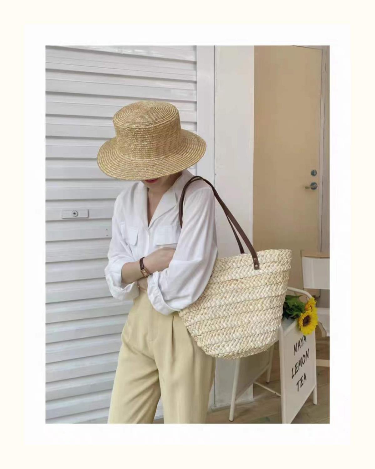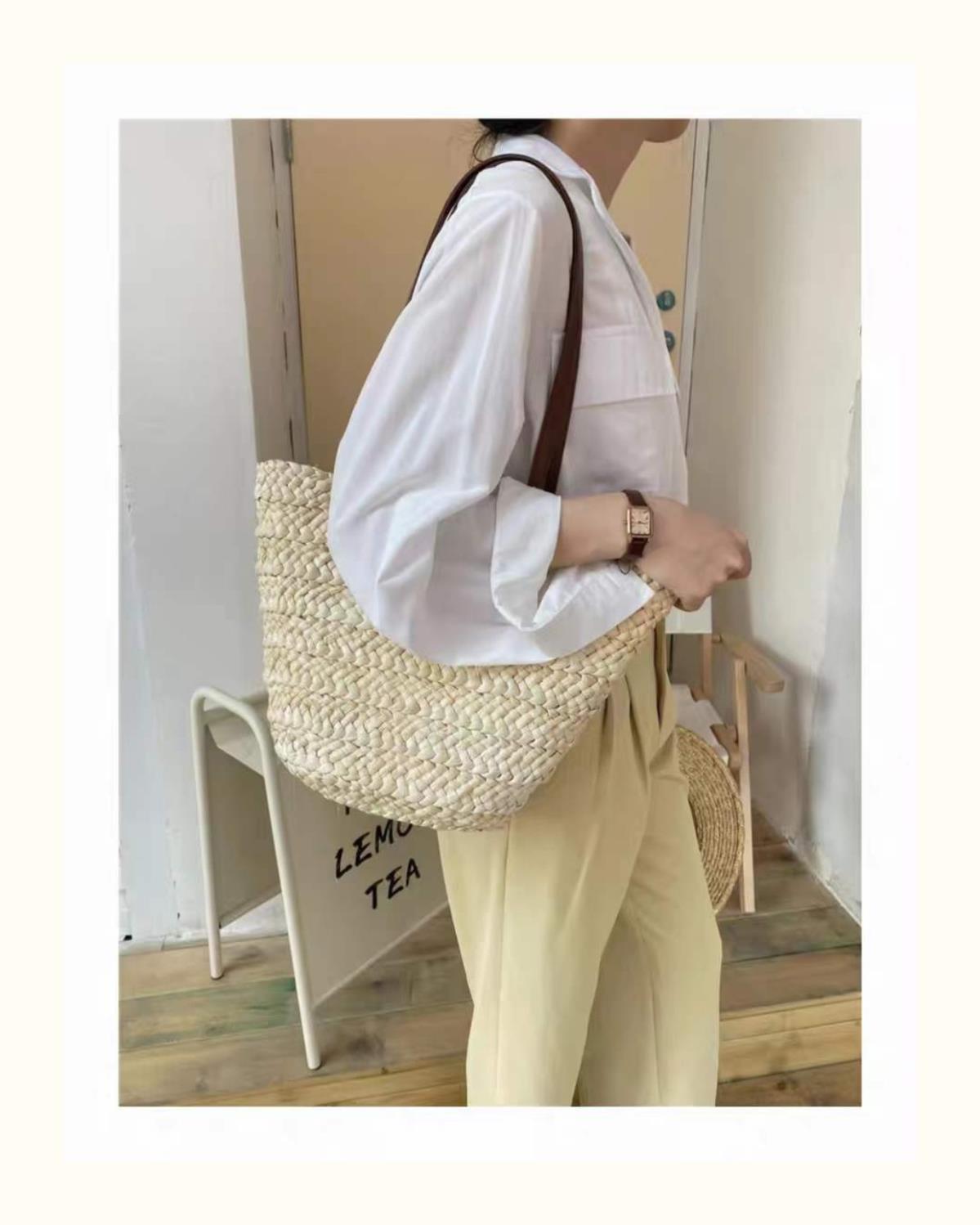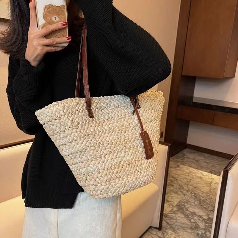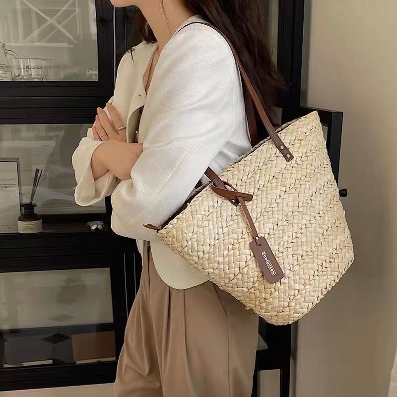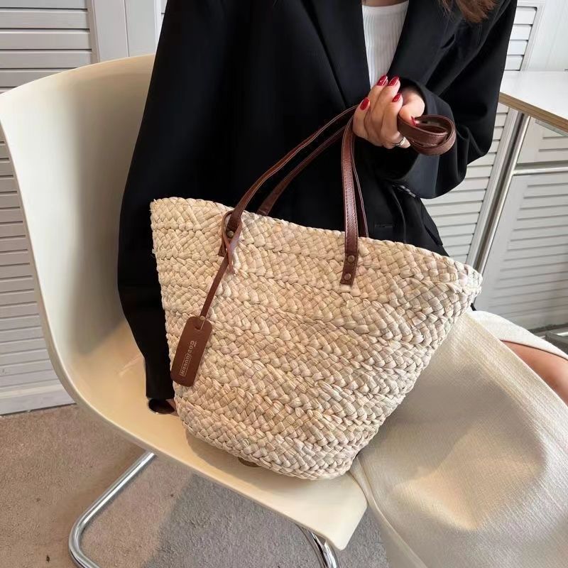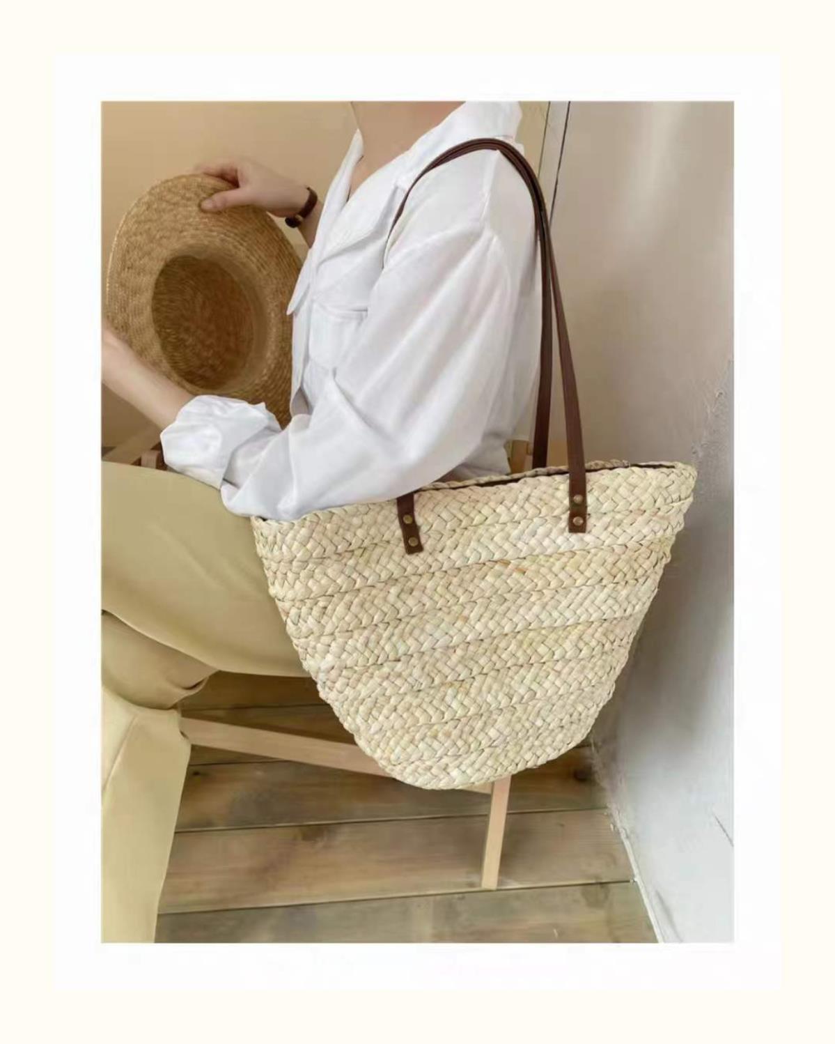 수제 프랑스어 원 숄더 대용량 옥수수 껍질 짠 휴대용 밀짚 가방 야채 바구니 휴가 해변 가방 여성 복고풍