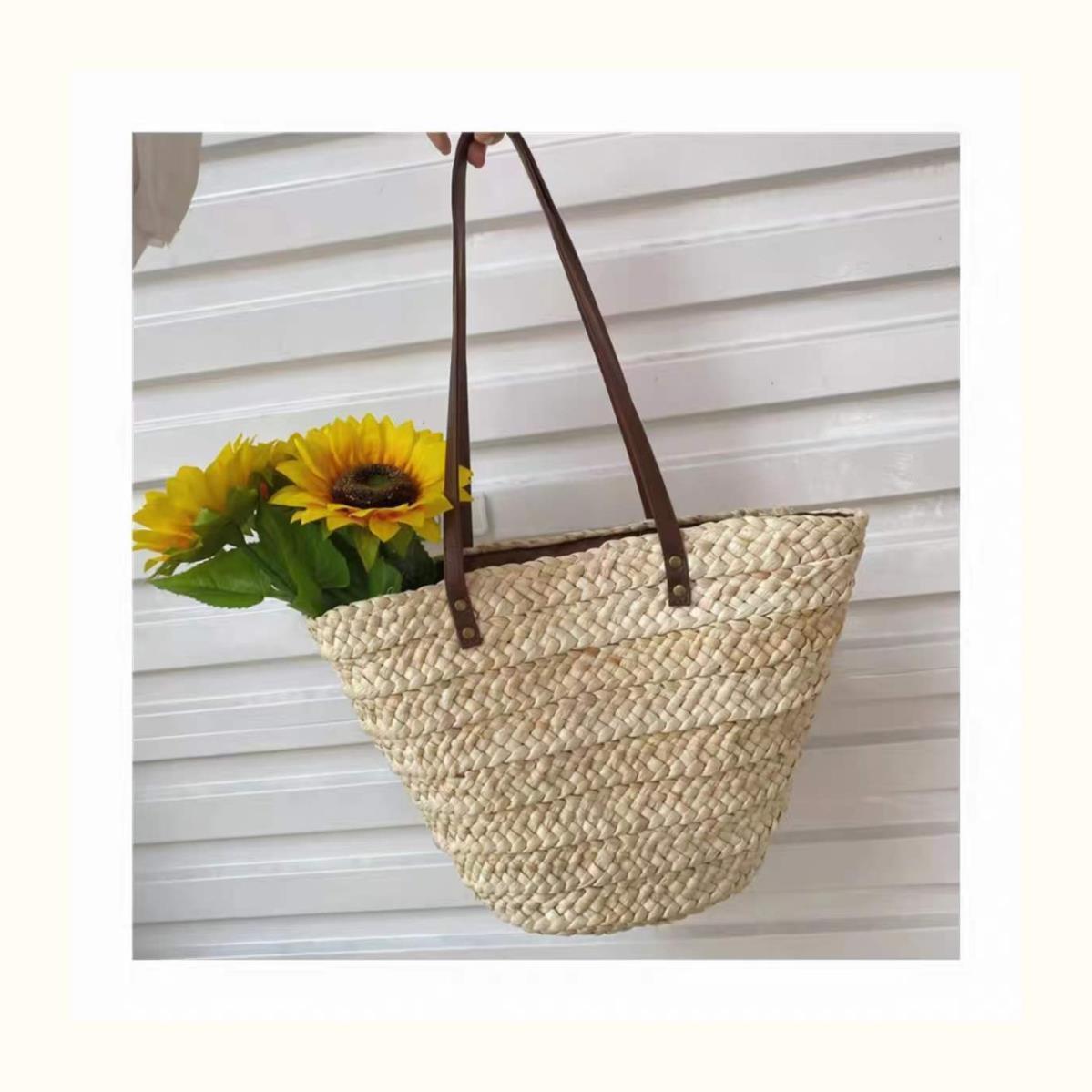 수제 프랑스어 원 숄더 대용량 옥수수 껍질 짠 휴대용 밀짚 가방 야채 바구니 휴가 해변 가방 여성 복고풍스토어 가기