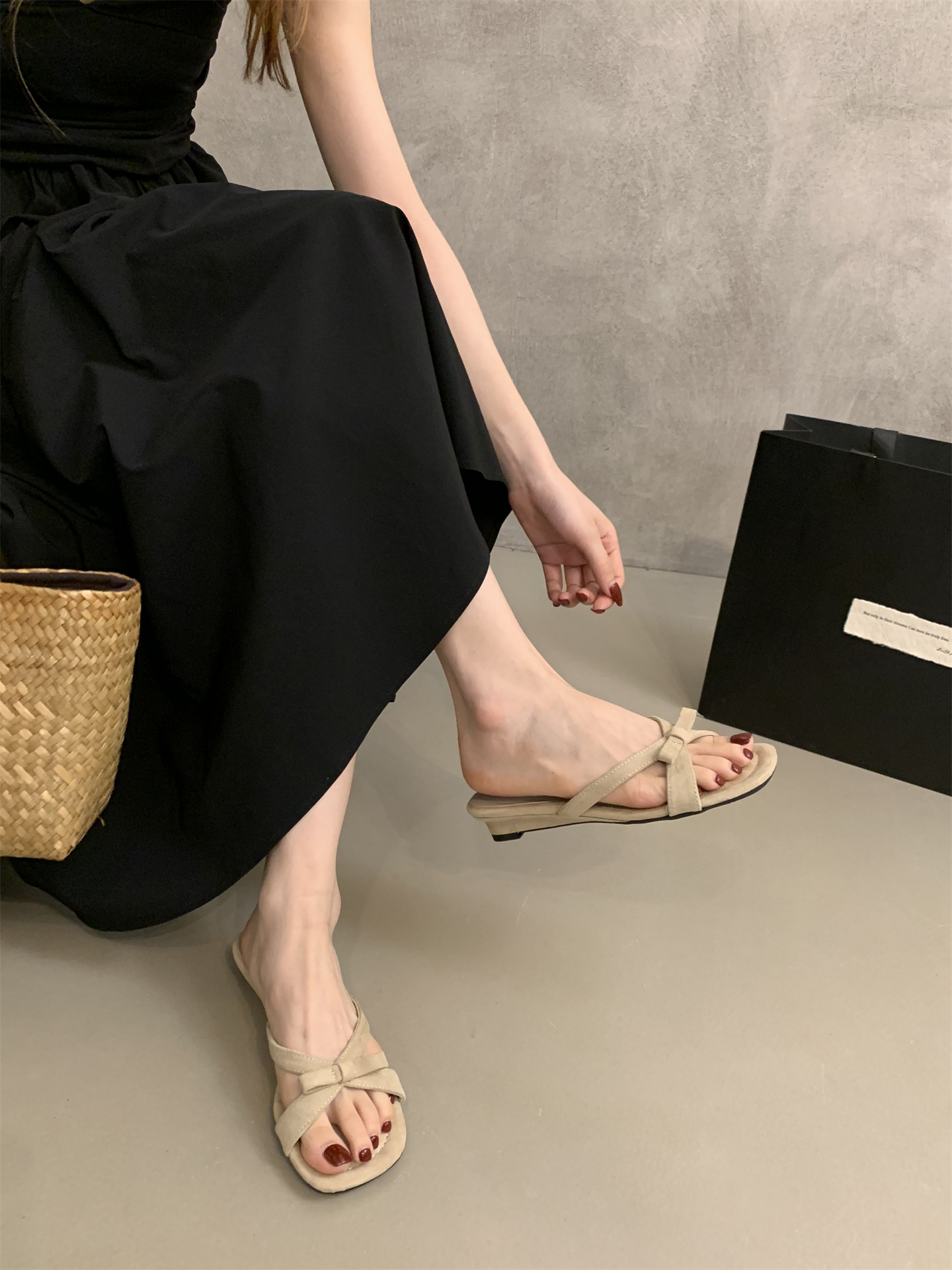여름에 스커트를 입은 여성을 위한 프렌치 스타일의 아름다운 리본 오픈 토 샌들, 여성용 야외 착용을 위한 요정 스타일 스퀘어 토 웨지 샌들스토어 가기